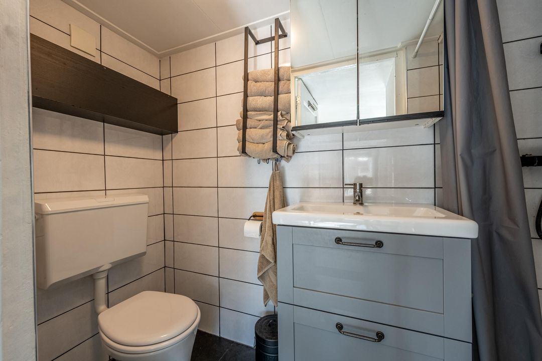 De badkamer is modern uitgevoerd met een wastafelmeubel, spiegelkast, regendouche en toilet. De combinatie van zwarte vloertegels en witte wandtegels geeft de ruimte een frisse, tijdloze uitstraling. Mechanische ventilatie is aanwezig.