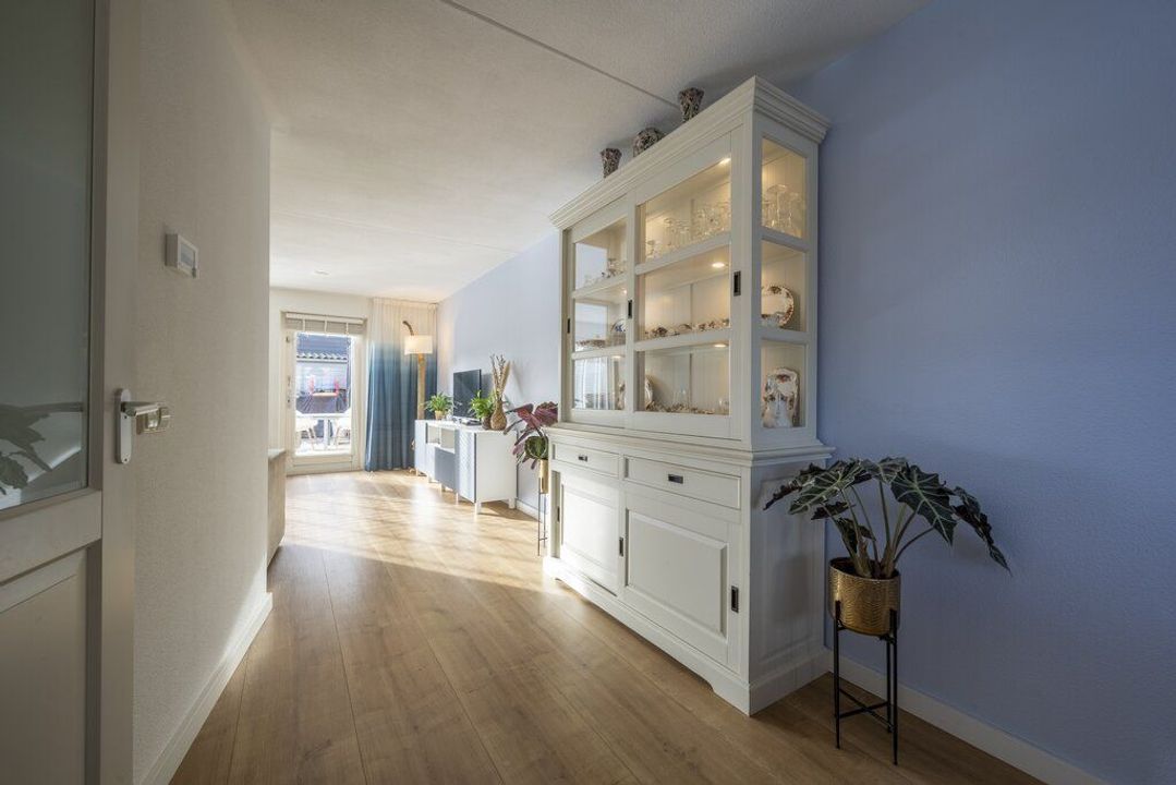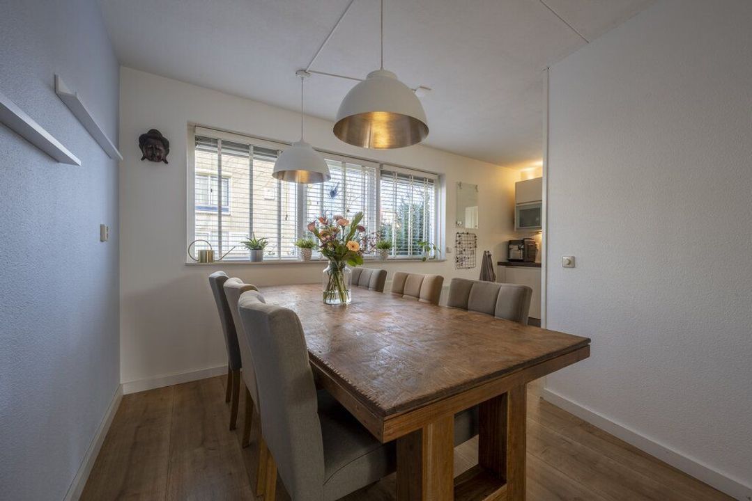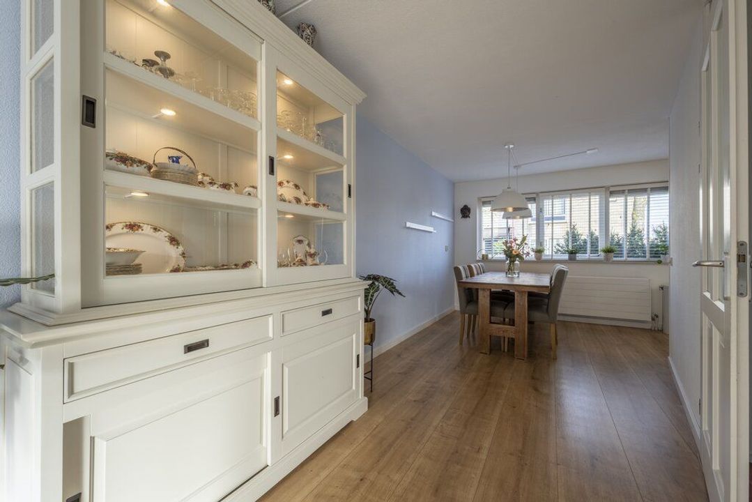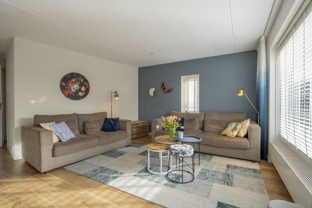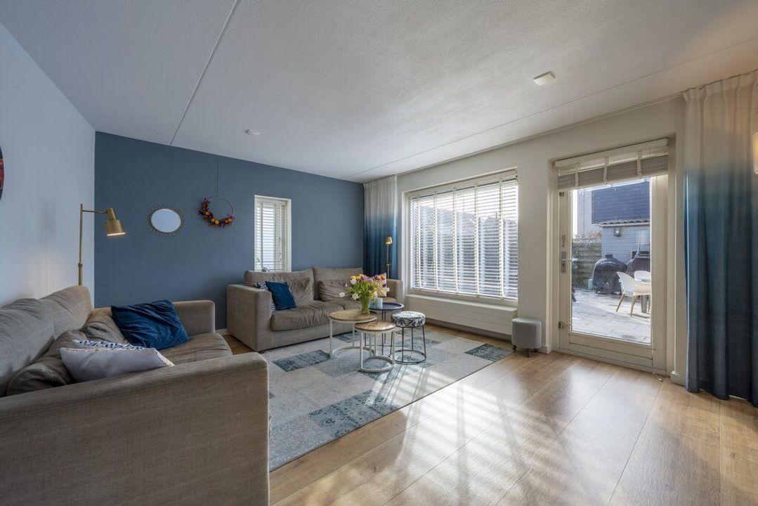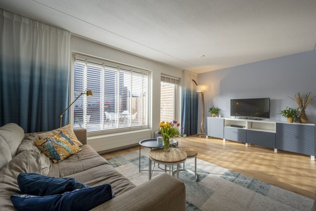 De L-vormige woonkamer is ruim van opzet en heeft veel lichtinval door de grote raampartijen. Er is een loopdeur naar de achtertuin.