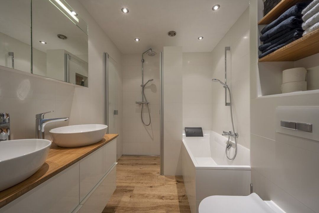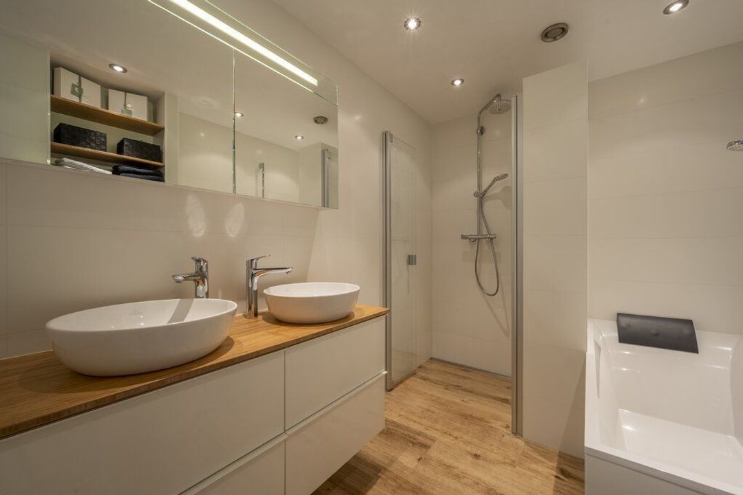 Moderne en nette badkamer, aangelegd in juni 2016, afgewerkt in een lichte kleurstelling met witte wandtegels en keramische houtlook vloertegels. Voor extra comfort zijn de vloertegels voorzien van elektrische vloerverwarming. Er is een ligbad met hoofdsteun, ruime inloopdouche met regendouche en handdouche, dubbel wastafelmeubel, lichtspotjes en een toilet.