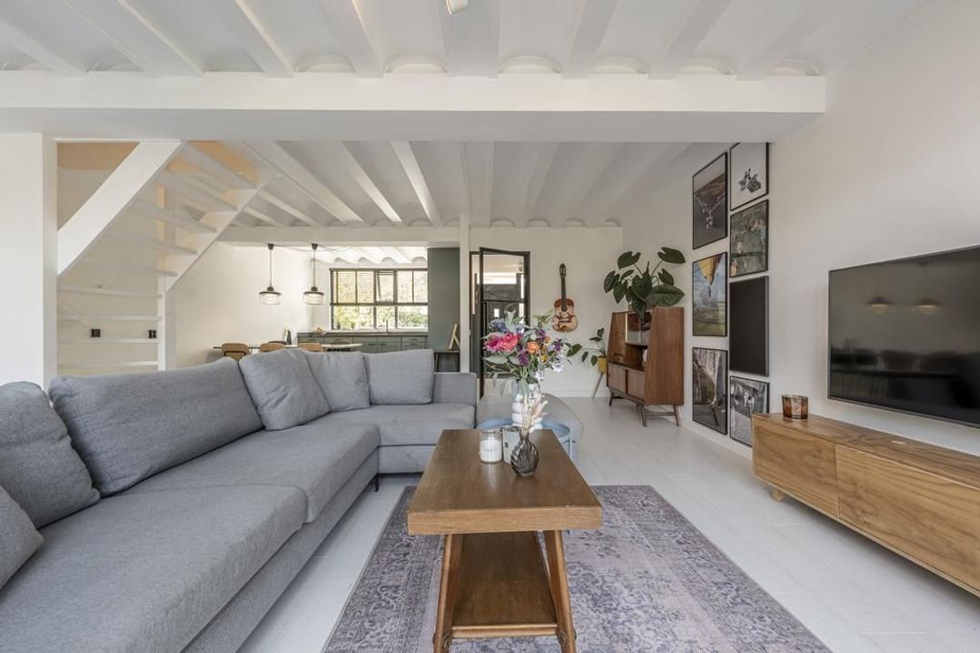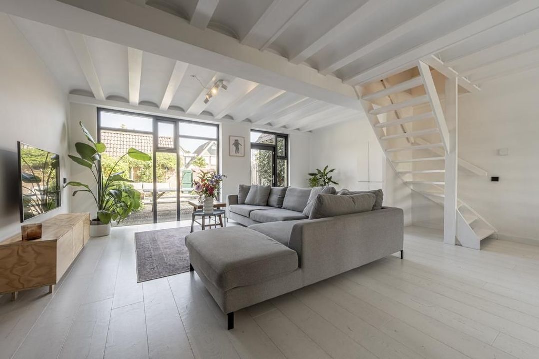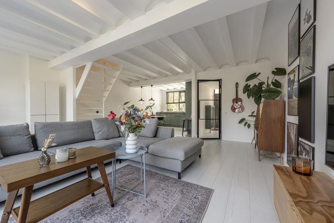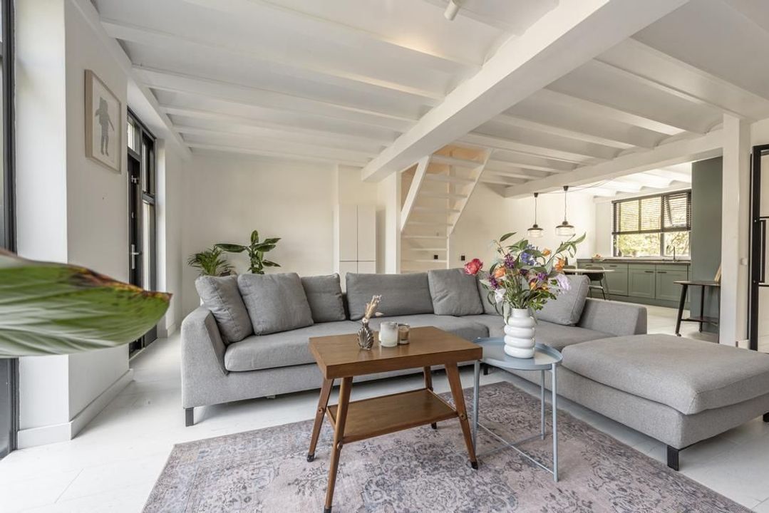 De tuingerichte woonkamer met een trendy stalen deur, verrast met een overvloed aan natuurlijk licht en ruimtelijkheid. De woonkamer is in 2021 gerenoveerd zo zijn de wanden gestuukt en is alles geverfd. Het sfeervolle broodjesplafond voegt extra charme toe aan de living, terwijl de ramen van plafond tot vloer een fijne connectie met buiten creëren. De woonkamer is slim verdeeld in een gezellige zithoek en een praktische eethoek aan de voorzijde, wat resulteert in een gastvrije en doelmatige leefruimte. Via een trap is er vanuit de woonkamer de tweede verdieping te bereiken.