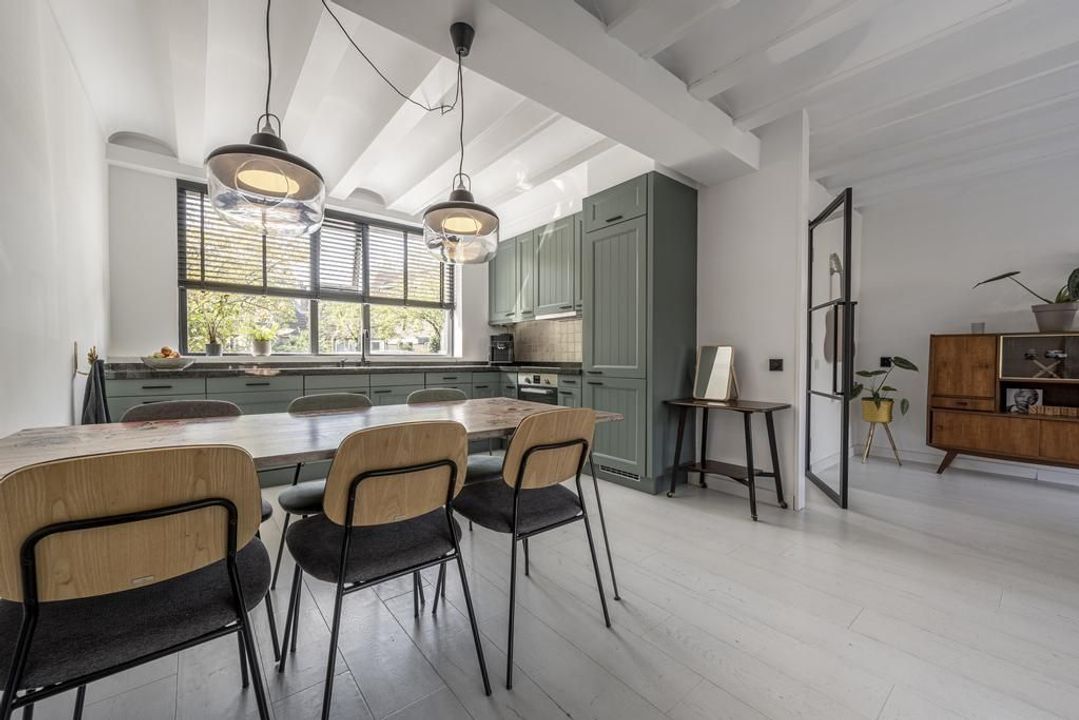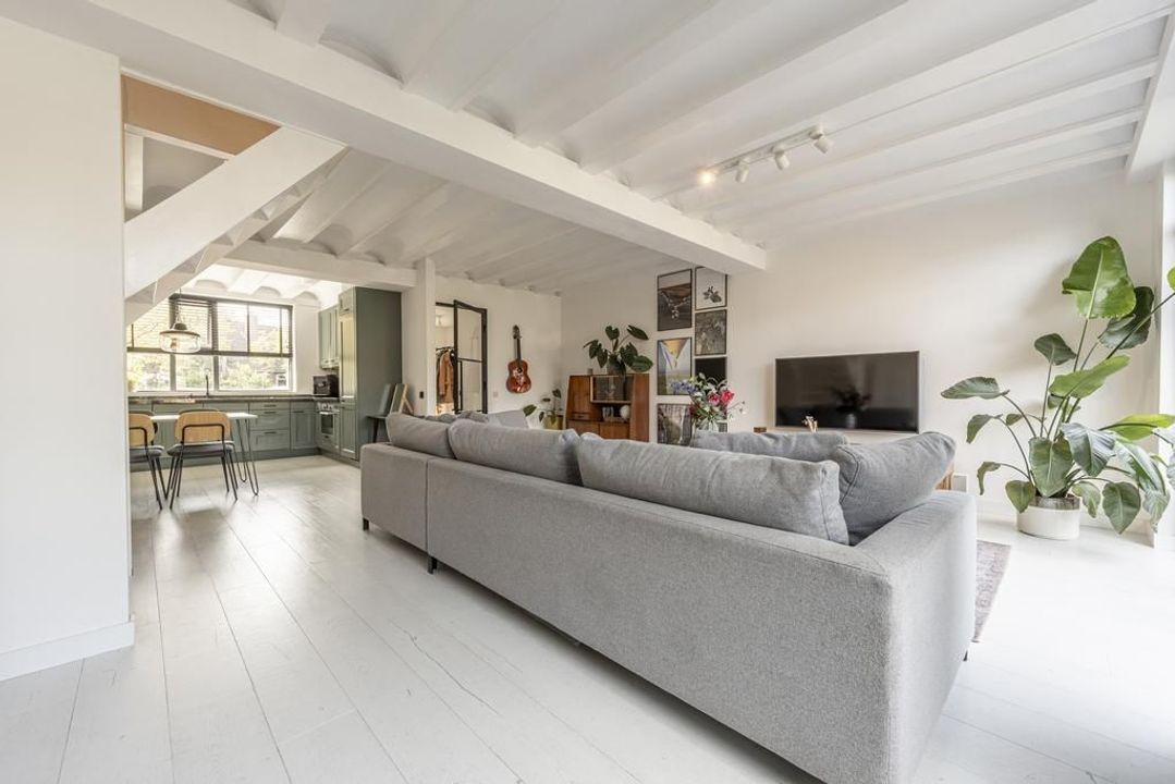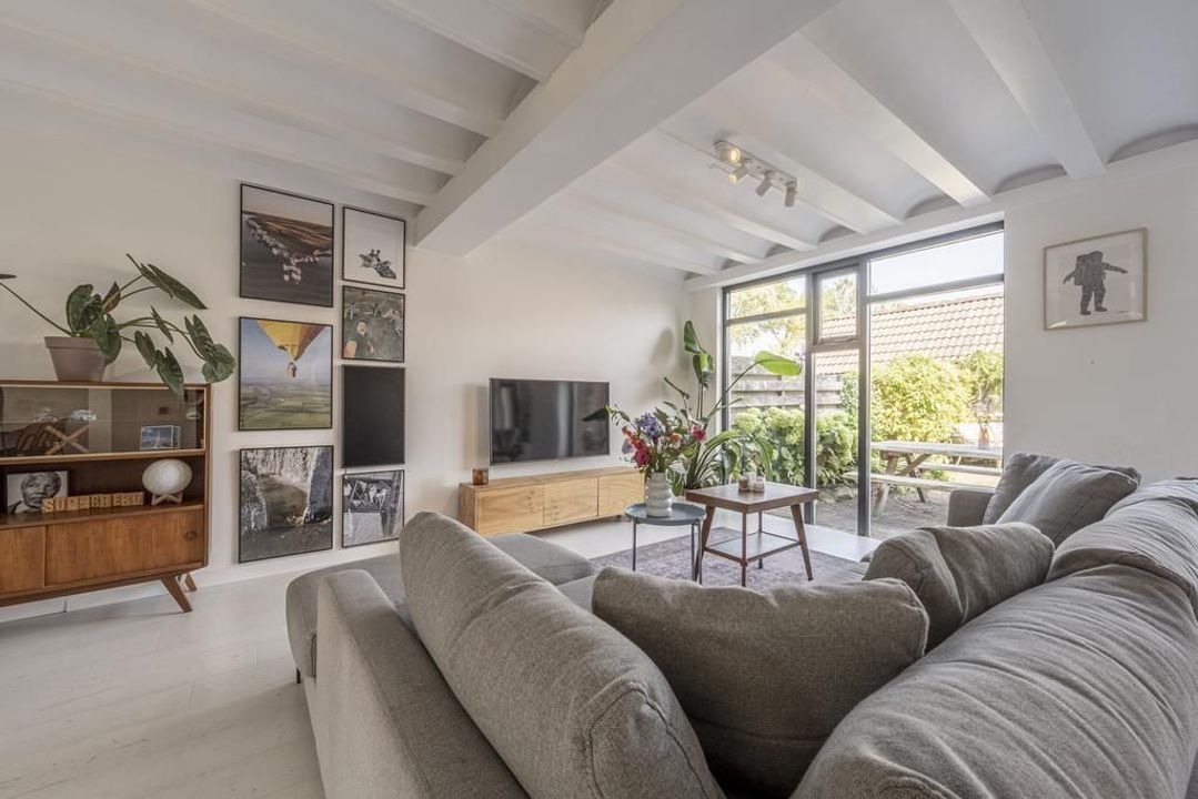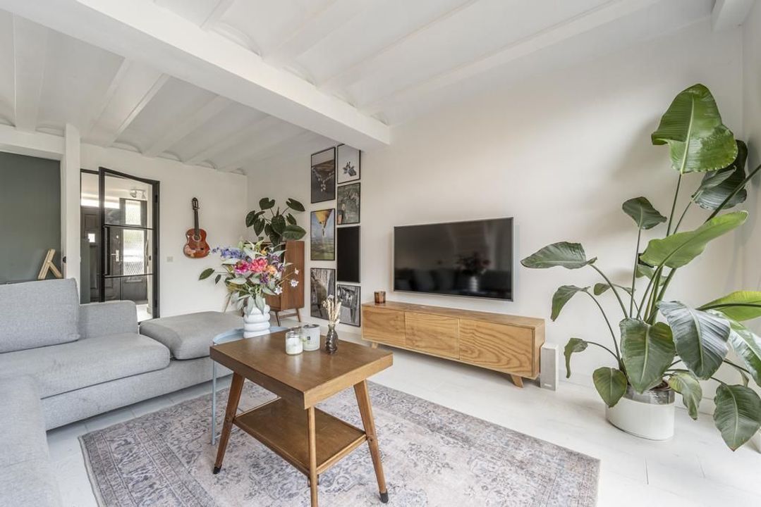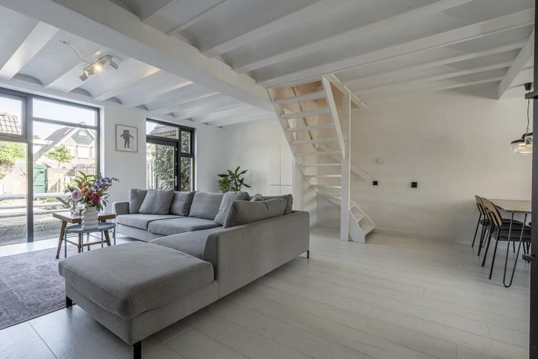De tuingerichte woonkamer met een trendy stalen deur, verrast met een overvloed aan natuurlijk licht en ruimtelijkheid. De woonkamer is in 2021 gerenoveerd zo zijn de wanden gestuukt en is alles geverfd. Het sfeervolle broodjesplafond voegt extra charme toe aan de living, terwijl de ramen van plafond tot vloer een fijne connectie met buiten creëren. De woonkamer is slim verdeeld in een gezellige zithoek en een praktische eethoek aan de voorzijde, wat resulteert in een gastvrije en doelmatige leefruimte. Via een trap is er vanuit de woonkamer de tweede verdieping te bereiken.