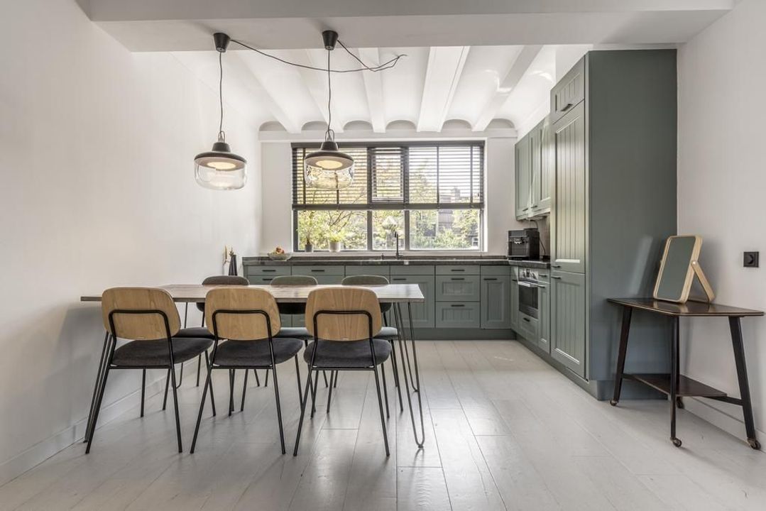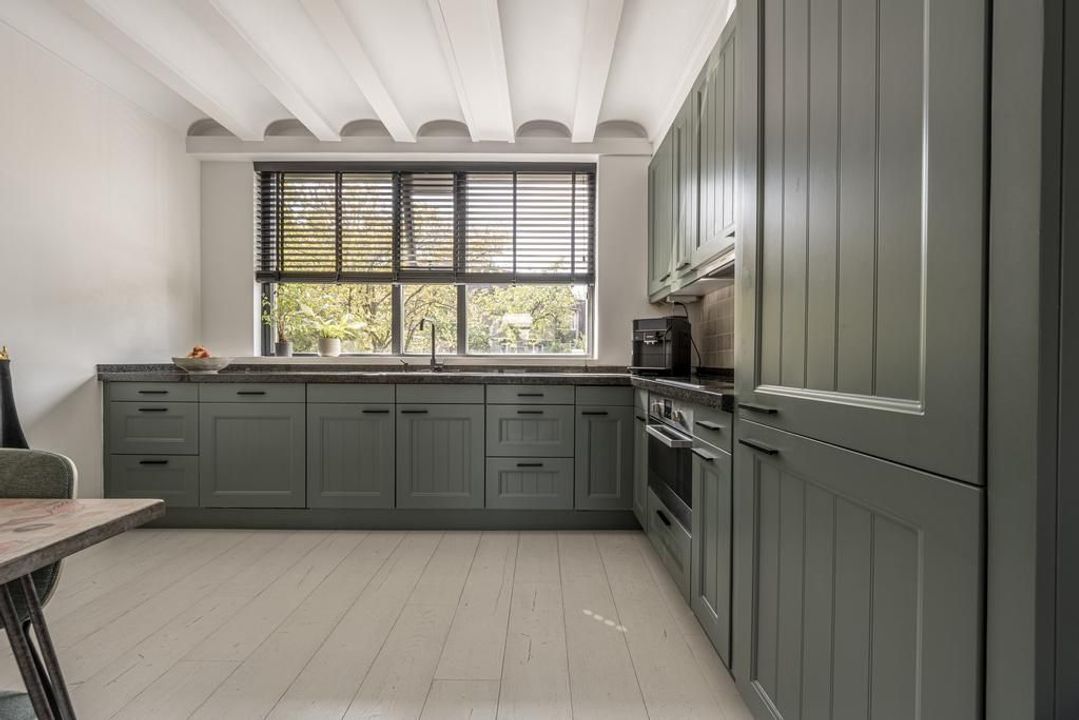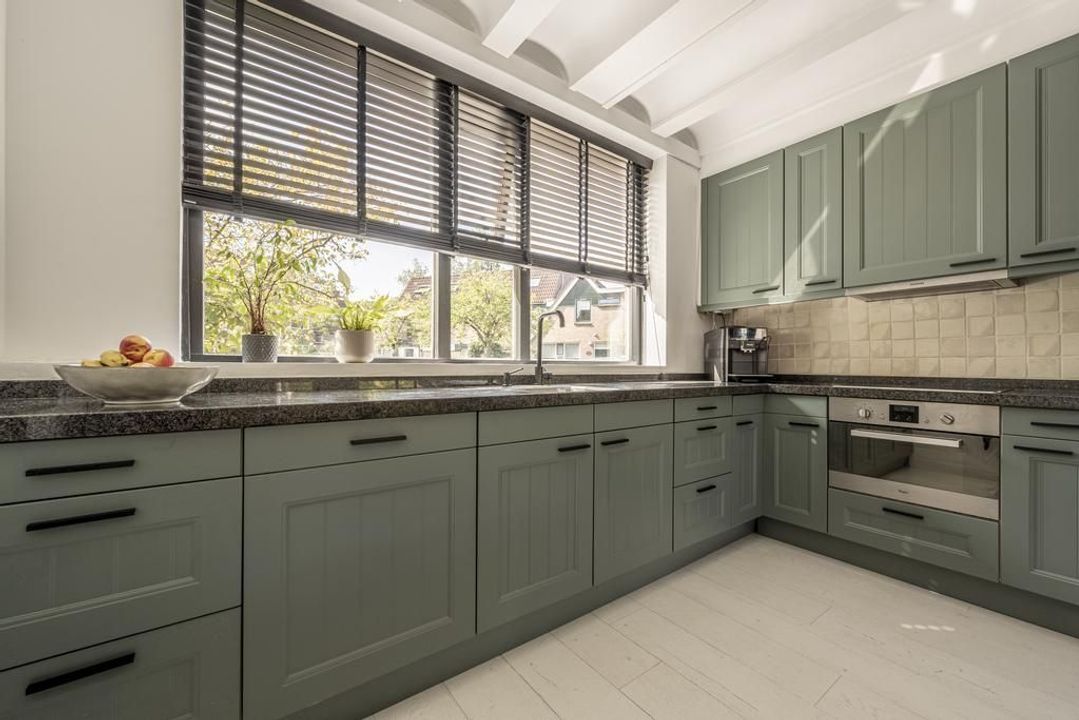 De keuken, die zich in een open L-vormige opstelling bevindt, is uitgerust met diverse inbouwapparatuur zoals; een keramische kookplaat met bijbehorende afzuigkap, een koel-vriescombinatie, een vaatwasser en een combimagnetron. Het geheel wordt verfraaid door een granieten werkblad en trendy lichtgroene keukenkasten, waardoor de keuken een eigentijdse en complete uitstraling heeft.