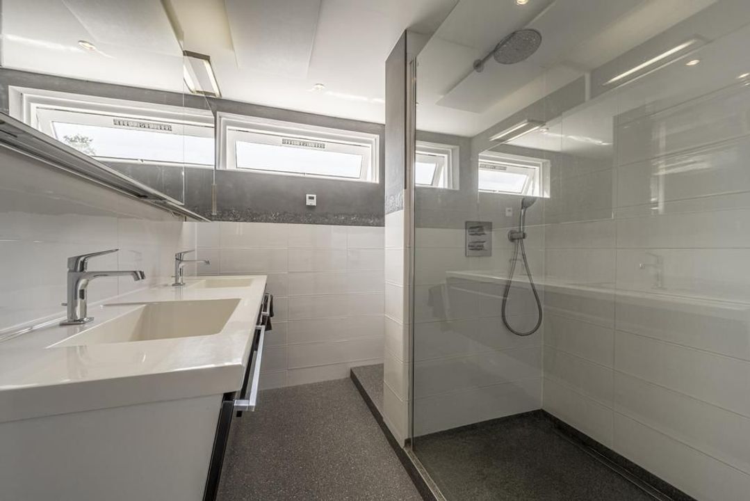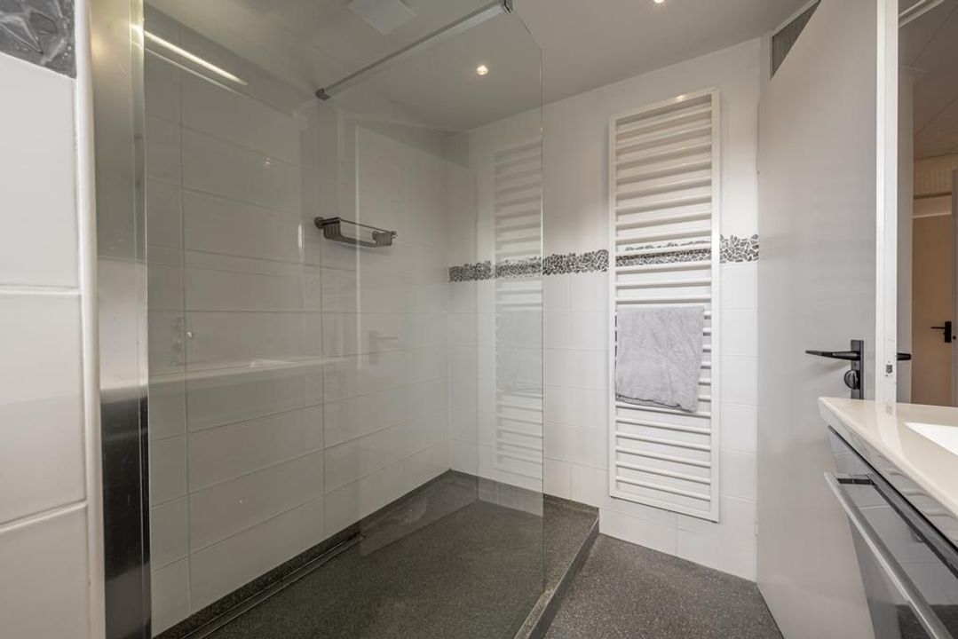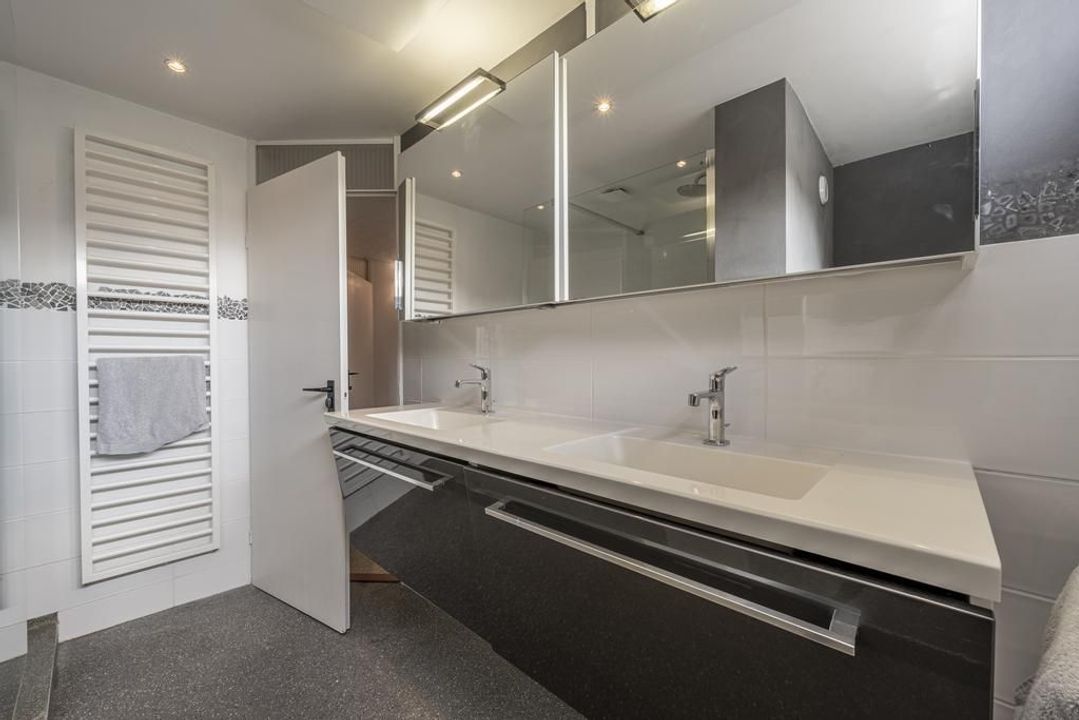 De badkamer is uitgevoerd in een combinatie van witte en grijze vloer- en wandtegels. Hij beschikt over een dubbel wastafelmeubel, een inloopdouche met zowel een regendouche als een handdouche, een toilet, een designradiator en mechanische ventilatie. Sfeervolle lichtspots maken de badkamer helemaal compleet.