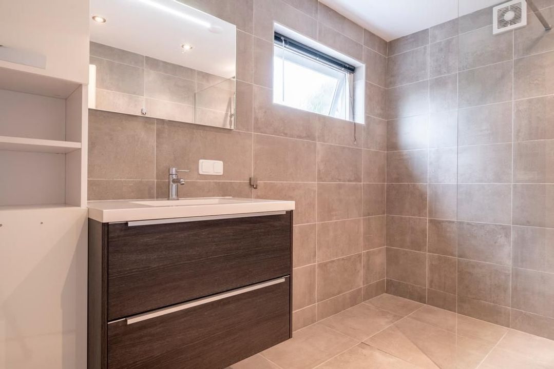 De badkamer (2019) is helemaal van deze tijd door het gebruik van materialen en kleurstelling. Zo zijn er grote grijze vloertegels gecombineerd met grote wandtegels. Er is een ruime inloopdouche met zowel regen- als handdouche, wastafelmeubel en een designradiator. Het leefgedeelte wordt binnengegaan in de keuken en deze is van diverse inbouwapparatuur voorzien, zoals een 5 pits gasfornuis met afzuigkap, koelkast, combimagnetron, close-in boiler en een vaatwasser. Het hardstenen werkblad en de houtlook/crème kleurige keukenkasten maken de keuken af.