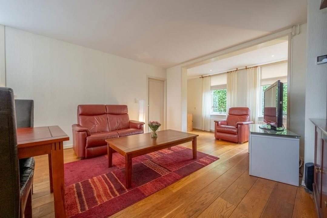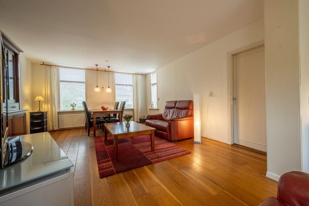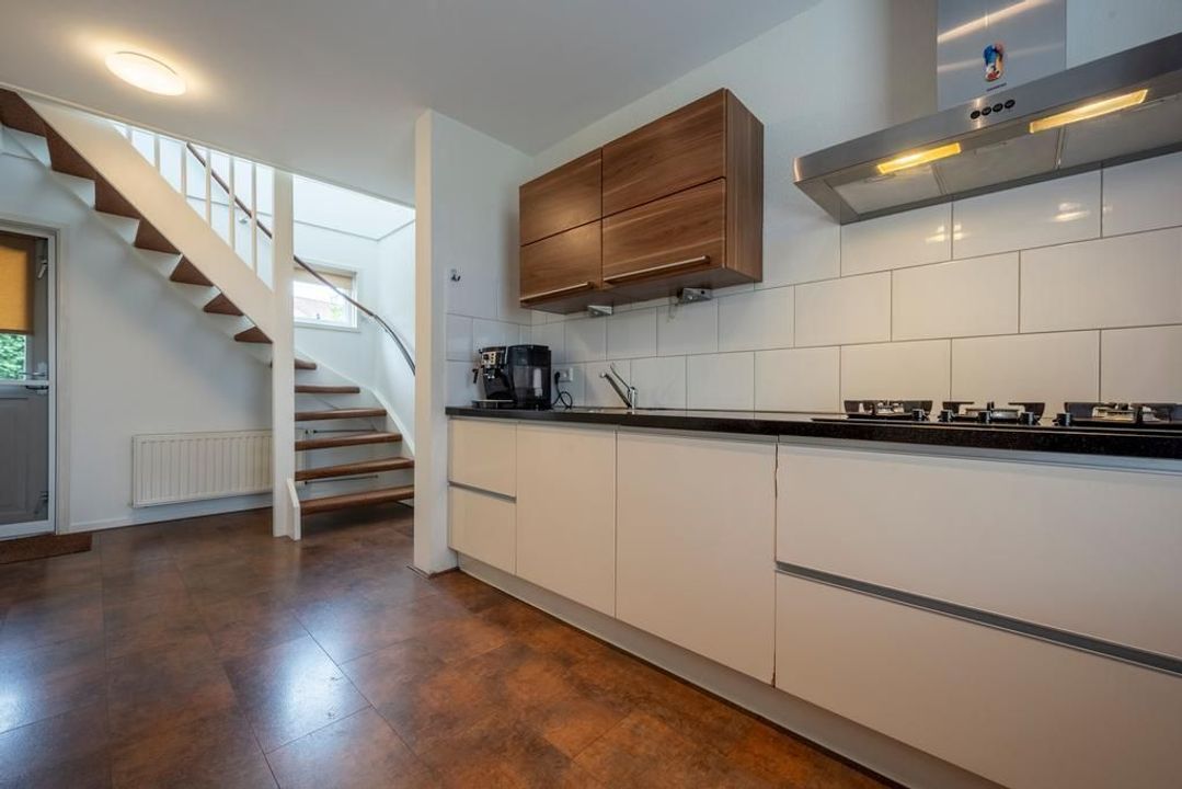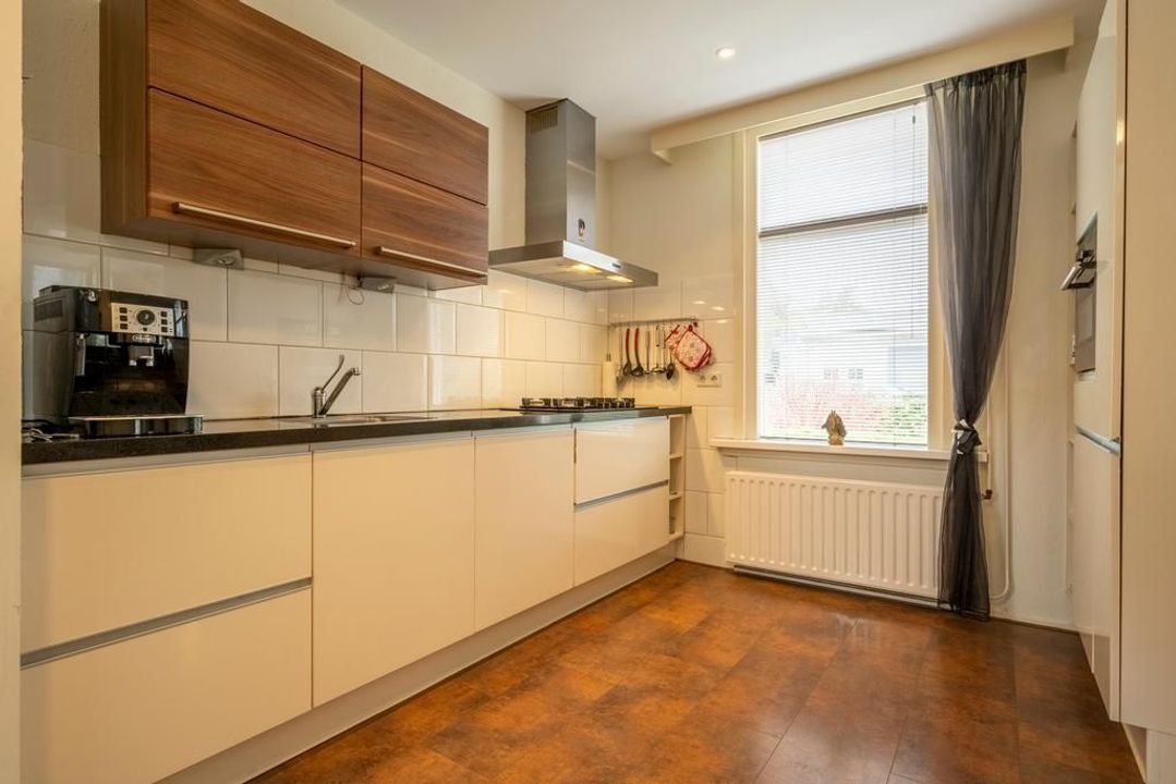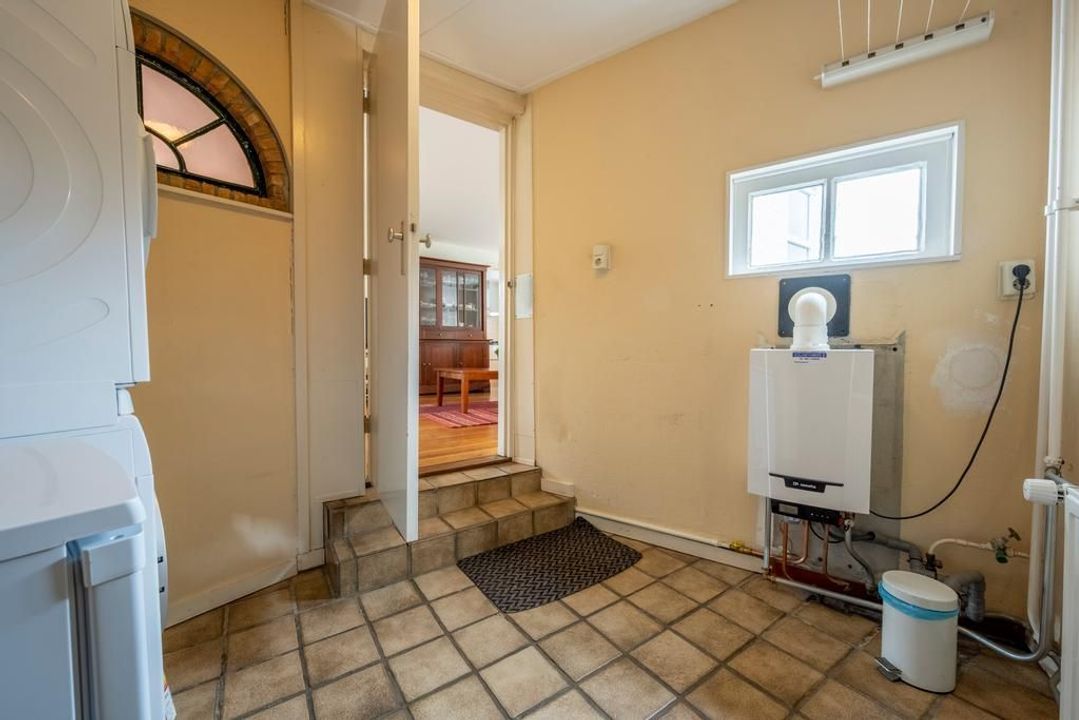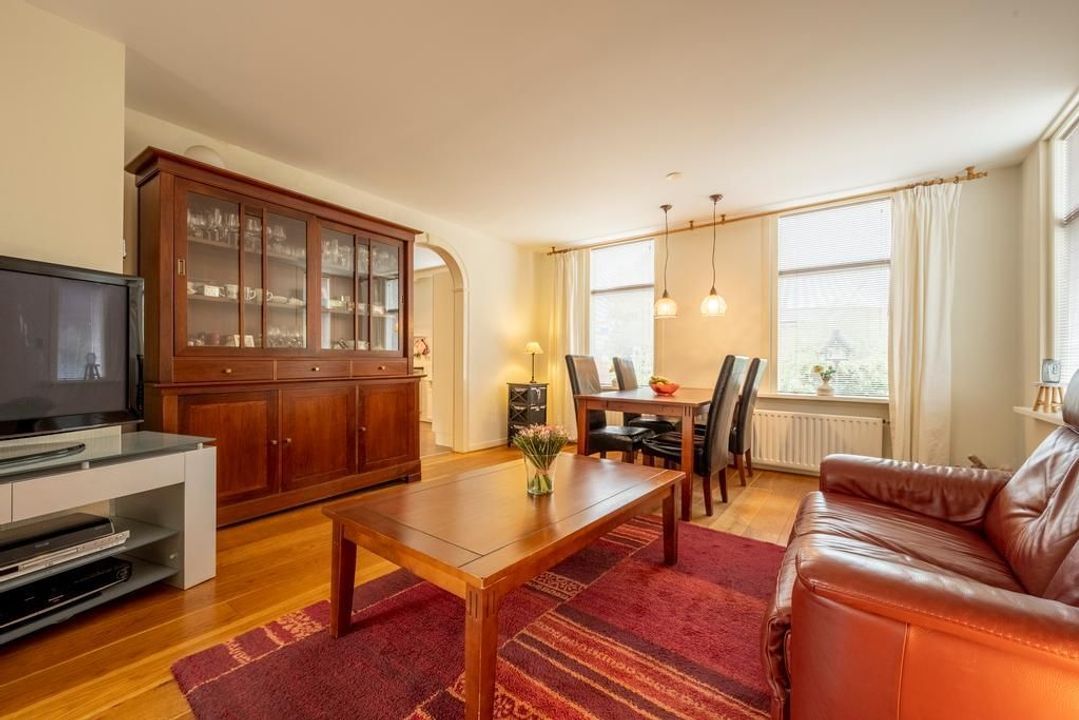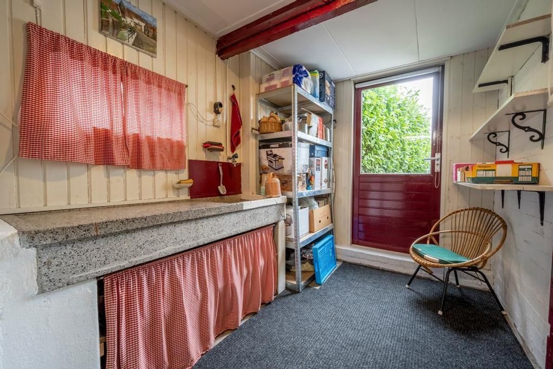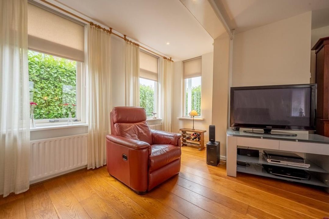 De gezellige woonkamer heeft een fijne lichtinval, mooie houten vloer en biedt ruimte voor een gezellige eettafel en zithoek. Vanuit de woonkamer is er toegang naar de tussenkamer waar de CV-ketel en wasmachine- en drogeropstelling geplaatst zijn. Heel praktisch is er ook een bijkeuken met een granieten keukenblok met water.