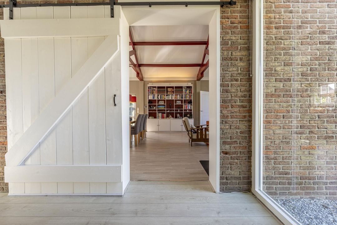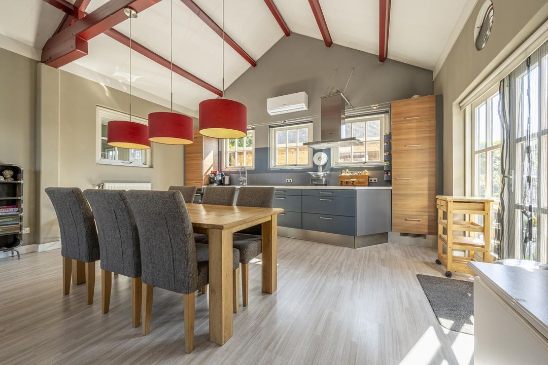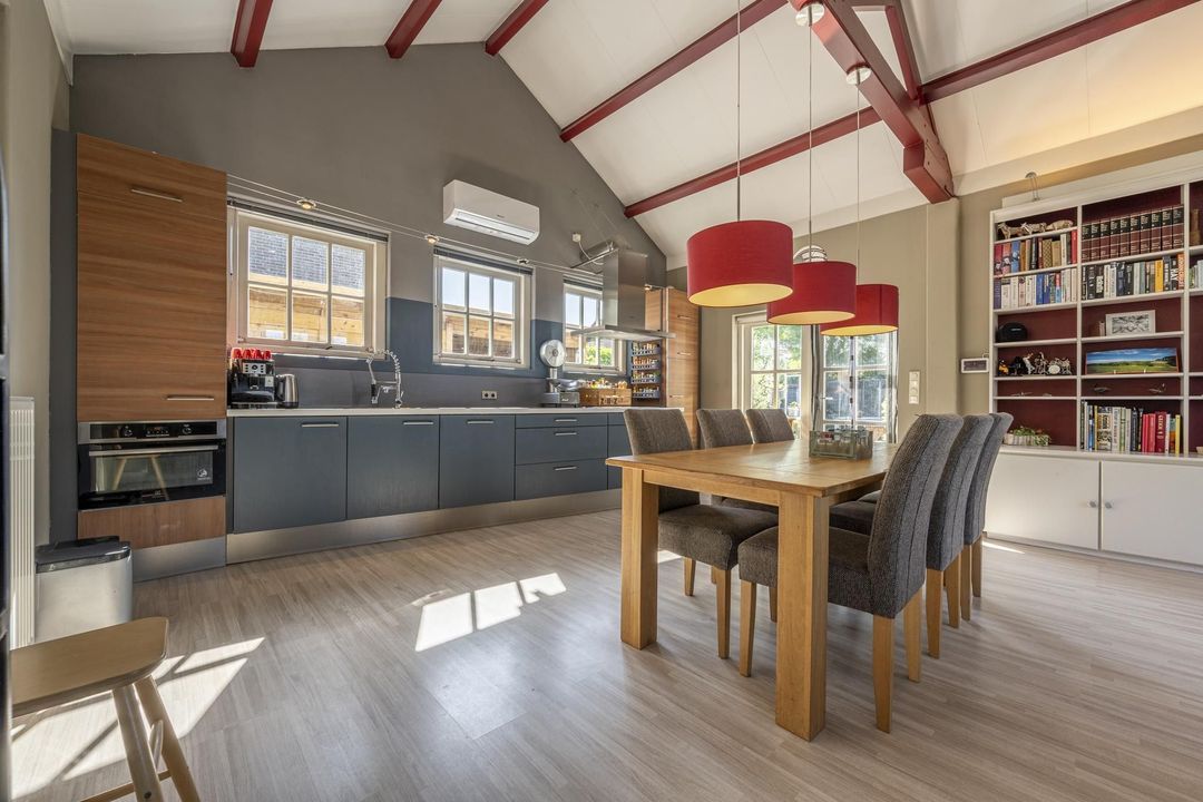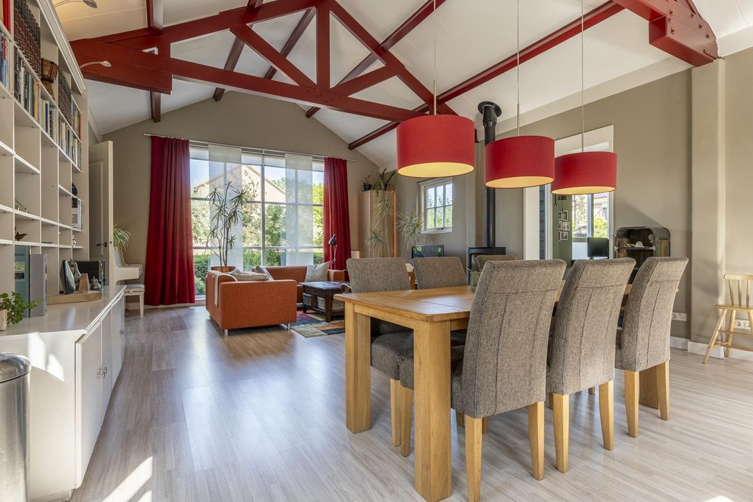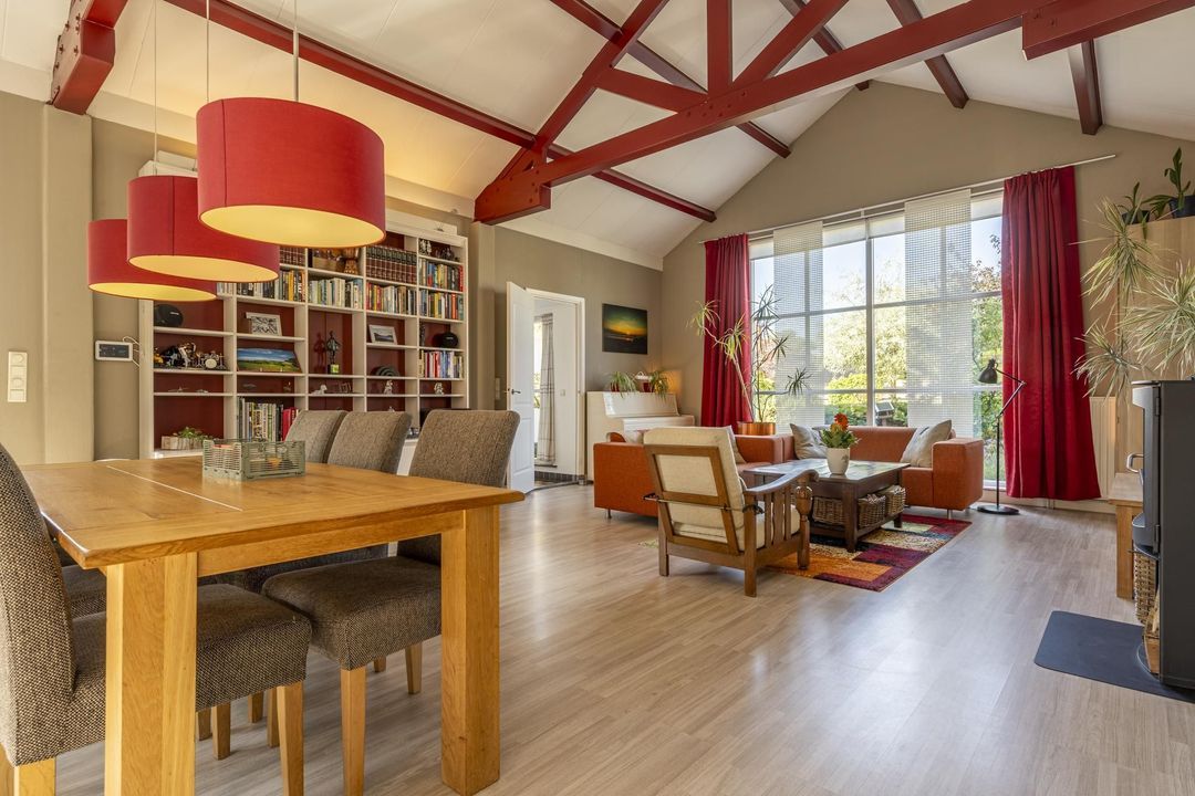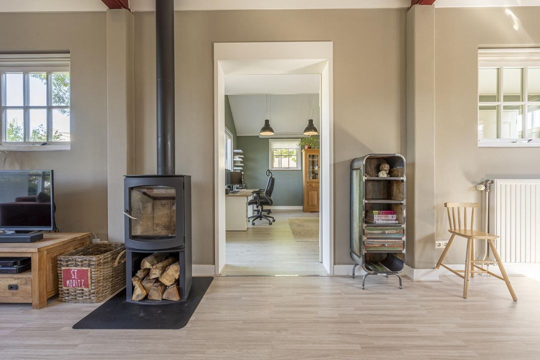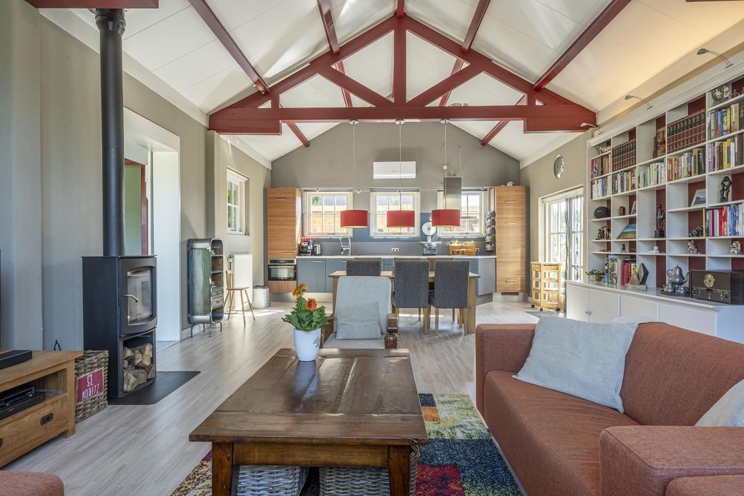 Een van de voordelen van deze woning is dat alle kamers zich op de begane grond bevinden, waardoor het levensloopbestendig is. Op de plek waar ooit de brandweerwagen stond, vind je nu de sfeervolle woonkamer, die zich kenmerkt door een prachtig zicht in de hoge nok, een balkenplafond, een gezellige houtkachel en een groot raam aan de voorzijde. De woonkamer heeft een open keuken die is uitgerust met diverse inbouwapparatuur.