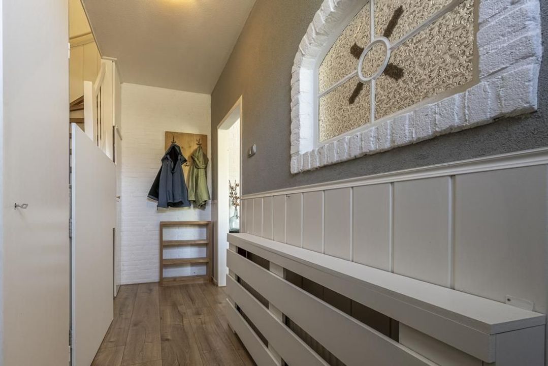 Bij binnenkomst in de woning betreedt u de entree, die toegang biedt tot de toiletruimte met fonteintje, de meterkast en een praktische trapkast, evenals de woonkamer.
