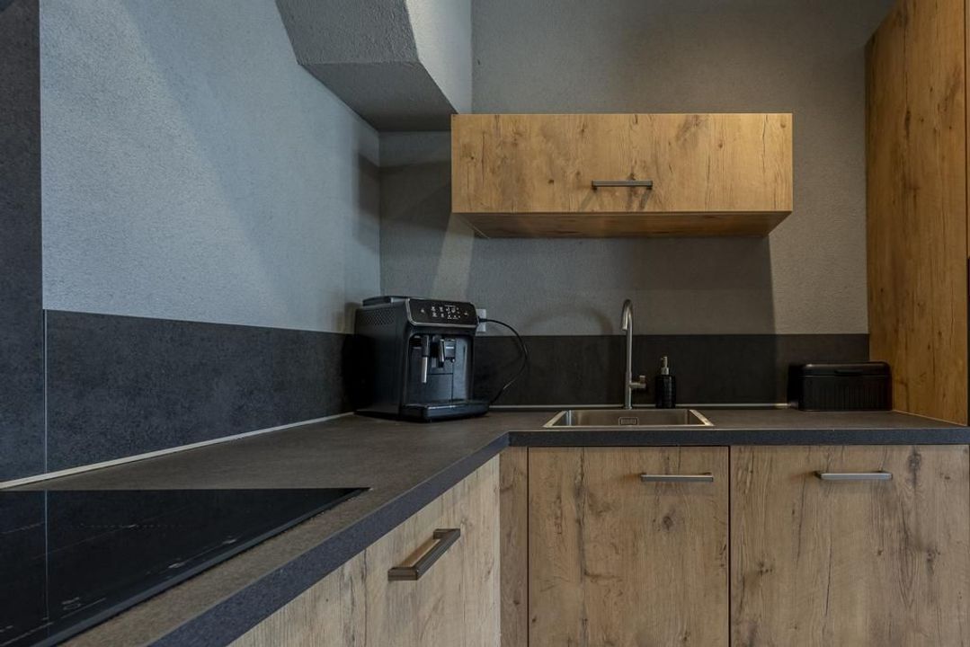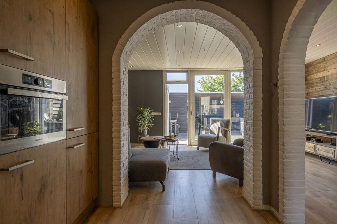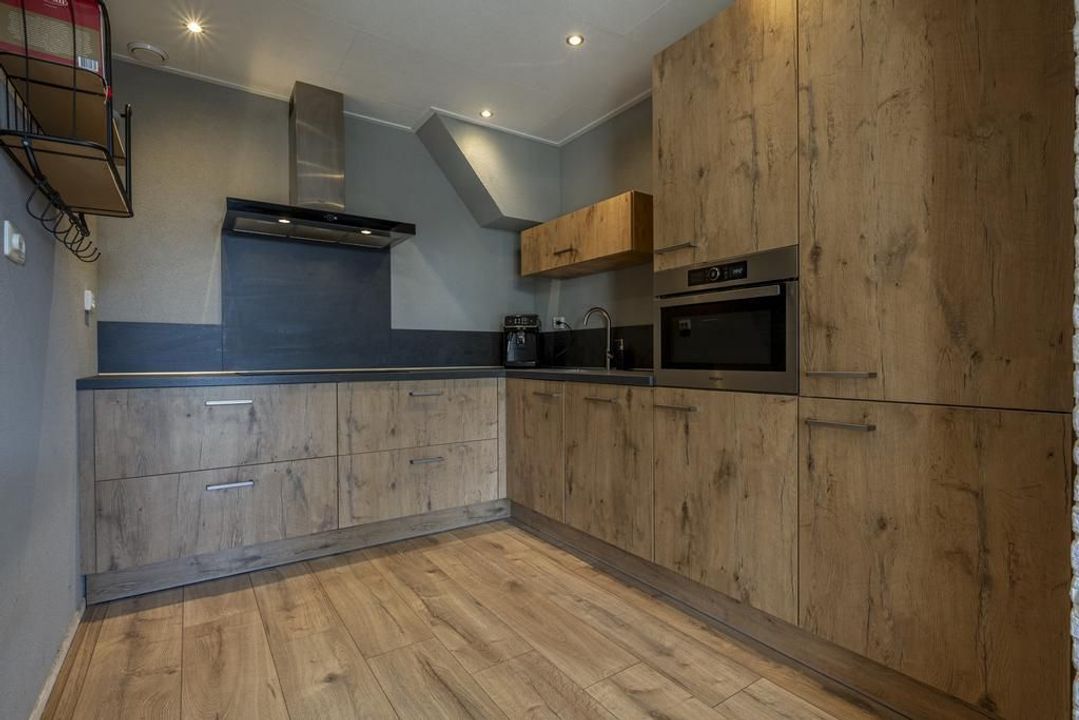 De halfopen L-vormige keuken is volledig vernieuwd in 2018 en is uitgerust met Whirlpool-apparatuur, waaronder een inductiekookplaat, afzuigkap, koel-vriescombinatie, combimagnetron, boiler en vaatwasser. De keuken is afgewerkt met kasten en lades met een houtlook en heeft een antraciet werkblad.