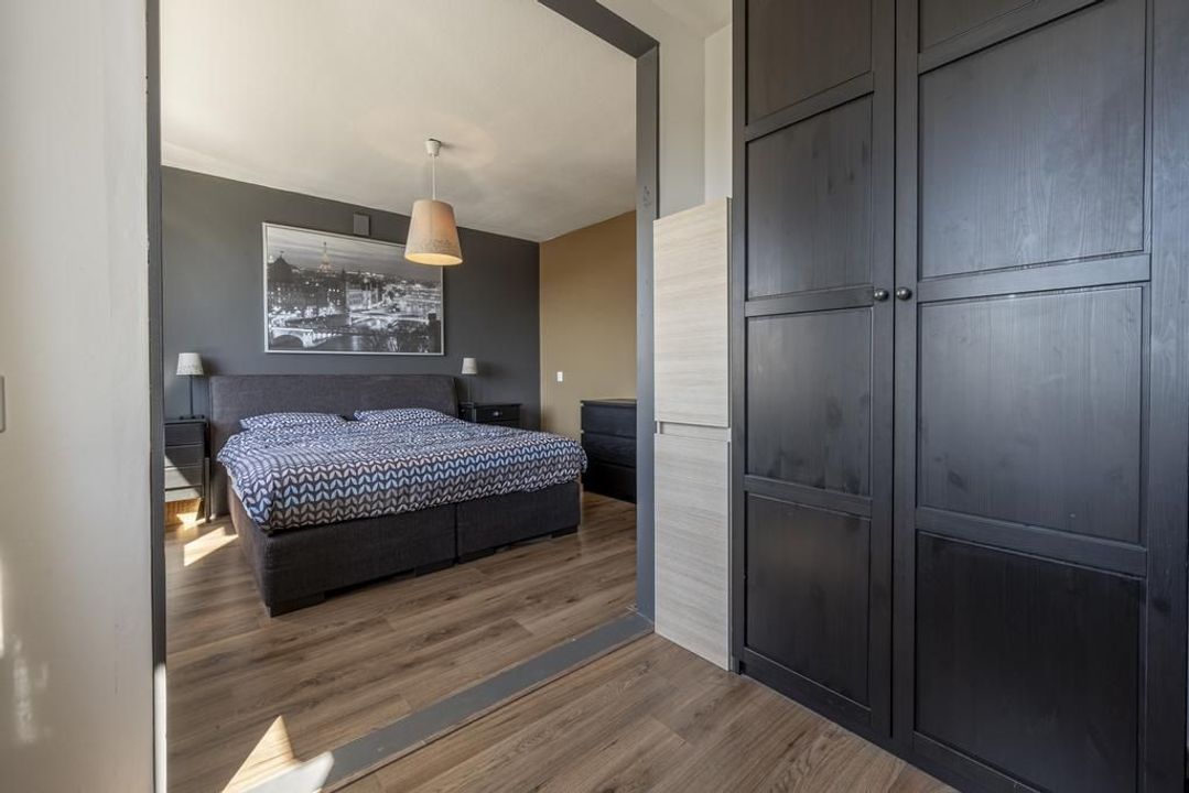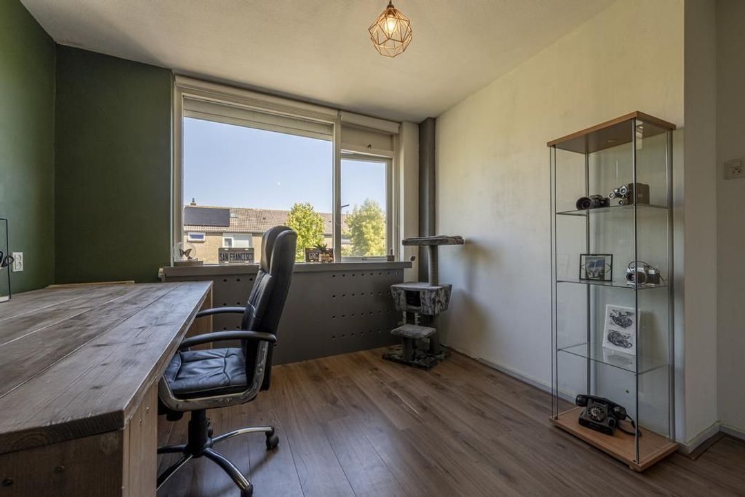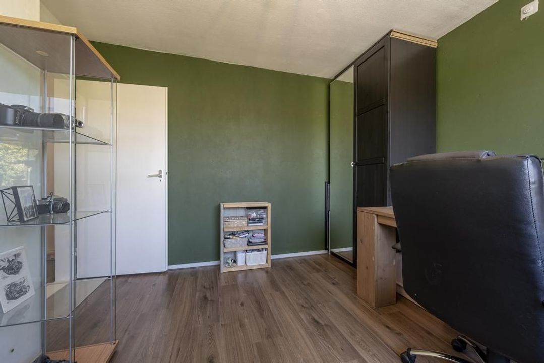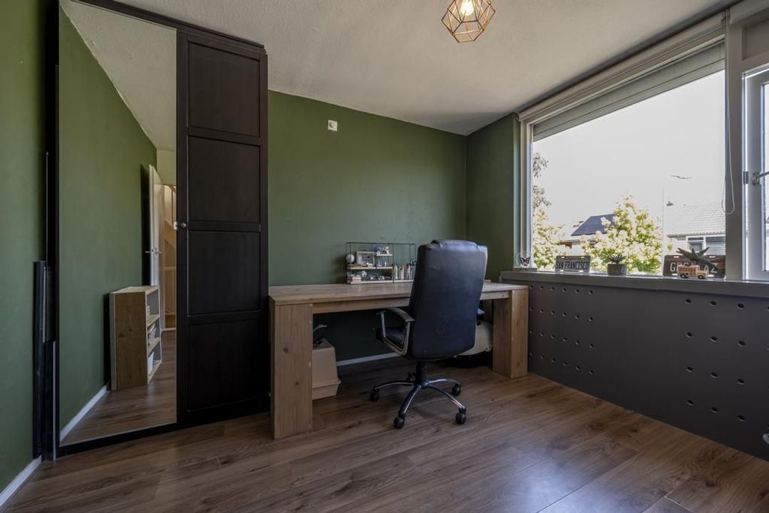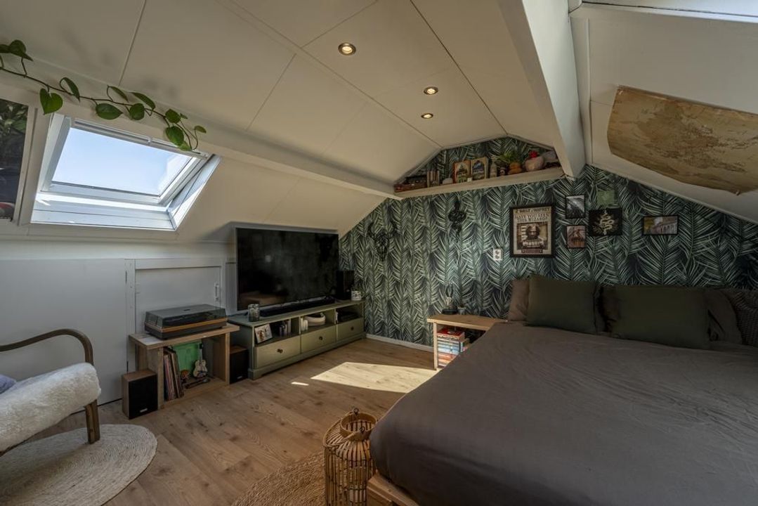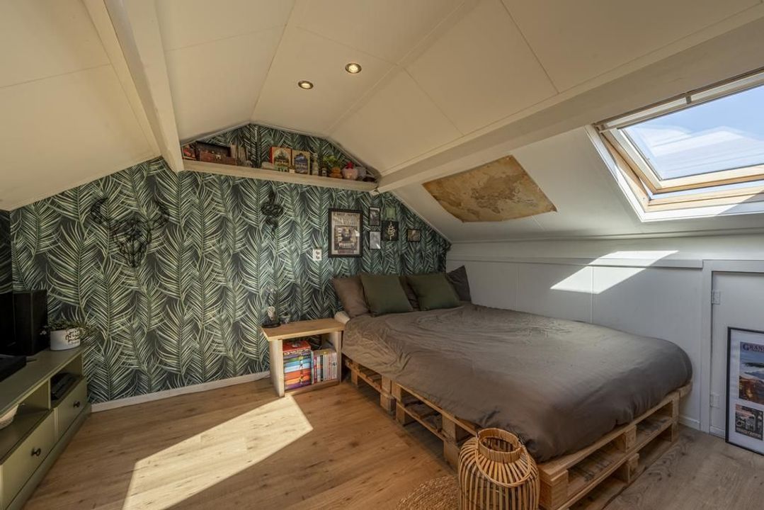 Op de tweede verdieping is er een overloop met voldoende ruimte voor de wasmachine, droger, cv-ketel, mechanische ventilatie en de omvormer voor de zonnepanelen. Daarnaast bevindt zich hier een ruime derde slaapkamer met dakramen aan beide zijden, deze zijn voorzien van verduisteringsgordijnen, en extra bergruimte achter de knieschotten aan beide zijden. De vloer is afgewerkt met een lichte laminaatvloer.