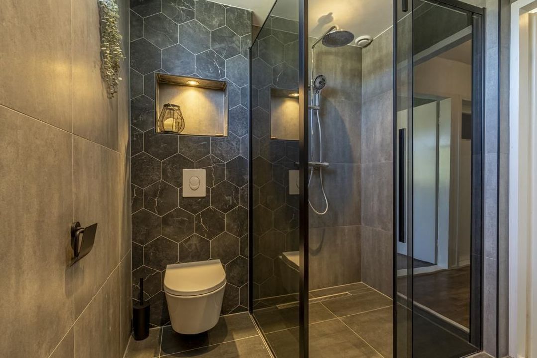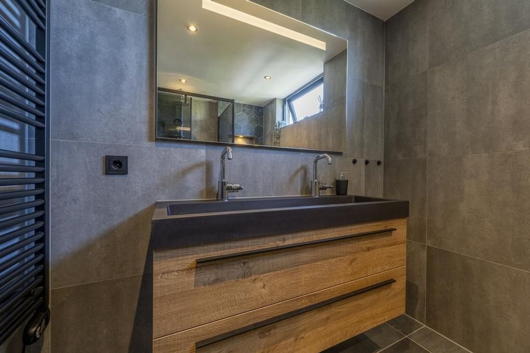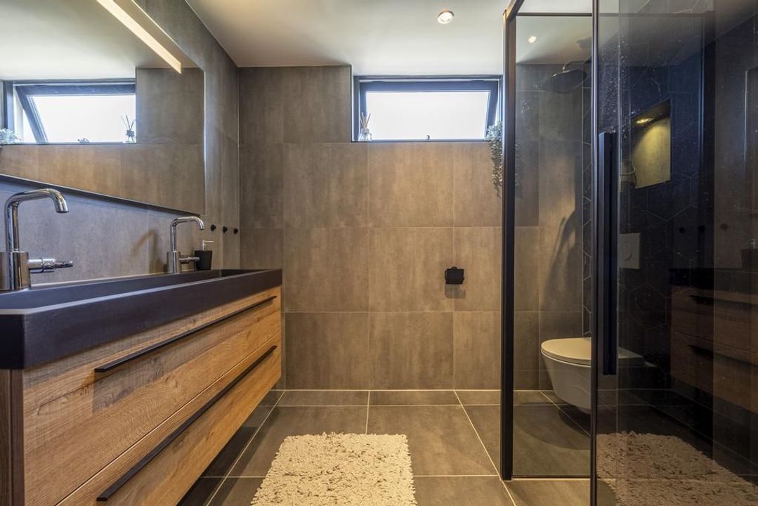 De moderne badkamer, met een trendy en eigentijdse kleurstelling die helemaal in lijn is met de laatste trends, is eind 2022 aangelegd. De badkamer is uitgerust met een inloopdouche voorzien van zowel een regendouche als een handdouche, een dubbele wastafel met meubel, een toilet, een designradiator en mechanische ventilatie. Daarnaast maken de grote grijze wand- en vloertegels de badkamer helemaal compleet!