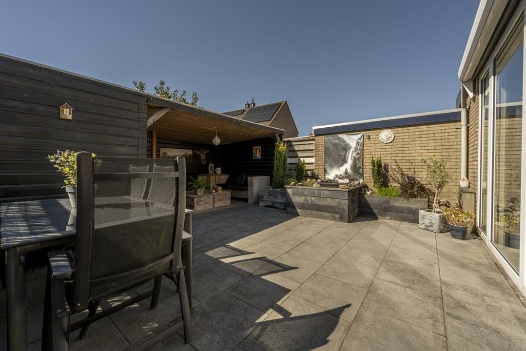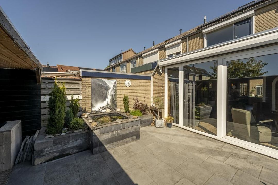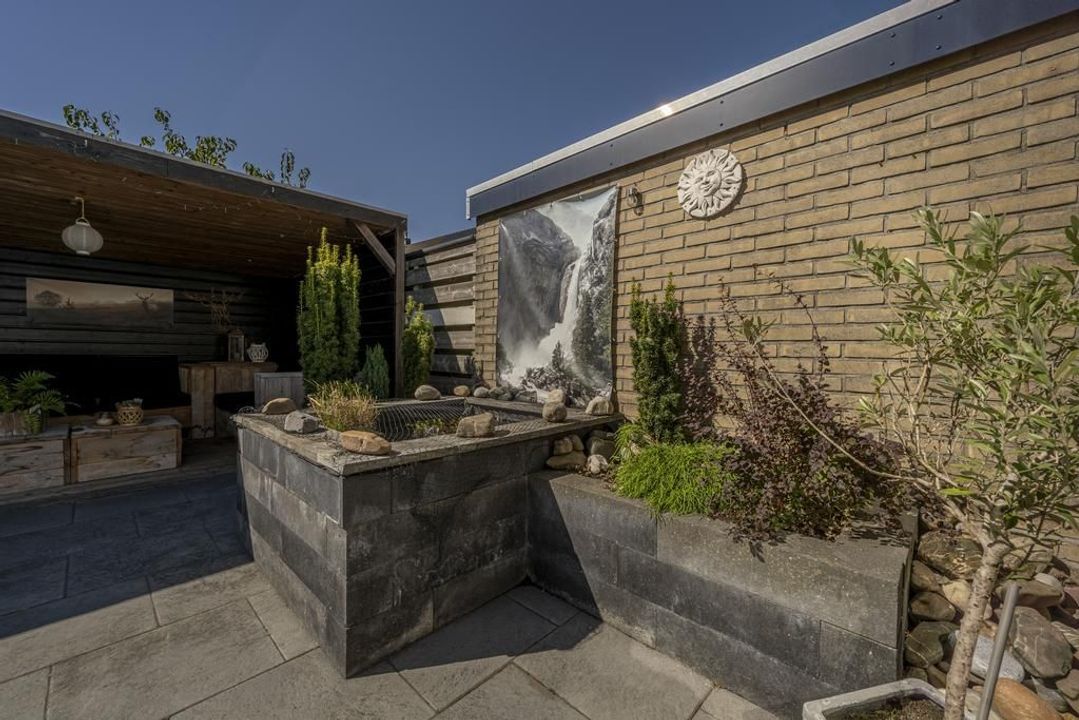 De tuin is georiënteerd op het westen en biedt zowel zonnige als schaduwrijke plekken. Daarnaast beschikt deze over een vijver evenals betegeling, een waterpunt en een bloemenborder. De bestaande veranda vormt het hart van de tuin en biedt ruimte voor een grote loungeset, terwijl er tevens verlichting aanwezig om 's avonds een gezellige sfeer te creëren.