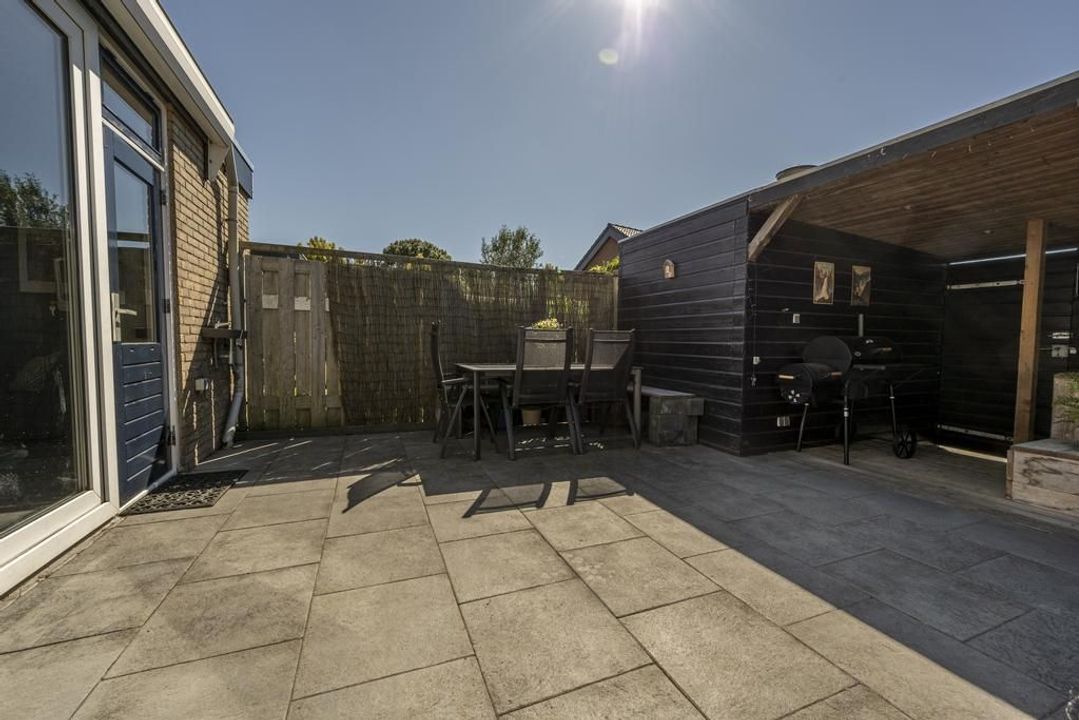 Via de achterom, die toegang biedt tot de houten berging met elektriciteit, kunt u gemakkelijk tuinspullen of fietsen opbergen.