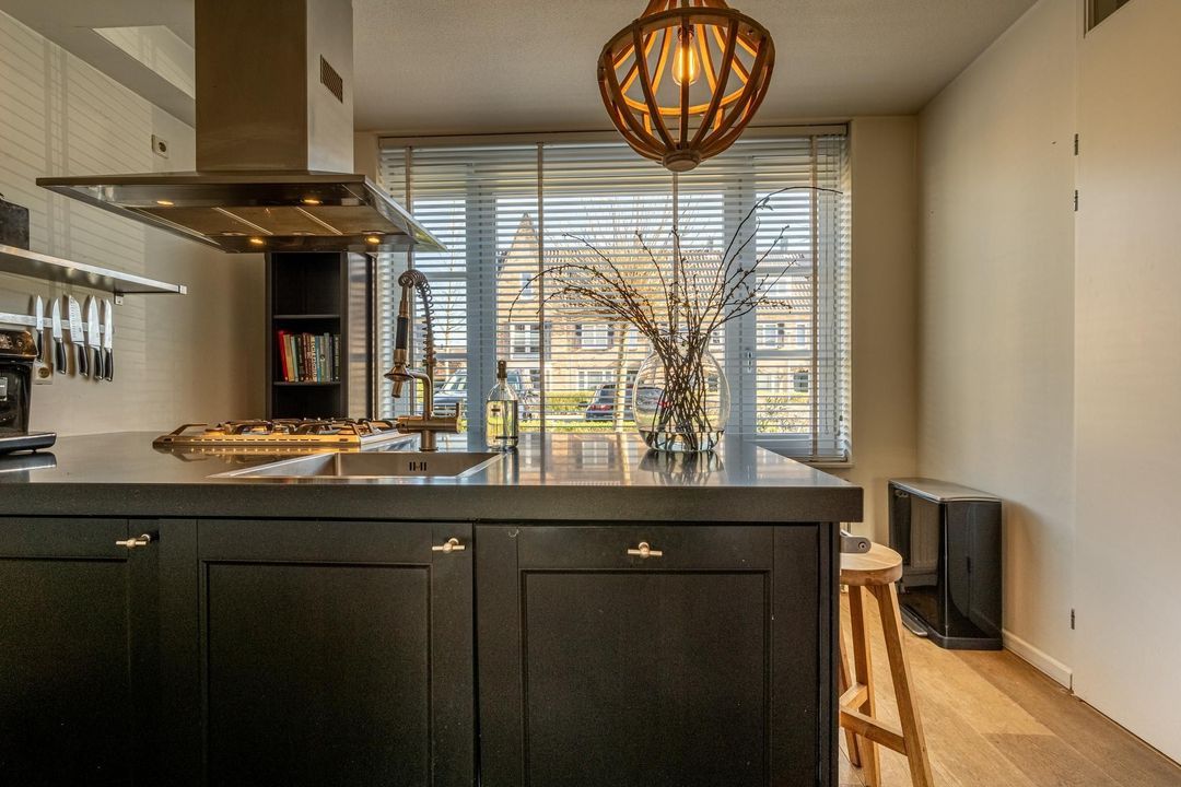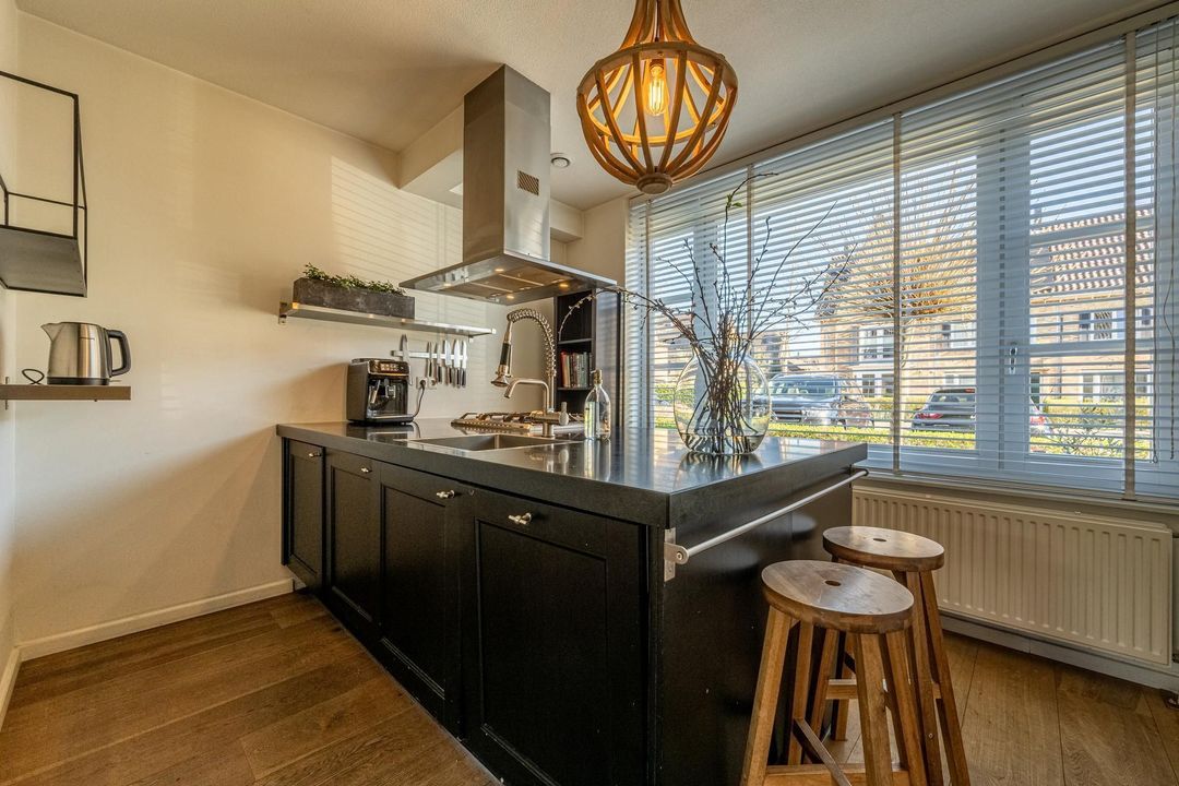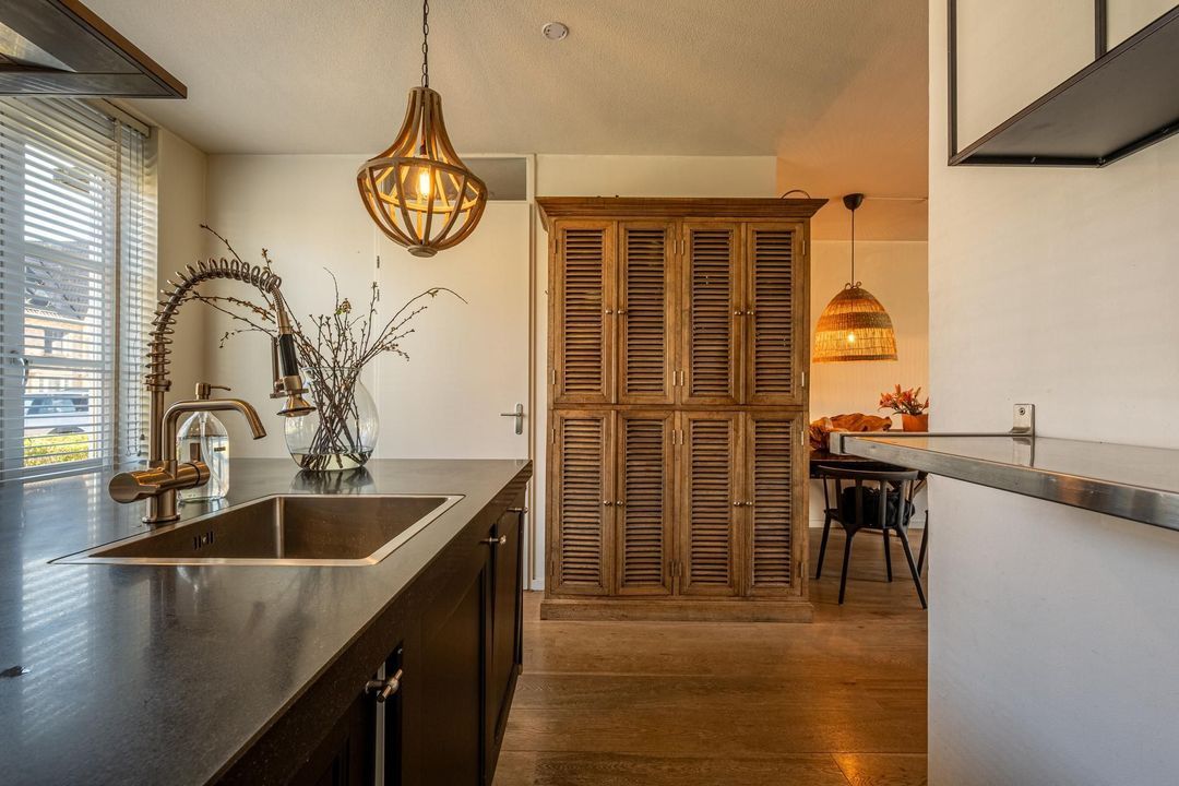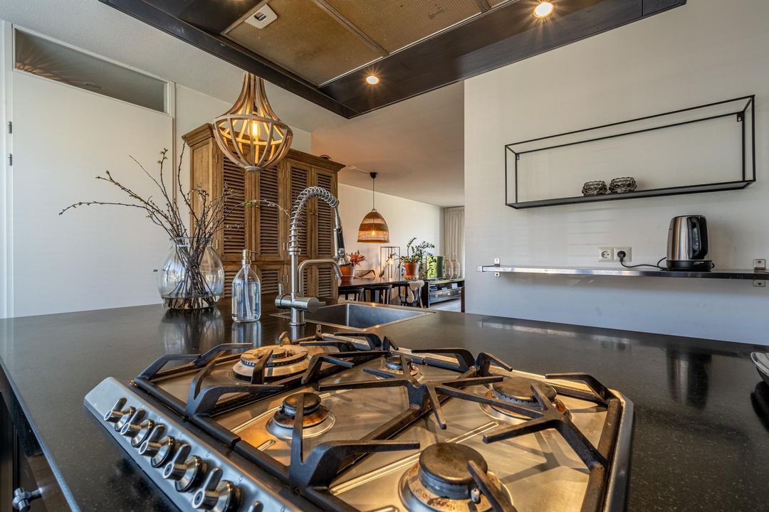 De open keuken is trendy afgewerkt door de zwarte keuken kasten gecombineerd met een zwart werkblad. Het gezin of bezoek neemt plaats op de barkruk om zo gezamenlijk de dag door te nemen. De keuken is ingericht met een 5-pits gaskookplaat met afzuigkap, combimagnetron, koelkast, vriezer en een vaatwasser.