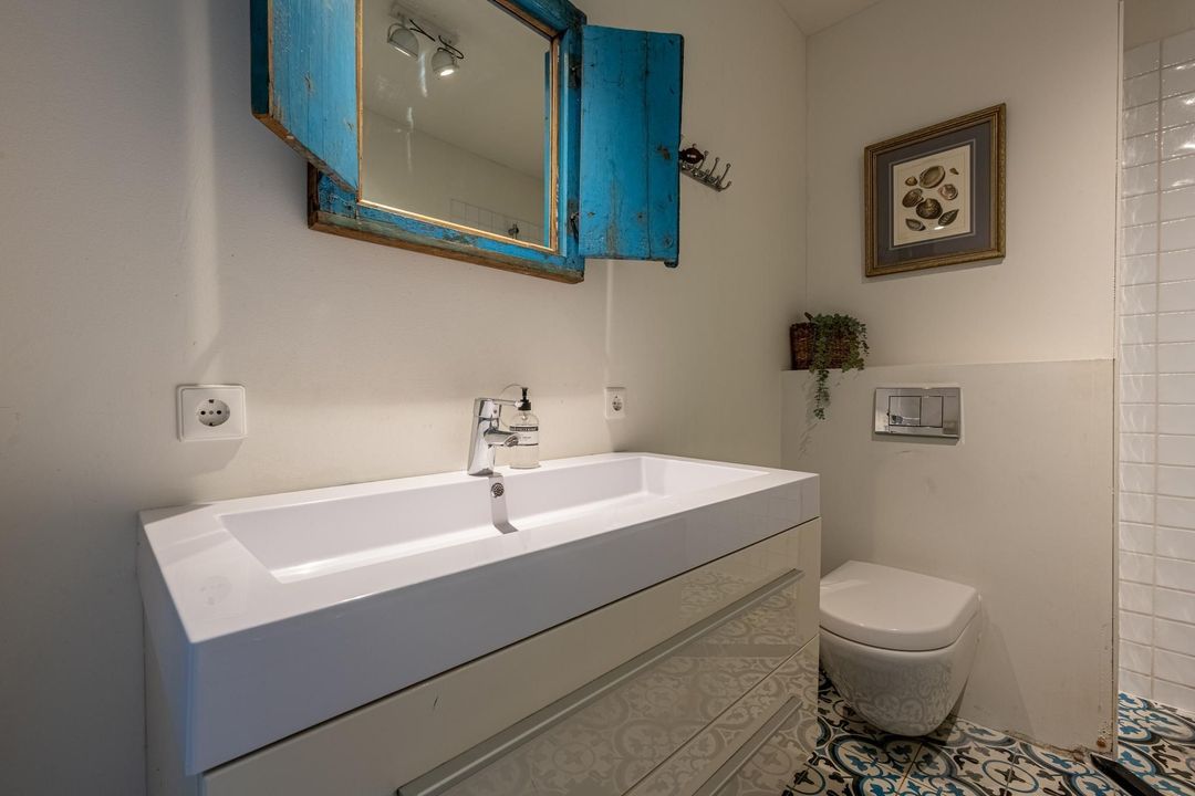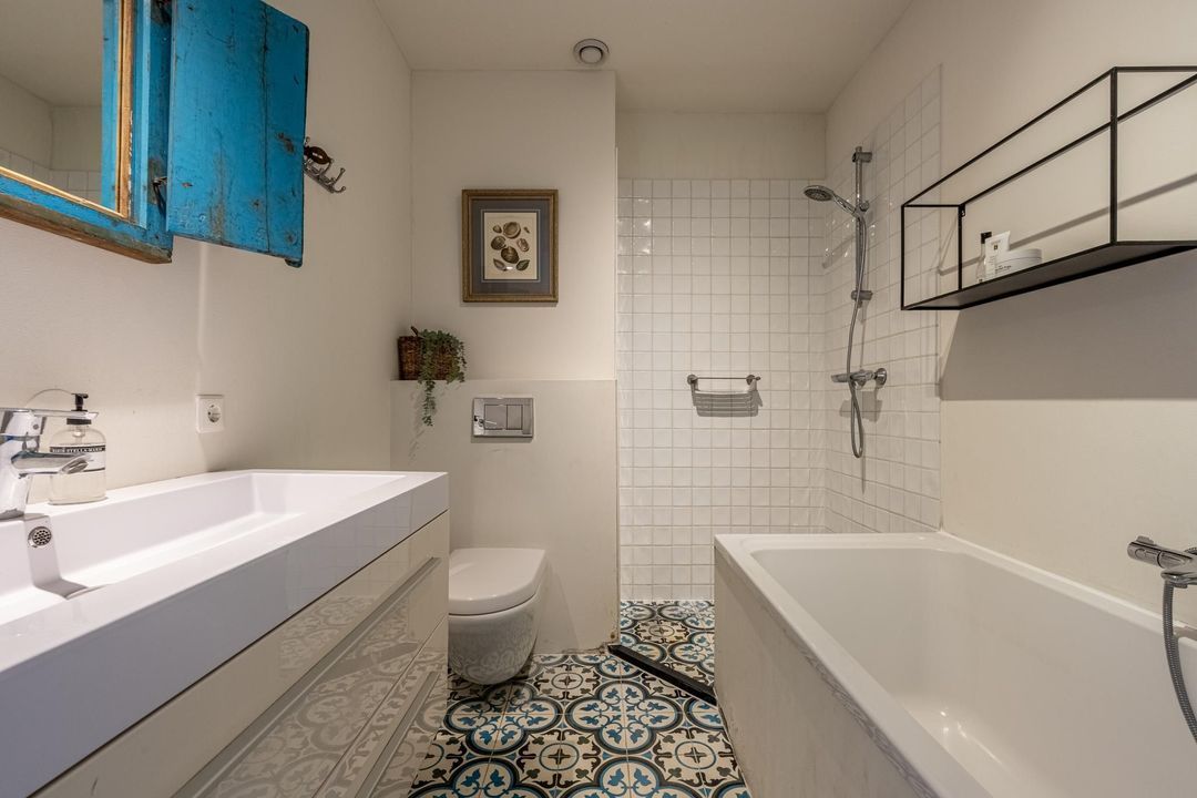 Zodra de badkamer wordt binnen gegaan, geeft het een gevoel van ontspanning en rust! De badkamer is ingericht met een ligbad, inloopdouche, wastafelmeubel en een toilet. De badkamer is afgewerkt me tegels en stuukwerk in een lichte kleurafwerking.