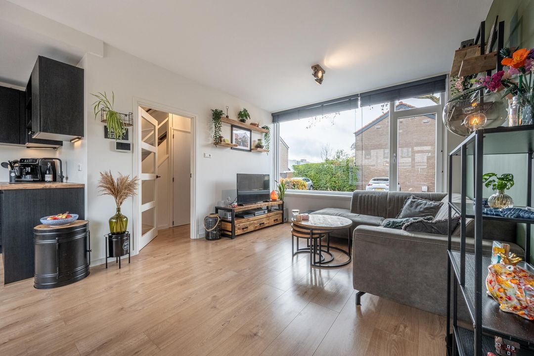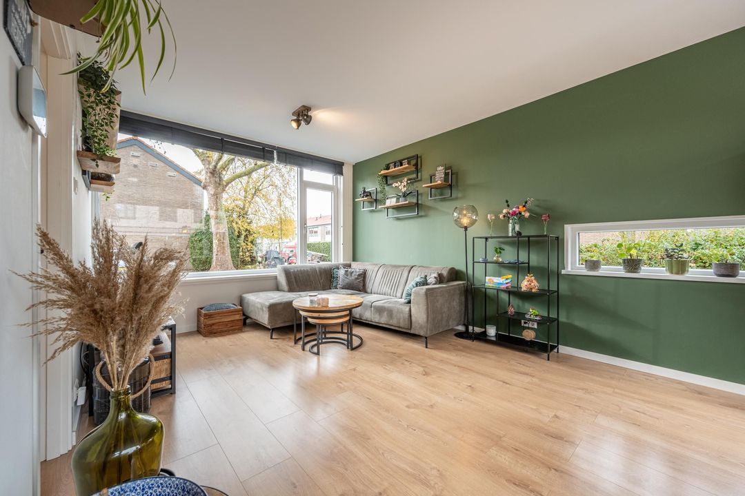 De woonkamer is sfeervol en licht en afgewerkt met een doorgelegde laminaatvloer die eveneens op de trap is doorgevoerd voor een mooi geheel.