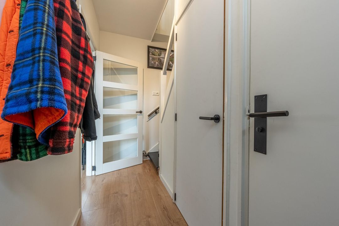 Entree van de woning in de hal met toegang tot het toilet, de trapkast met bergruimte, de meterkast en de verdeler van de vloerverwarming. Vanuit de hal bereik je de woonkamer.