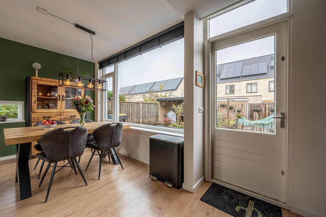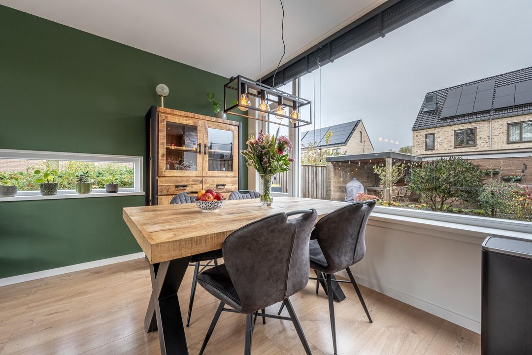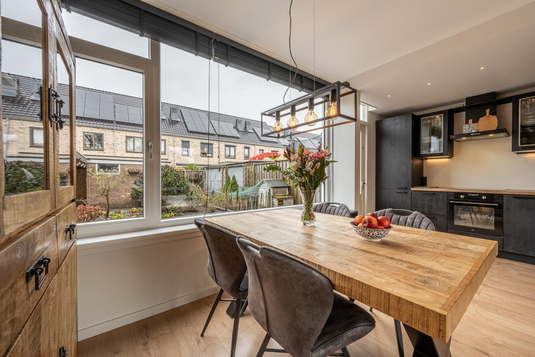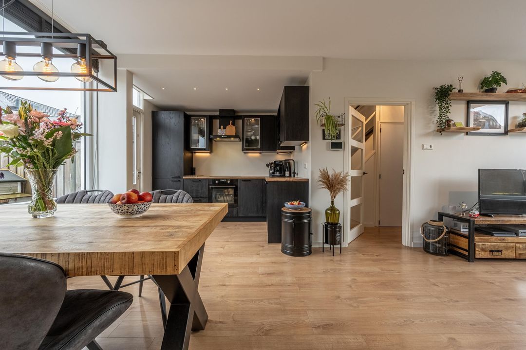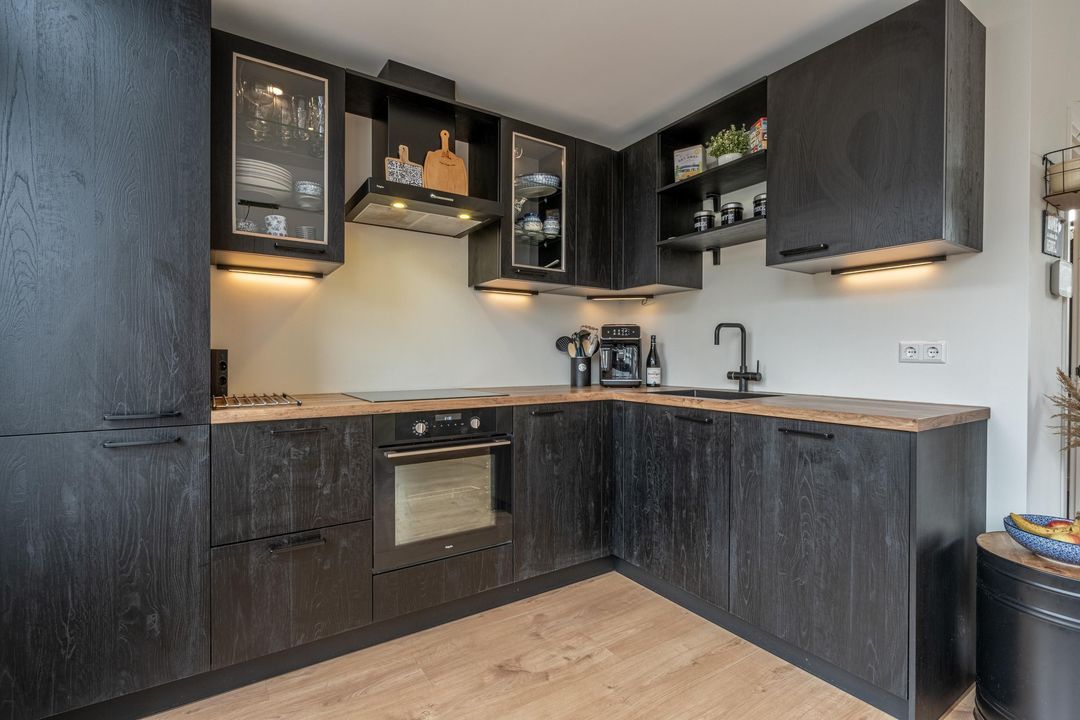 Aan de achterzijde loopt de woonkamer over in de moderne open keuken. Deze is in 2020 vernieuwd en voorzien van diverse inbouwapparatuur, waaronder een kokendwaterkraan, vaatwasser, inductiekookplaat, afzuigsysteem, heteluchtoven en een koel-vriescombinatie.
