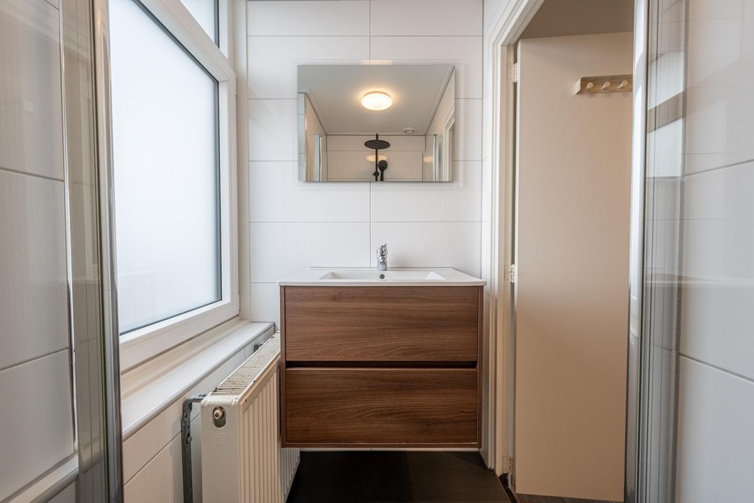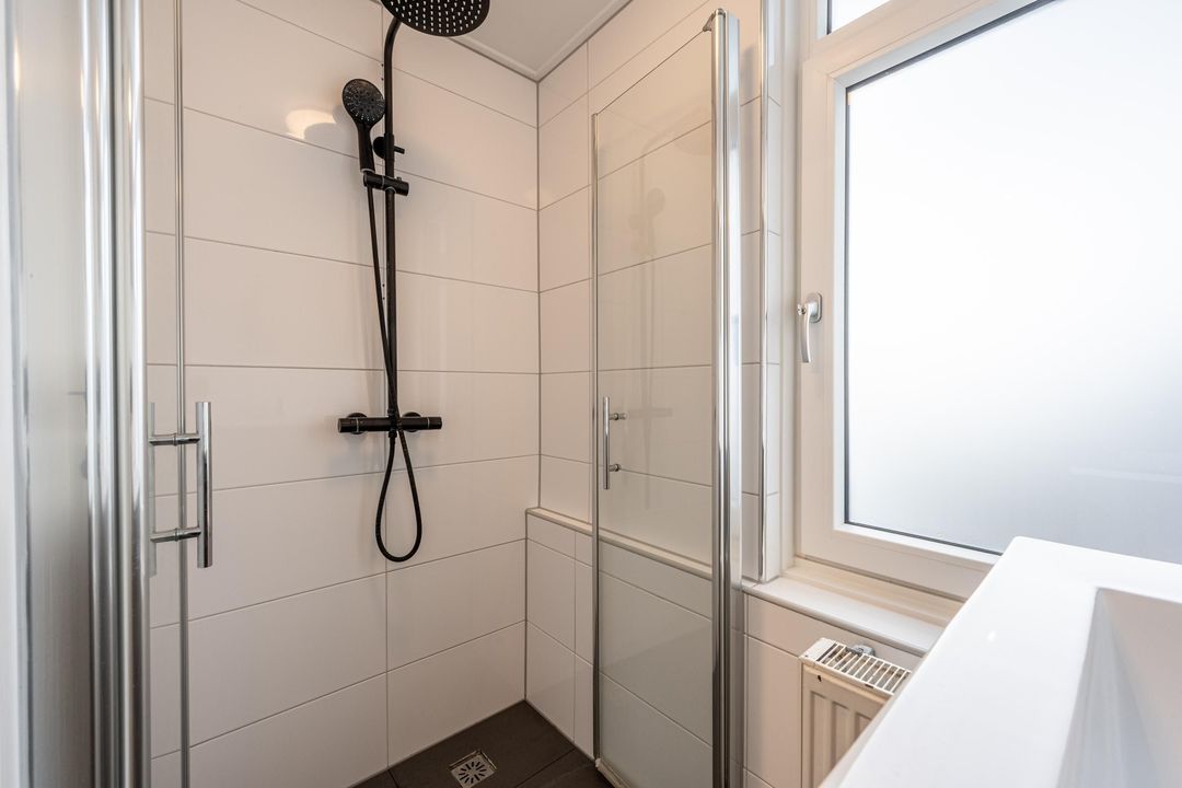 De badkamer is modern afgewerkt met witte wandtegels in combinatie met antraciet vloertegels. De ruimte is ingericht met een douchecabine, een wastafelmeubel in houtlook, een radiator, mechanische ventilatie en een groot draaikiepraam dat zorgt voor veel lichtinval en natuurlijke ventilatie.