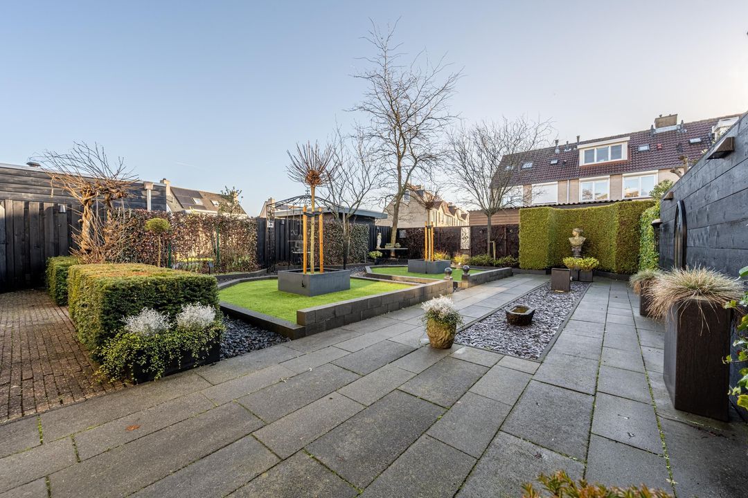 De ruime achtertuin is gelegen op het zuidoosten en biedt veel rust en privacy. De tuin is onderhoudsvriendelijk aangelegd met een combinatie van sierbestrating, kunstgras en beplanting.