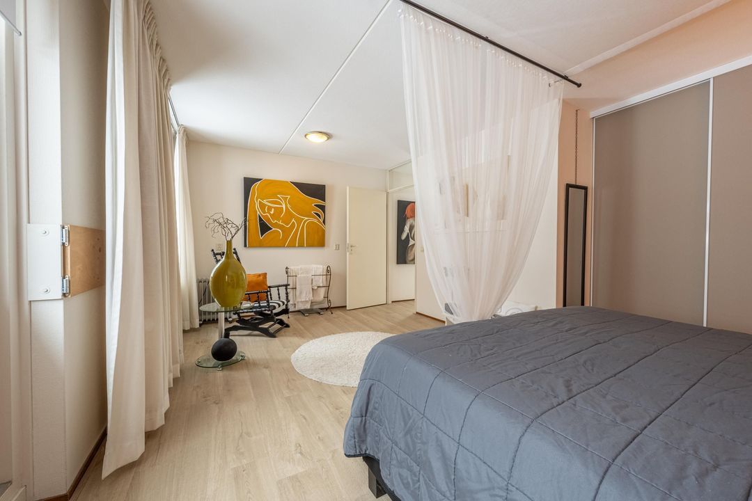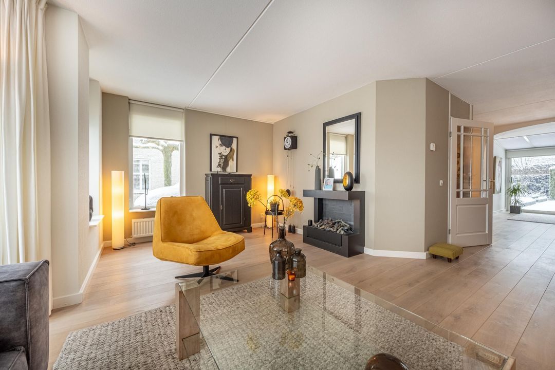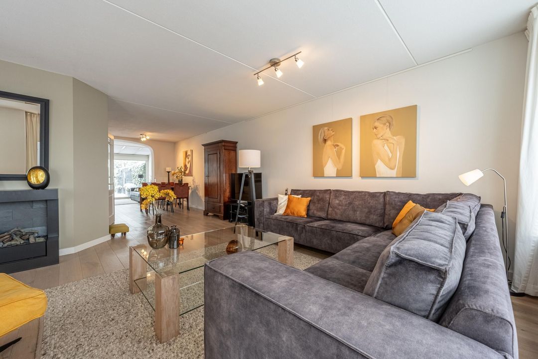 De ruime woonkamer is heerlijk licht dankzij de grote raampartijen, die zorgen voor een prettige en natuurlijke lichtinval. Over de gehele verdieping ligt een gelamineerde houten vloer, wat bijdraagt aan een rustige en verzorgde uitstraling.