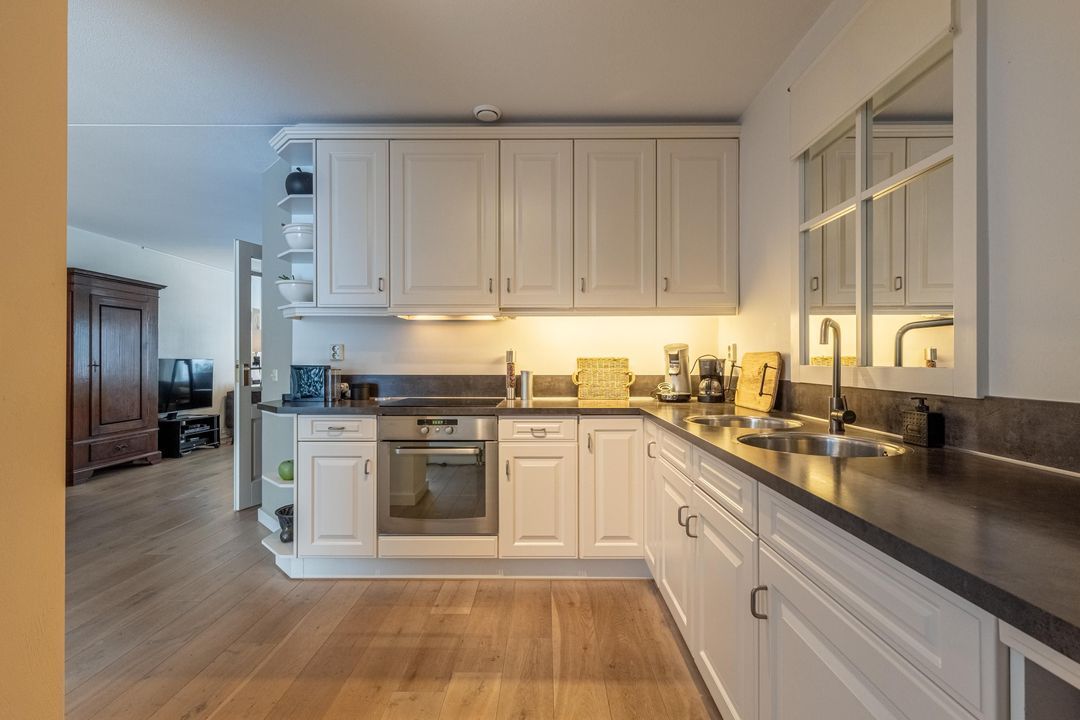 De open keuken in L-opstelling is voorzien van een vierpits keramische kookplaat met afzuigkap, oven en koelkast. De afgewerkte keukenkasten in gebroken wit in combinatie met het kunststof werkblad en twee RVS spoelbakken maken de keuken fris en tijdloos.