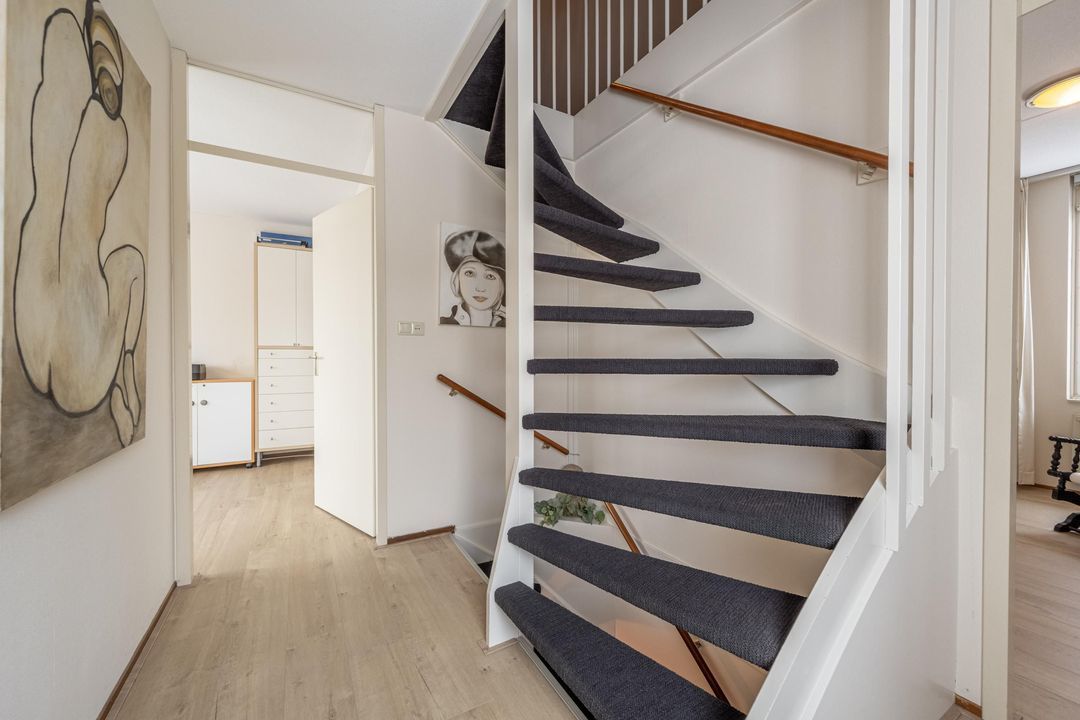 Entree van de woning met gerenoveerd toilet (2021), meterkast, inbouwgarderobe en trapopgang naar de eerste verdieping.