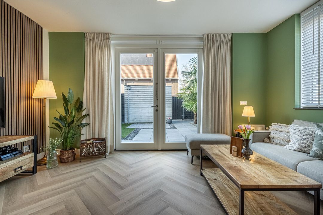 Vanuit de hal betreed je de woonkamer met open keuken. De woonkamer is strak afgewerkt met gestucte wanden en biedt volop ruimte voor een royale zithoek. Dankzij de vloerverwarming op deze verdieping en de openslaande deuren naar de tuin is dit een comfortabele en aangename leefruimte, waar binnen en buiten mooi in elkaar overlopen.