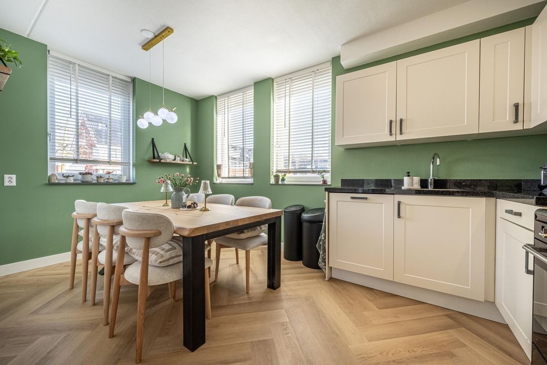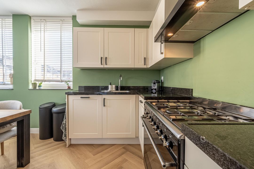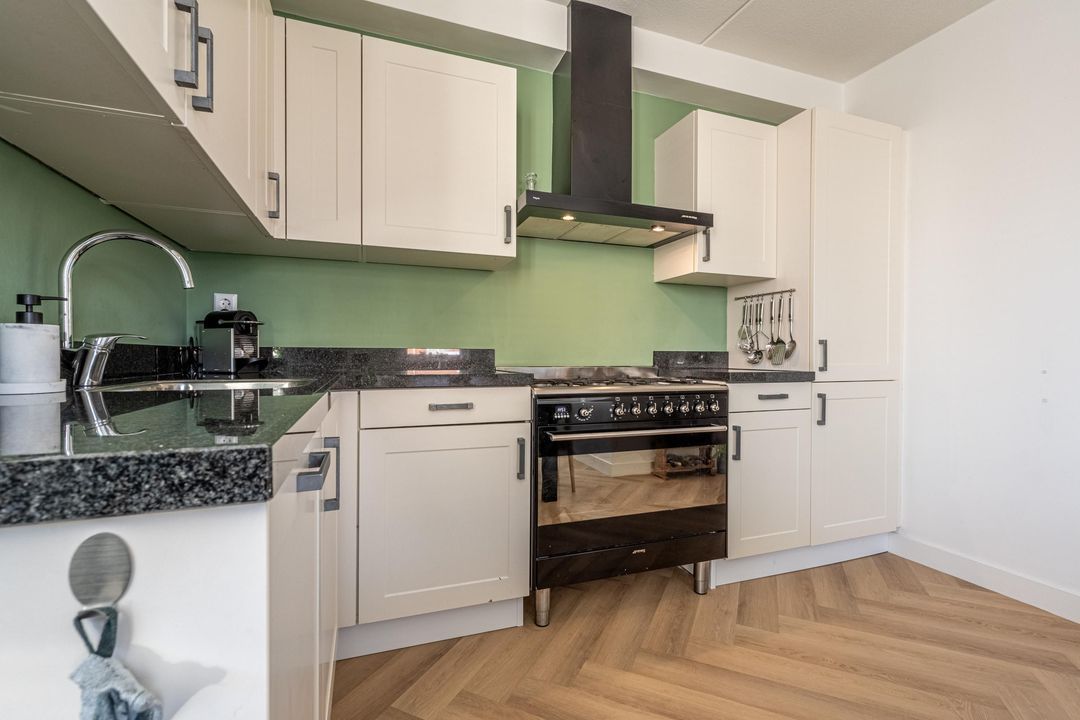 De open keuken bevindt zich aan de voorzijde van de woning en sluit aan op de eethoek. De keuken is uitgevoerd met crèmekleurige kasten en een granieten werkblad en wordt gekenmerkt door drie grote raampartijen die zorgen voor veel daglicht. De keuken is voorzien van een 6-pits gasfornuis, een koelkast, een losse vriezer, een spoelbak en een oven. Een fijne plek om te koken én samen te komen.