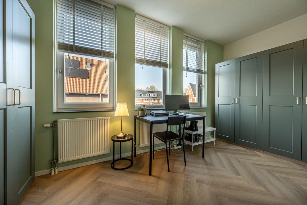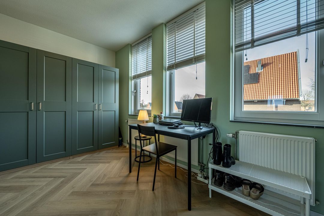 De tweede kamer op deze verdieping is eveneens netjes afgewerkt en voorzien van inbouwkasten. Achter deze kasten bevinden zich de aansluitingen voor de wasmachine en droger en is ook de cv-installatie keurig weggewerkt. Deze kamer is multifunctioneel inzetbaar, bijvoorbeeld als extra slaapkamer, werkruimte of wasruimte.