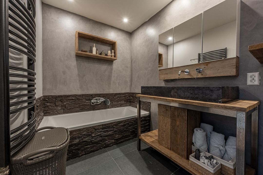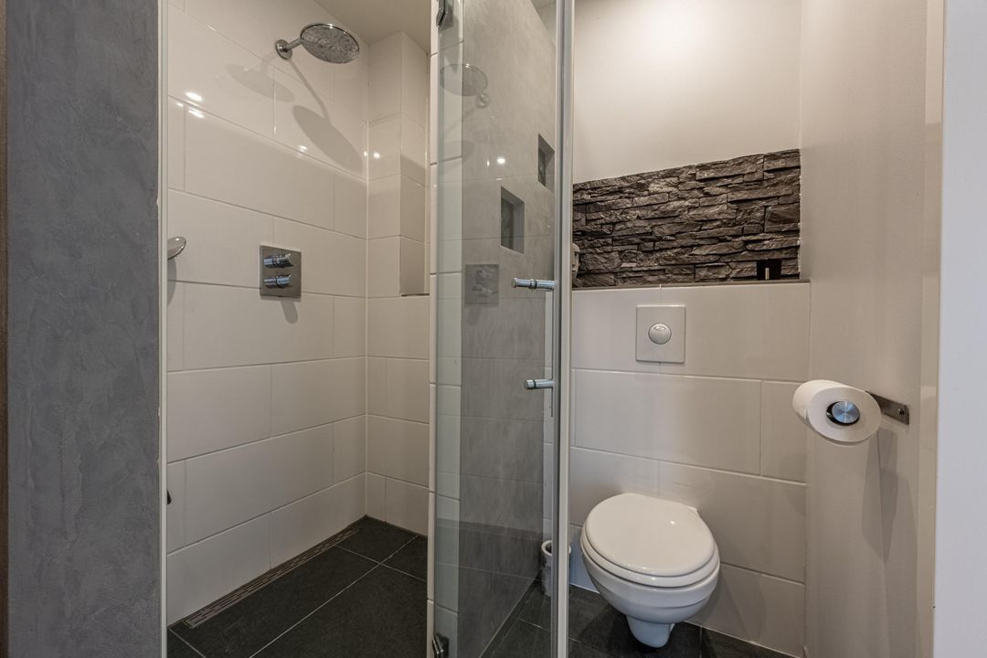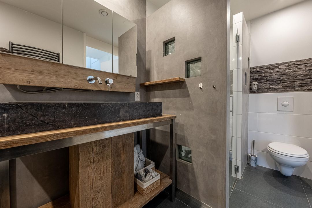 De badkamer is ruim en luxe uitgevoerd en beschikt over een inloopdouche met zowel een regendouche als een handdouche, een ligbad, een hangend toilet en een wastafel van natuursteen. De afwerking met antracietgrijze tegels, een designradiator en mechanische ventilatie maakt dit tot een comfortabele en stijlvolle ruimte.