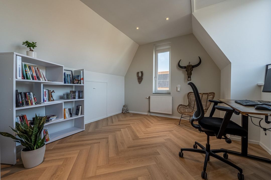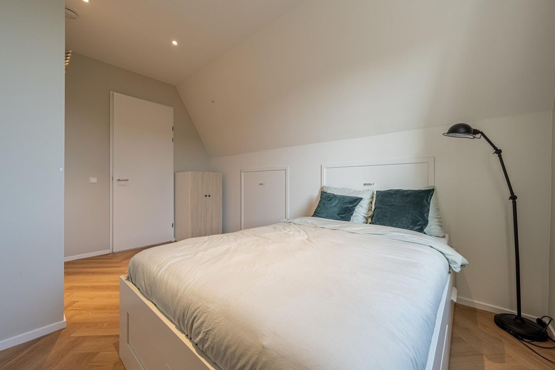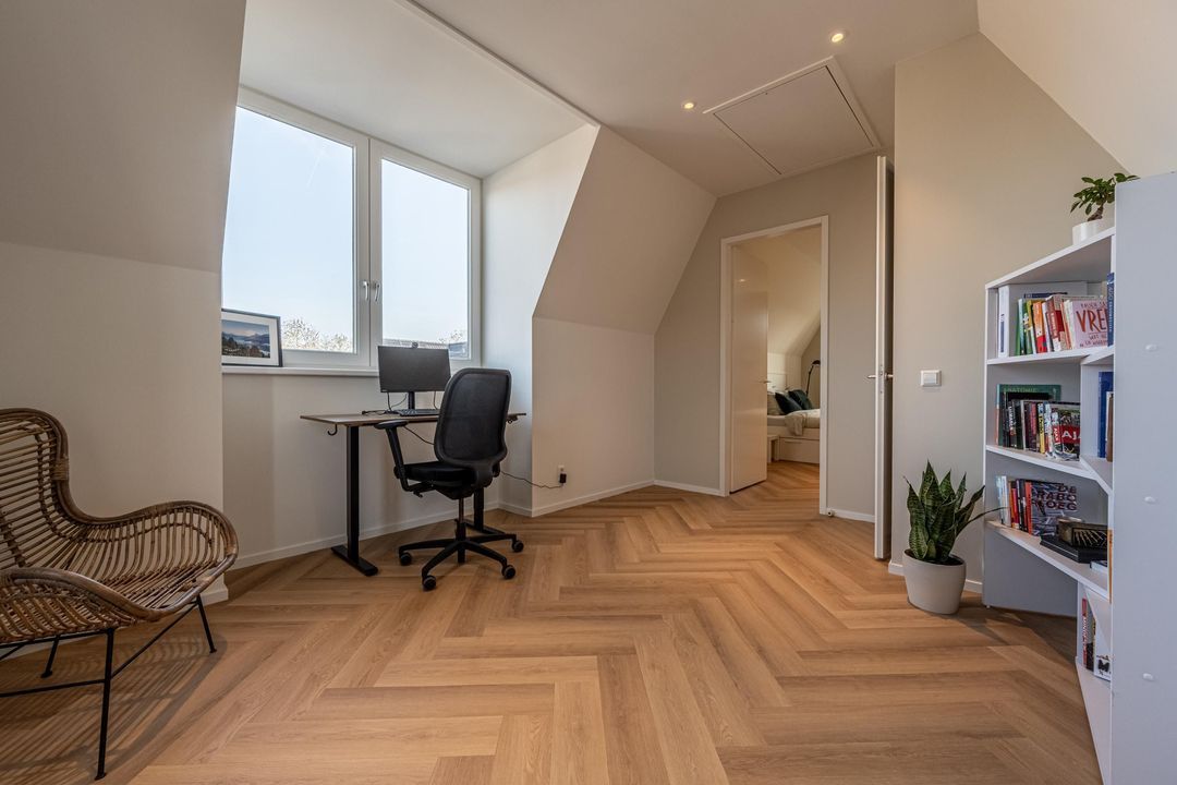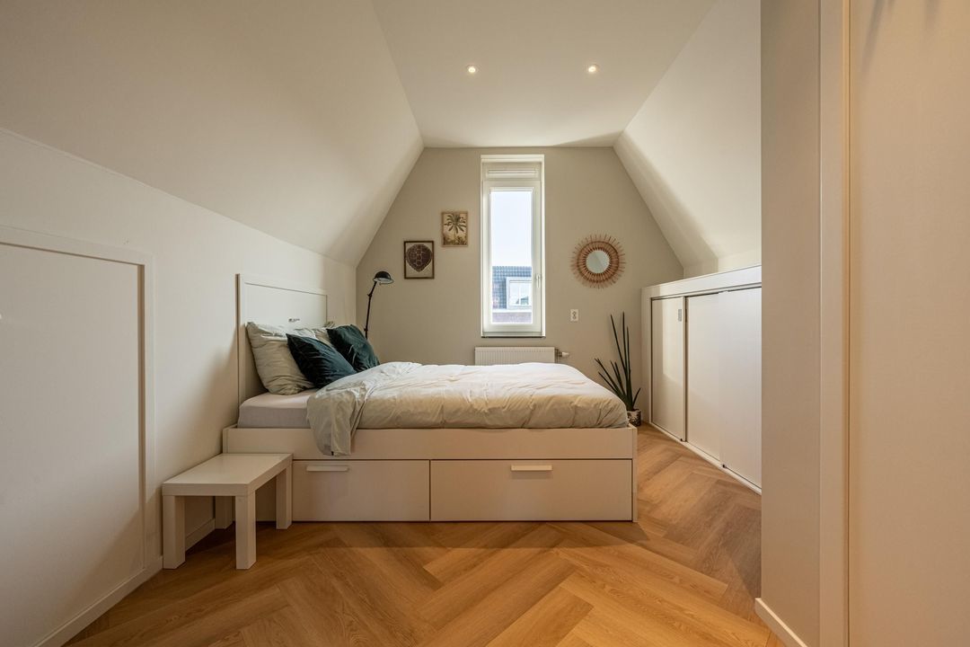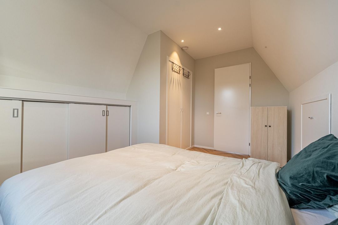 Via een vaste, ruime trap bereik je de zolderverdieping. Je komt direct binnen in een hoge, strak afgewerkte kamer met een plafond voorzien van inbouwspotjes en praktische bergruimte. Ook deze ruimte is groot genoeg om te functioneren als volwaardige slaapkamer, met ruimte voor een tweepersoonsbed en kasten.