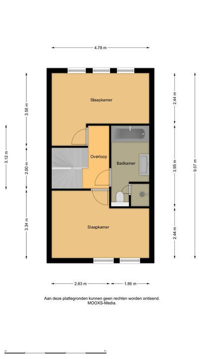Via de vaste trap bereik je de overloop op de eerste verdieping, die toegang biedt tot twee slaapkamers en de badkamer.