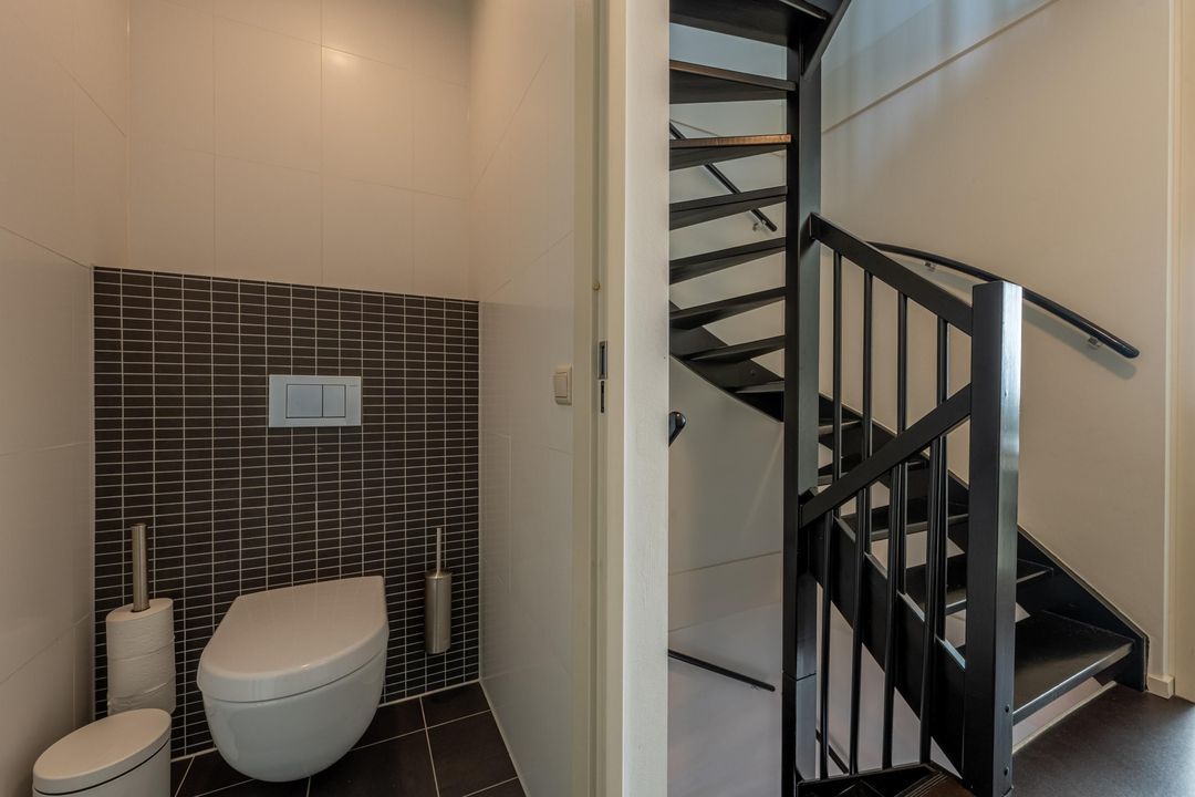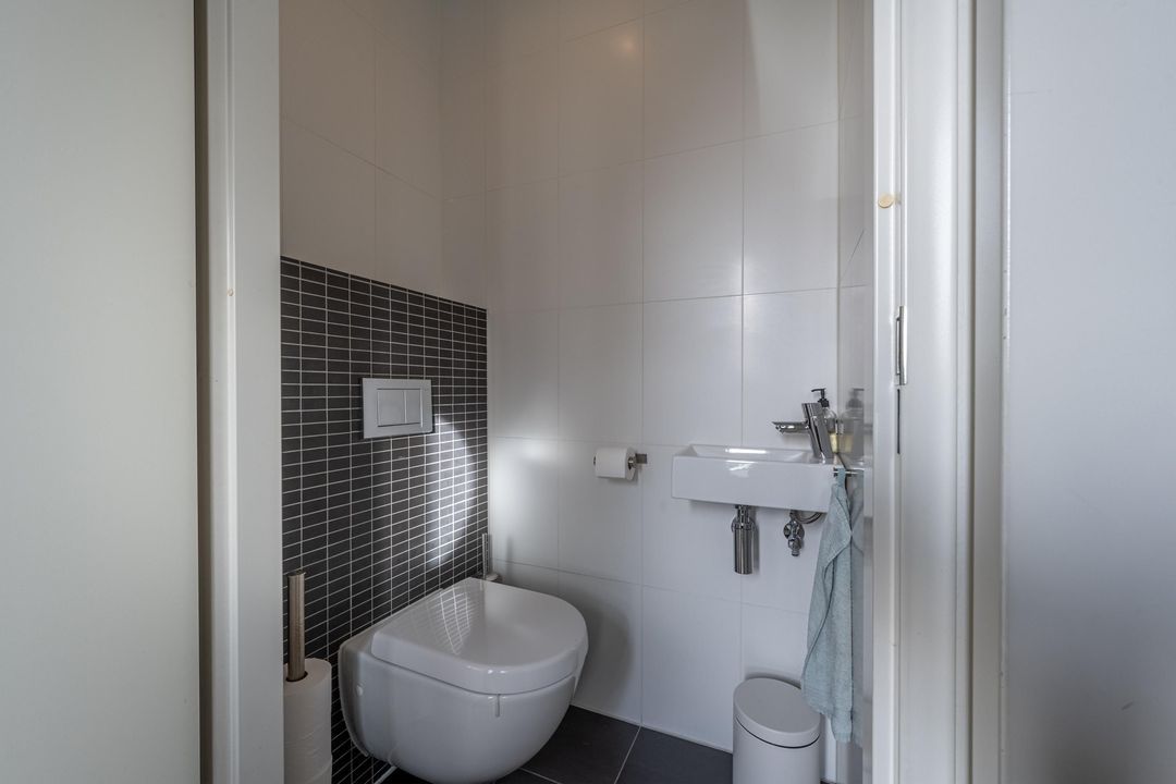 Daarnaast bevindt zich op de overloop een separaat toilet, uitgevoerd in dezelfde nette stijl als het toilet op de begane grond — strak, tijdloos en praktisch.
