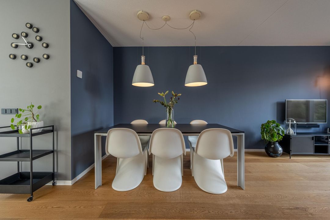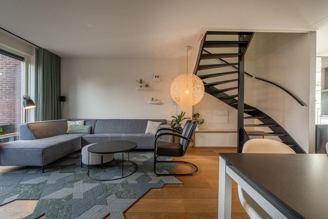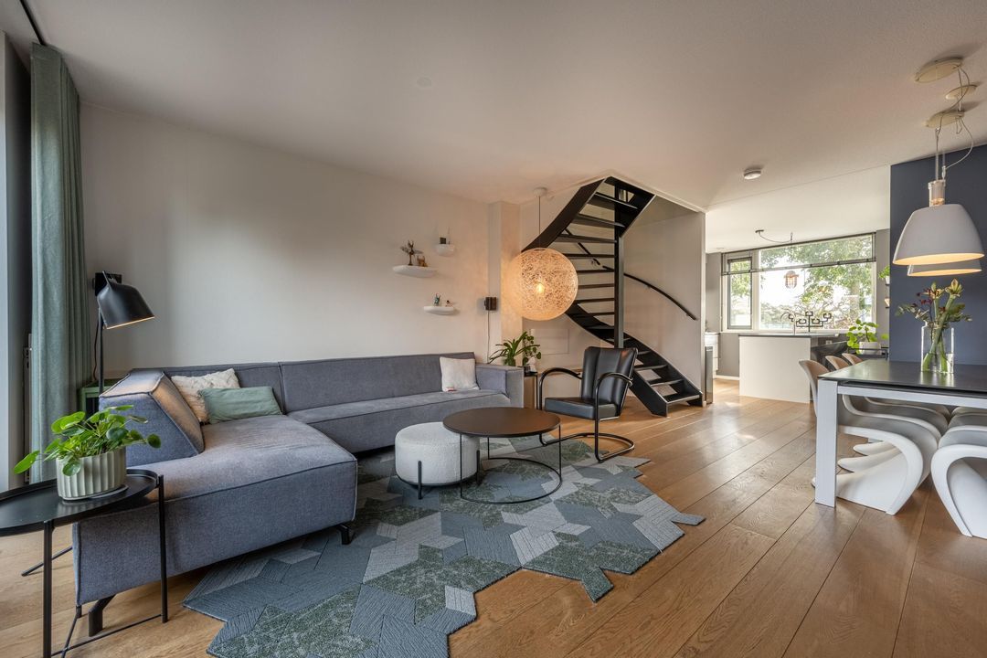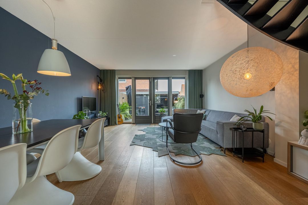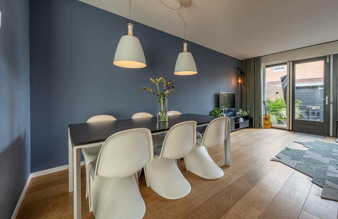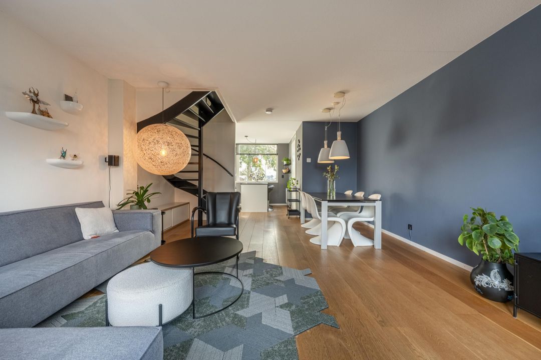 Vanuit de hal stap je de ruime woonkamer binnen, waar de grote raampartijen zorgen voor veel daglicht en een fijn ruimtelijk gevoel. De openslaande deuren met handige horren bieden direct toegang tot de tuin. De woonkamer biedt volop mogelijkheden voor een royale zithoek en een gezellige eettafel, en onder de trap is extra bergruimte aanwezig. De gehele begane grond is voorzien van een eiken lamelparketvloer.