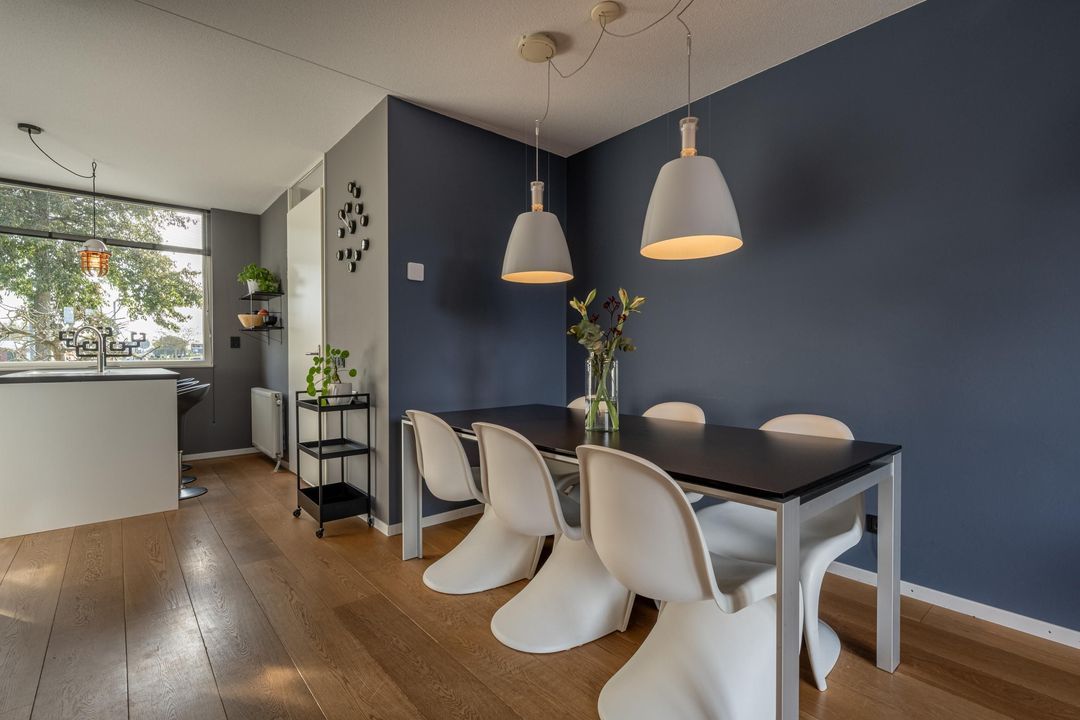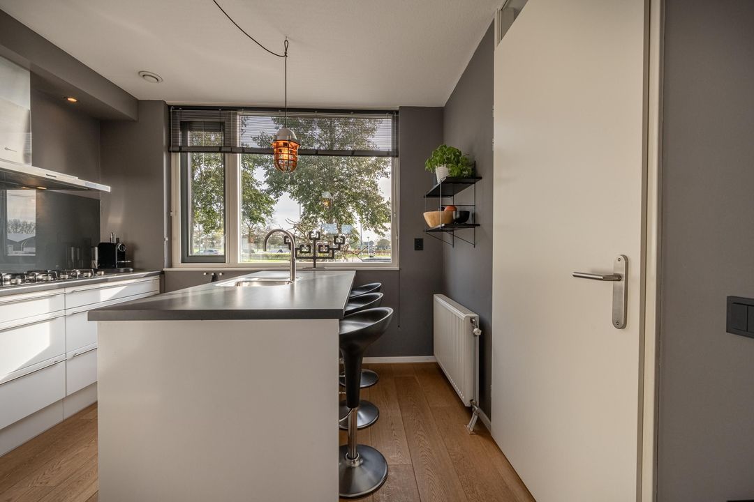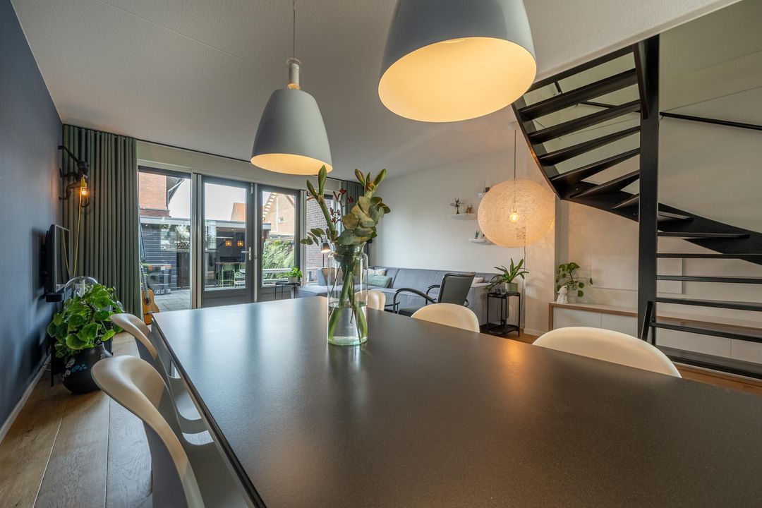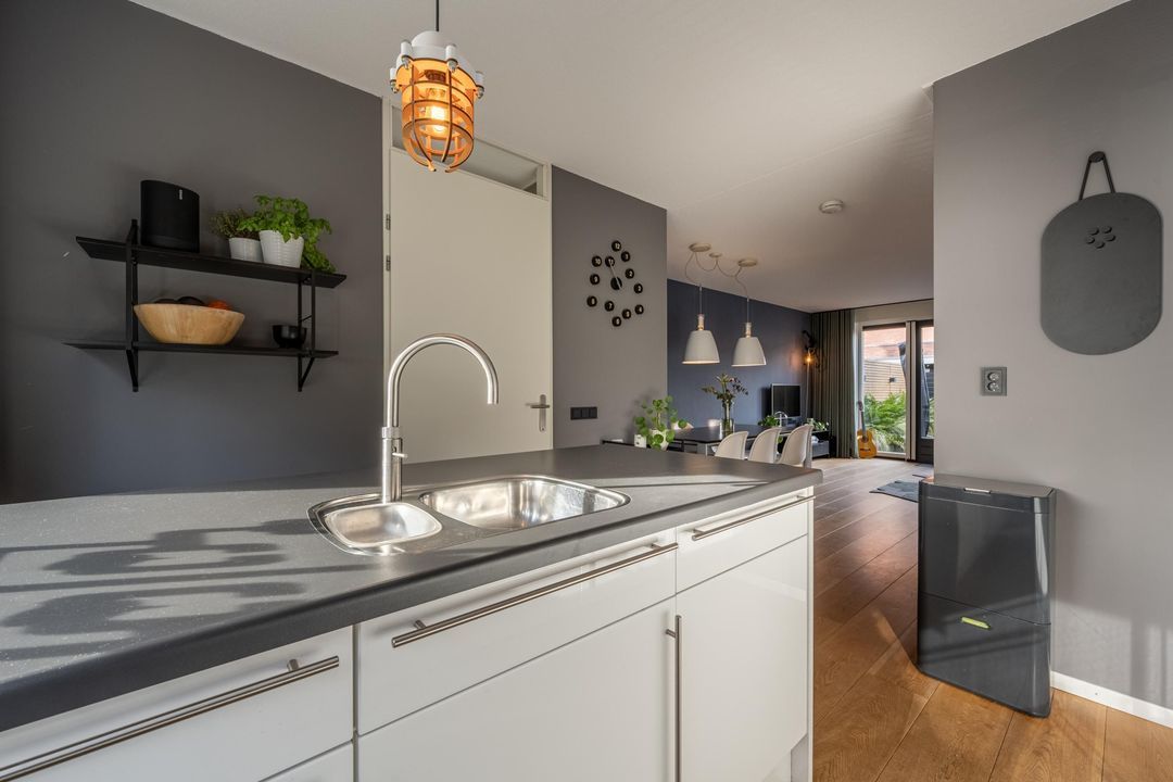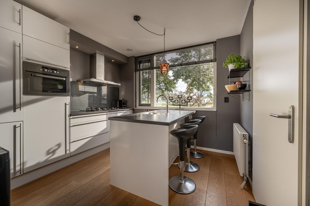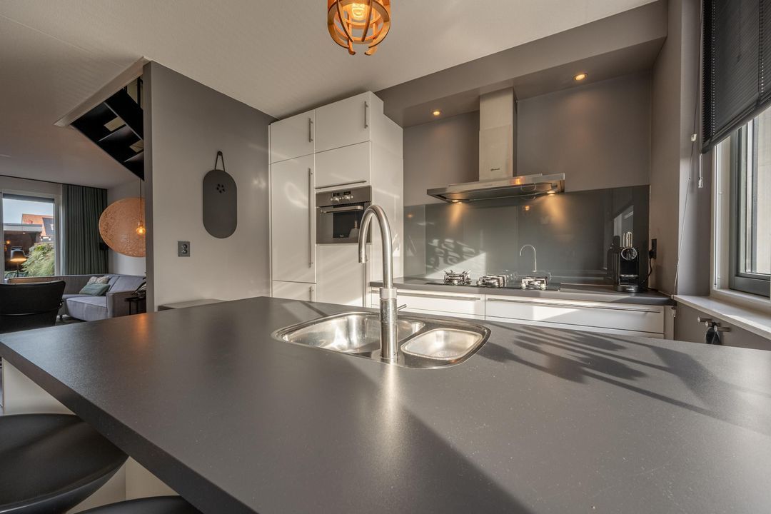 De keuken aan de voorzijde is een echte blikvanger. Dankzij de grote ramen geniet je van veel licht en een vrij uitzicht. Het strakke ontwerp met witte kasten en een robuust antraciet HPL-werkblad zorgt voor een moderne uitstraling. De keuken is ingericht met een spoeleiland met plaats voor barkrukken, ideaal voor gezellige momenten tijdens het koken. Daarnaast vind je hier alle gewenste inbouwapparatuur: een koelkast met aparte vriezer, een 4-pits gaskookplaat met extra wokbrander, een combi-oven en voldoende werk- en opbergruimte.