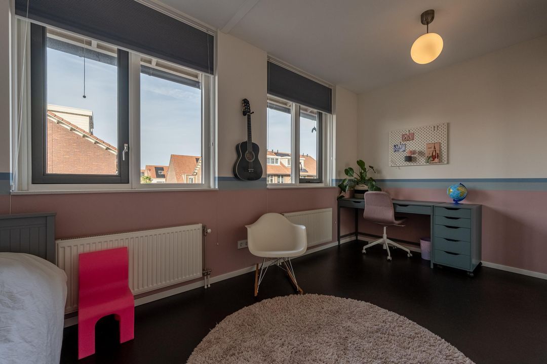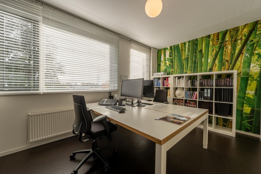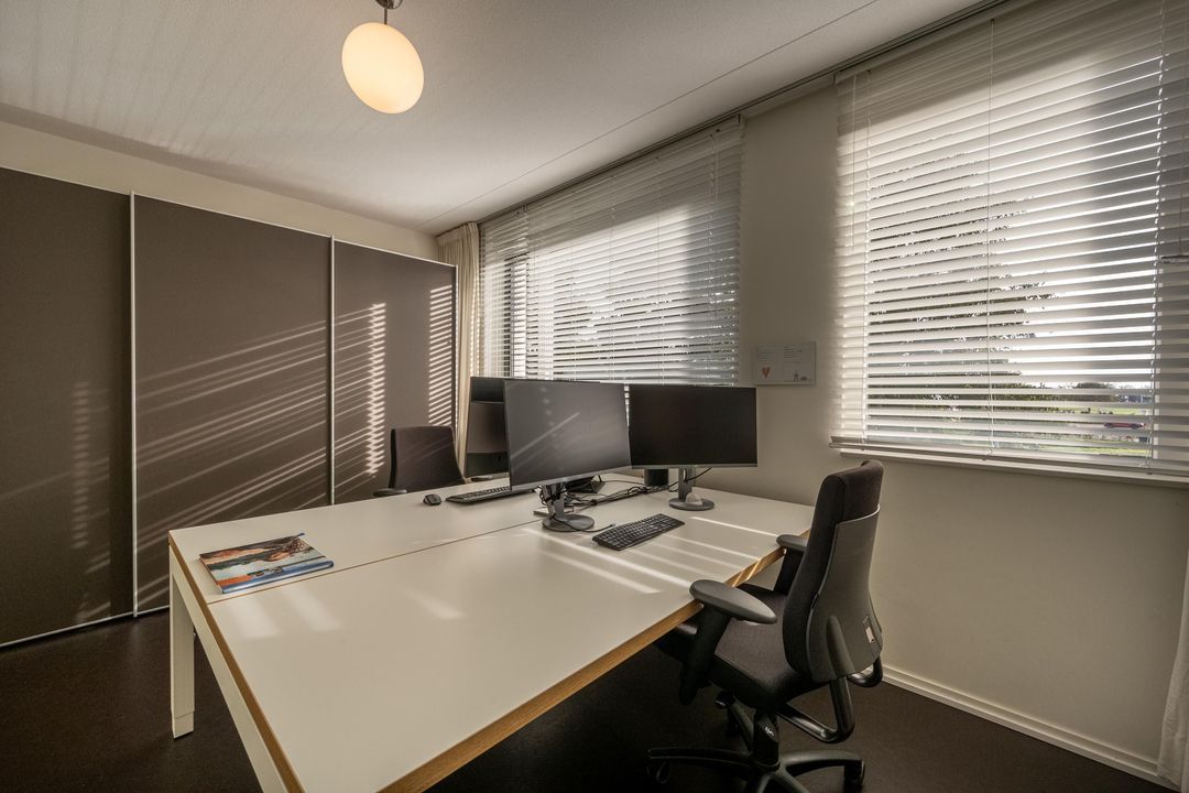 Aan de voorzijde bevindt zich de royale masterbedroom, die momenteel in gebruik is als thuiswerkruimte. Dankzij de grote raampartij met horren is de kamer heerlijk licht en goed te ventileren. De ruimte is groot genoeg voor een tweepersoonsbed, kledingkast of bureau en biedt volop flexibiliteit in gebruik.
