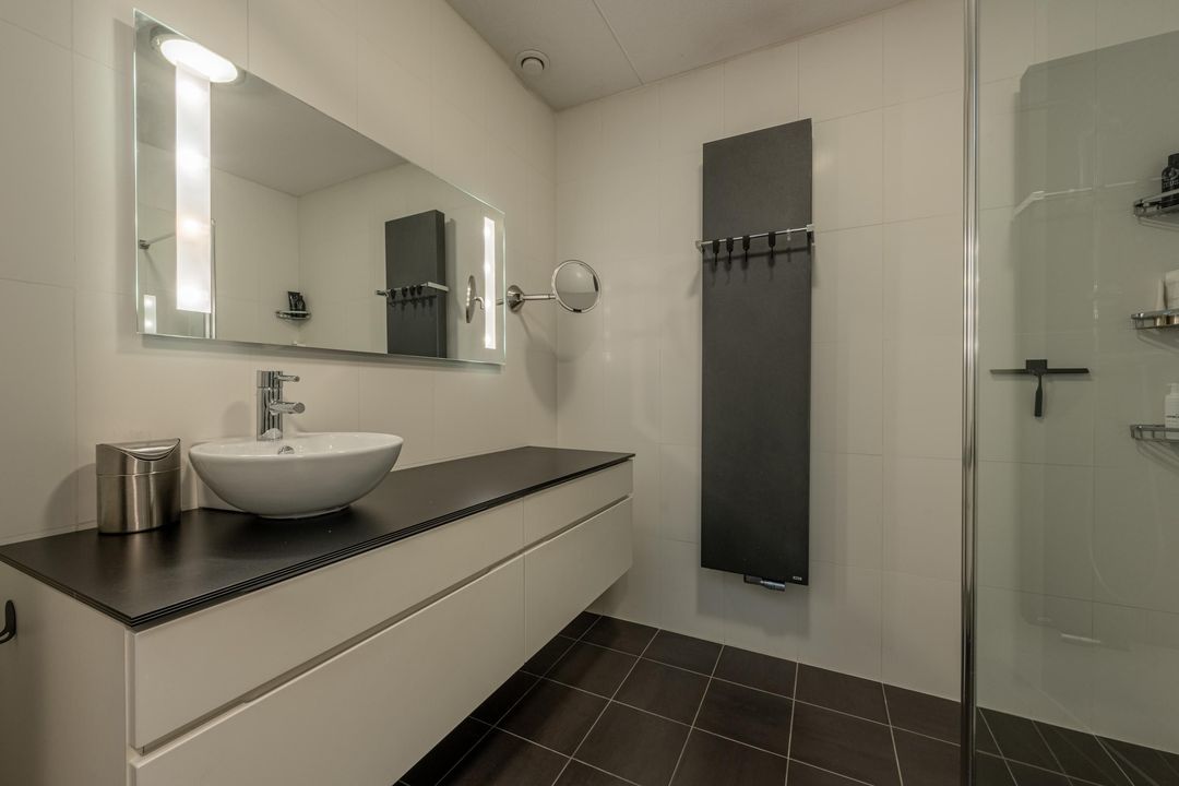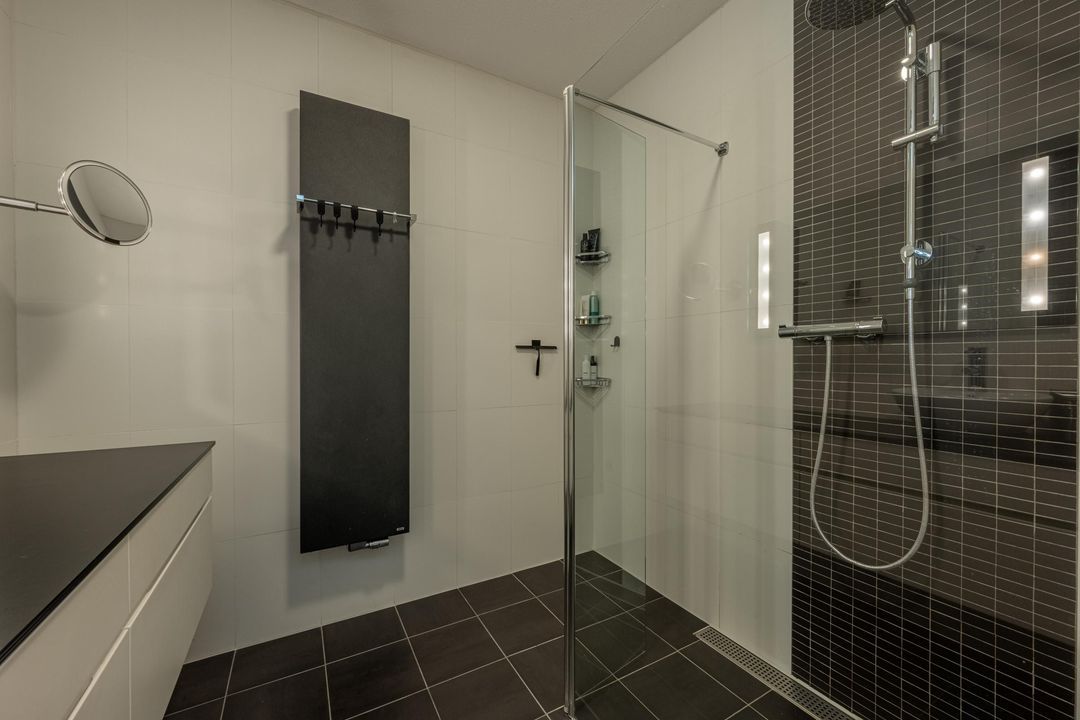 De badkamer is modern en stijlvol ingericht met grijs-witte tegels en voorzien van een inloopdouche met regendouche, grote wastafel met spiegelverwarming en mechanische ventilatie.
