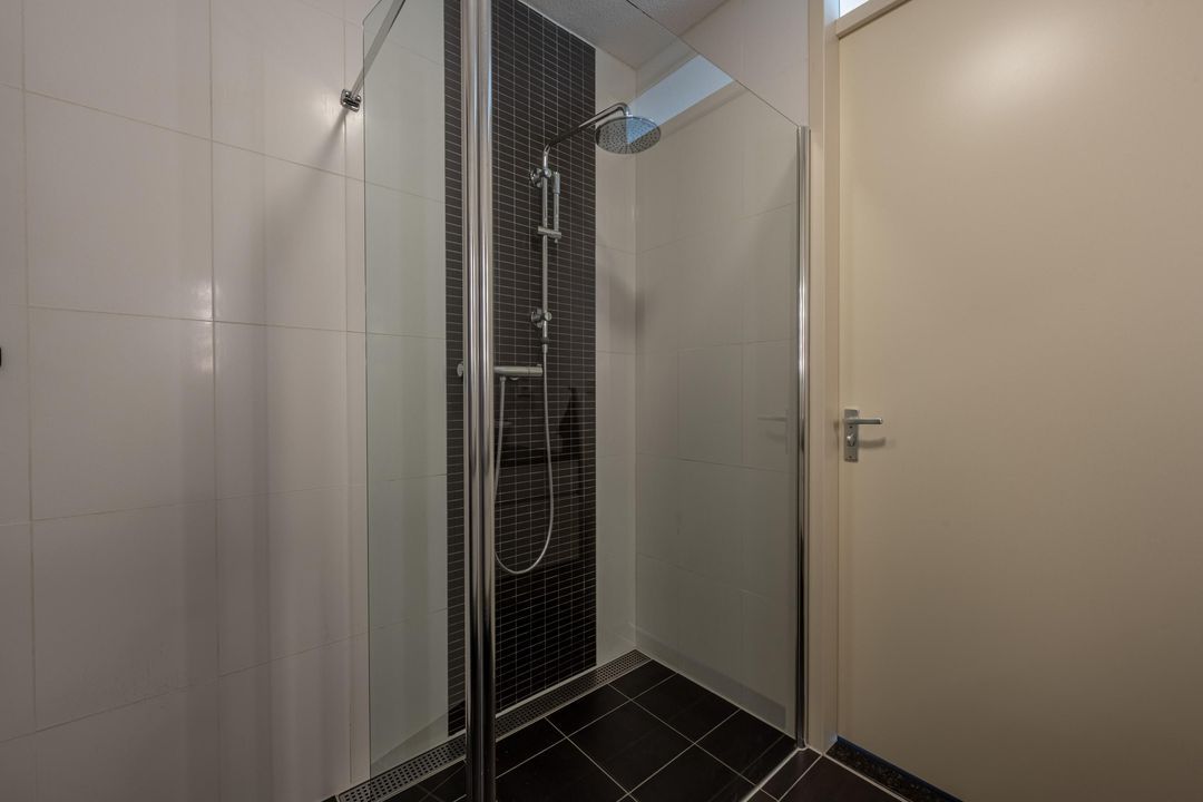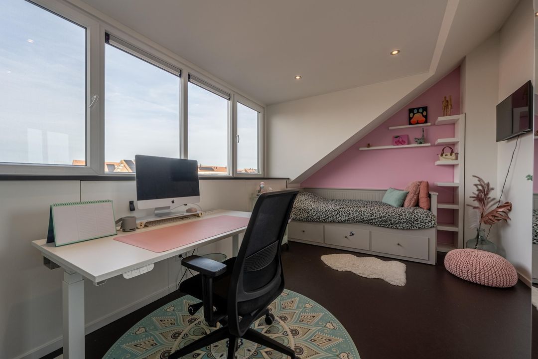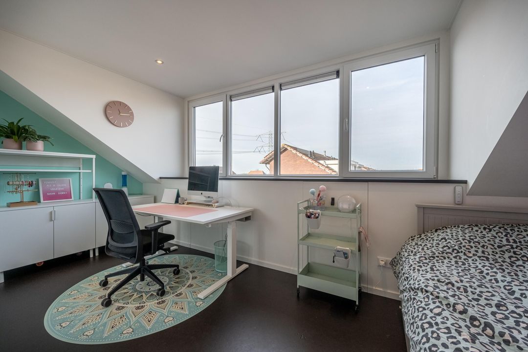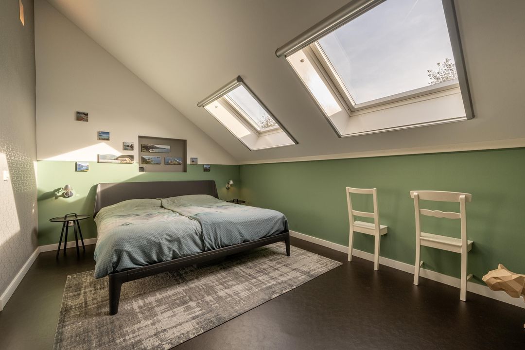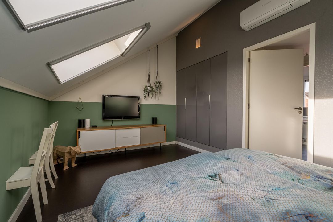 De eerste slaapkamer is voorzien van twee dakramen met horren waarvan een elektrisch die automatisch sluiten bij regen of harde wind — ideaal voor extra comfort. Dankzij het hoge plafond voelt deze kamer bijzonder ruim aan. Verder zijn er stijlvolle dimbare inbouwspots, een praktische ingebouwde kast en een airco-installatie die zowel kan koelen als verwarmen.