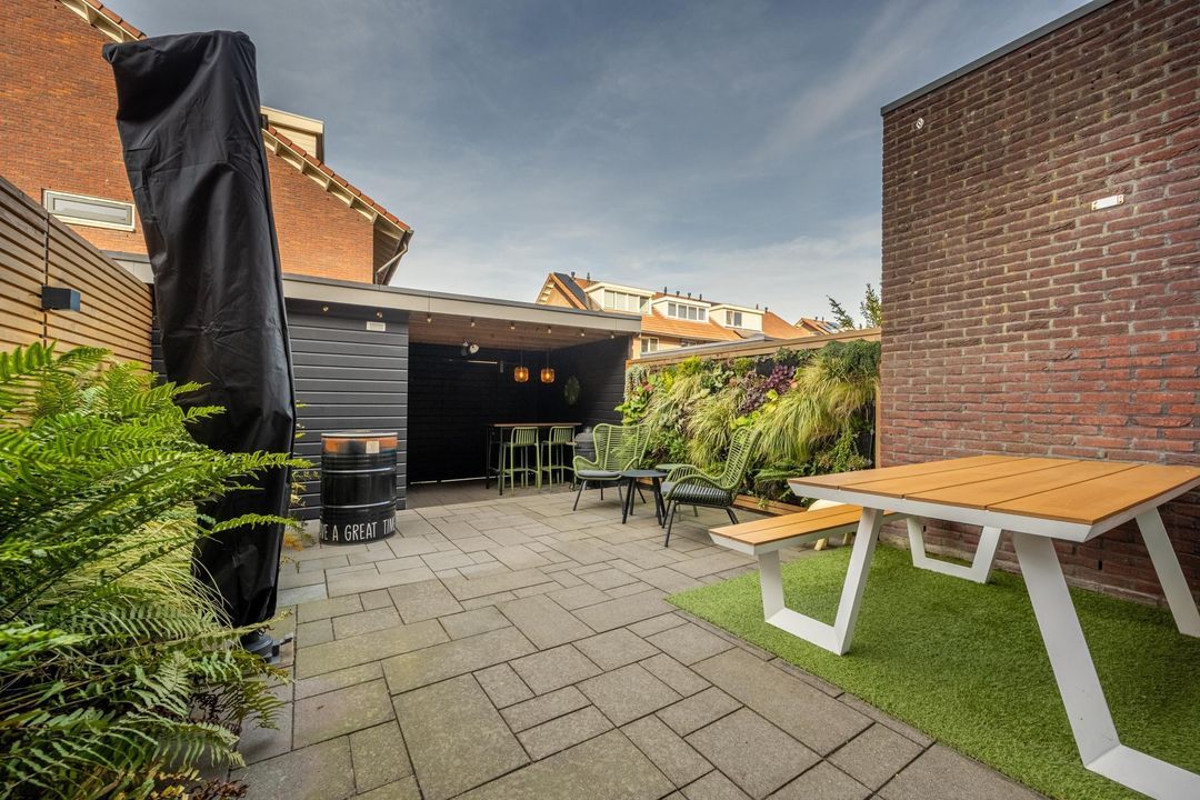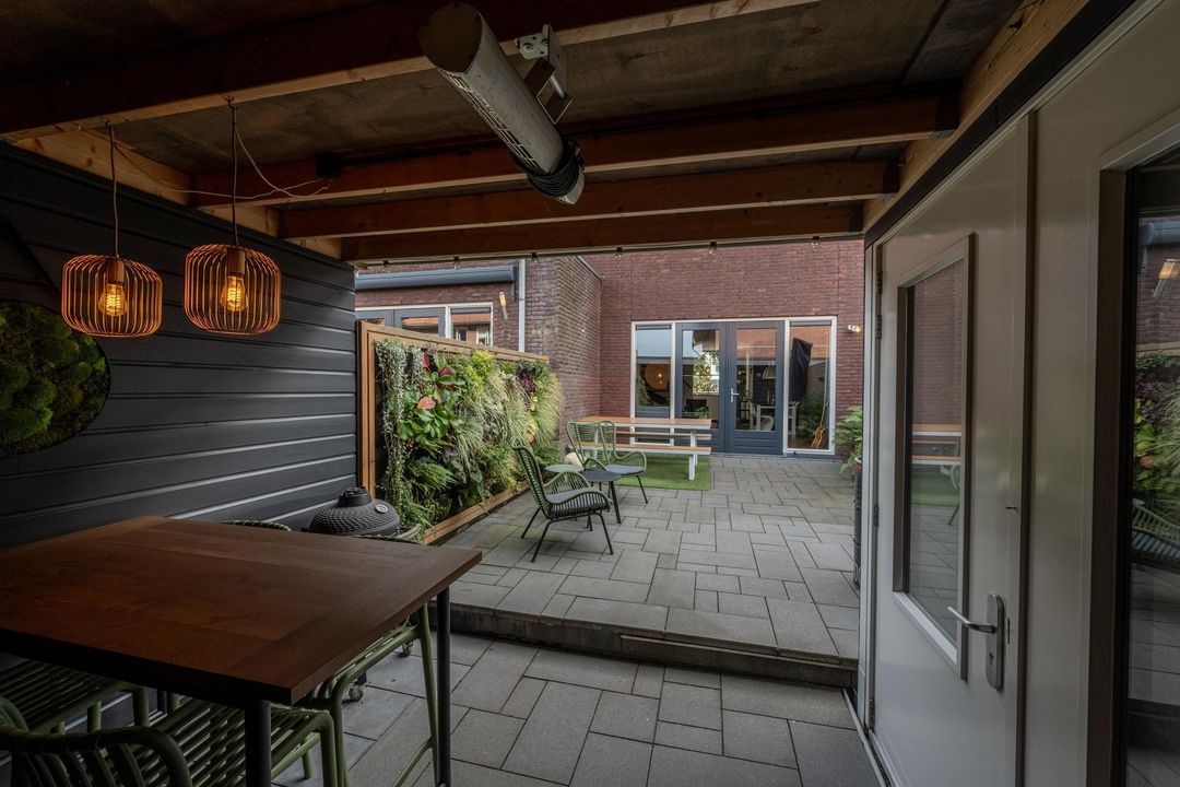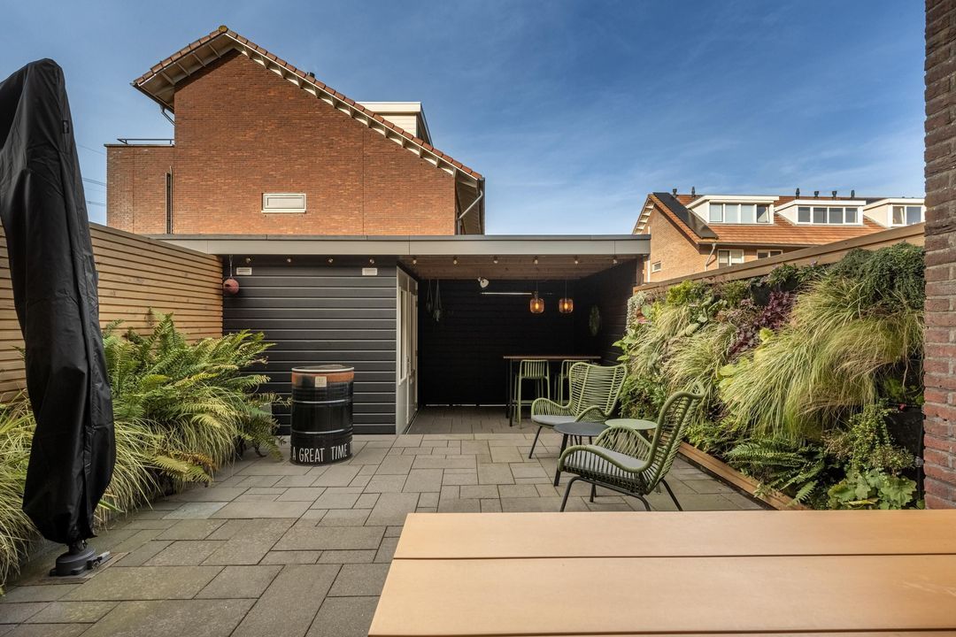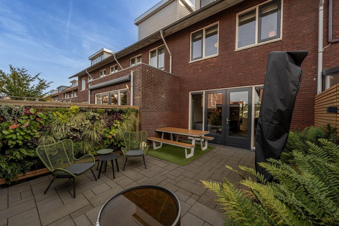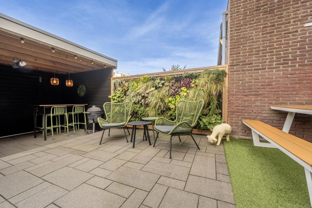 De tuin is fraai en onderhoudsvriendelijk aangelegd, met een combinatie van tegels en groene beplanting langs de zijkanten. Een echte blikvanger is de groene muur met automatisch watergeefsysteem, waardoor de tuin altijd fris en verzorgd oogt zonder dat het veel onderhoud vraagt.