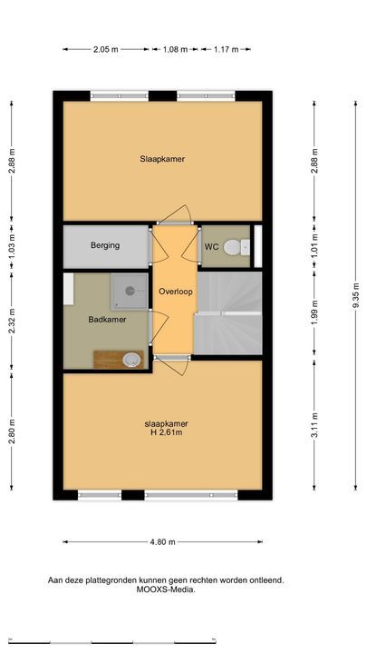 Aan de achterzijde ligt slaapkamer twee, eveneens voorzien van ramen met horren. Op de overloop bevindt zich een handige bergkast, ideaal voor linnengoed, koffers of andere spullen die je graag uit het zicht wilt opbergen.