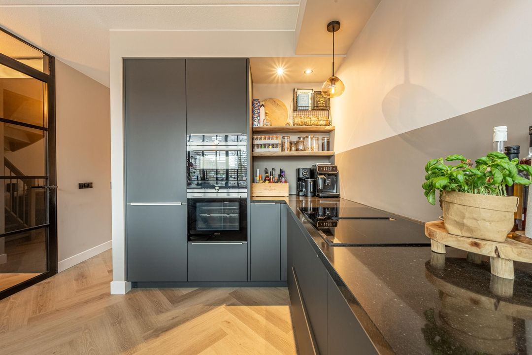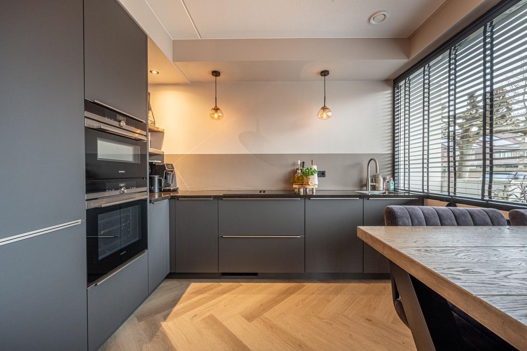De keuken is gelegen aan de voorzijde van de woning en is modern en strak uitgevoerd. Dankzij ramen aan meerdere zijden is er een aangename lichtinval. De antracietgrijze keukenfronten geven de keuken een eigentijdse uitstraling, terwijl de indeling en apparatuur zorgen voor gebruiksgemak. De keuken beschikt over twee Siemens ovens, waaronder een combi-oven en een reguliere oven, een inductiekookplaat met geïntegreerd Bosch recirculatie afzuigsysteem, een koel-vriescombinatie en een Quooker. Mechanische ventilatie zorgt voor een comfortabel binnenklimaat.