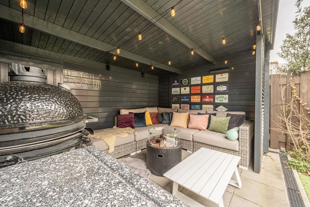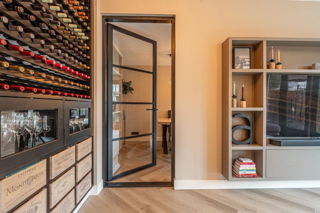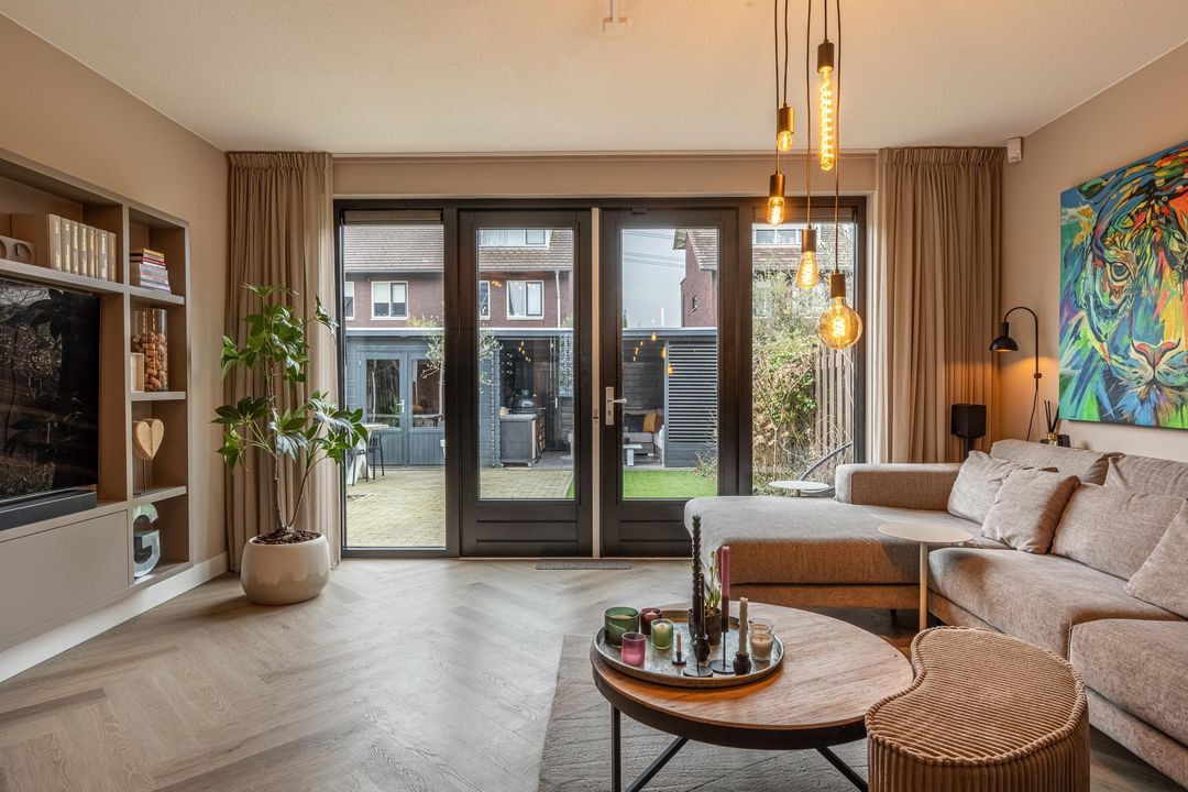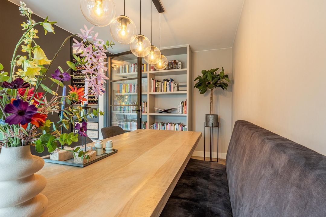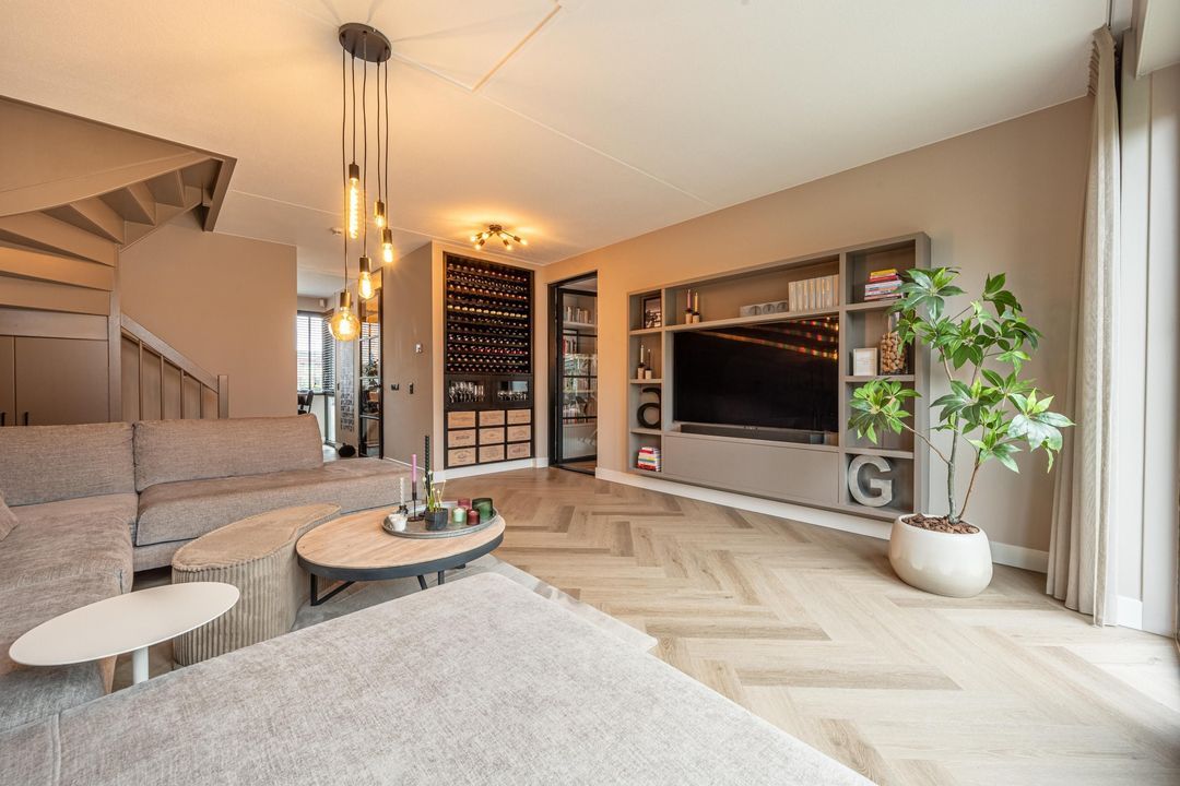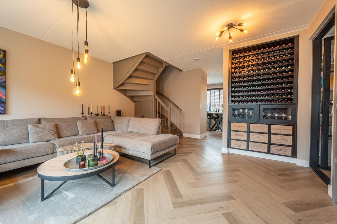 De woonkamer is gesitueerd aan de achterzijde en is ruim van opzet. Er is volop plaats voor een royale zithoek en door de indeling voelt de ruimte open en uitnodigend aan. De gecreëerde wijnhoek is een sfeervol detail en vormt een subtiele eyecatcher binnen het geheel.