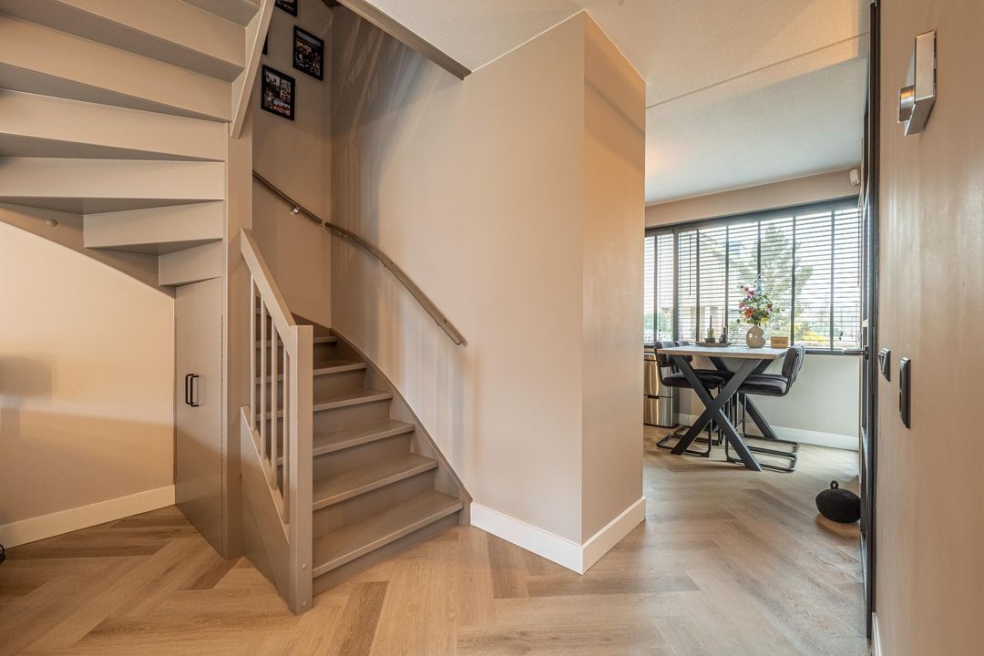Op de begane grond ligt een klik-PVC vloer in visgraatmotief, uitgevoerd in een warme, naturelle houtkleur. Deze vloer vormt een rustige basis en versterkt de samenhang tussen de verschillende leefruimtes. De wanden zijn strak afgewerkt en de woning beschikt op de begane grond over vloerverwarming, wat bijdraagt aan het dagelijkse comfort.
