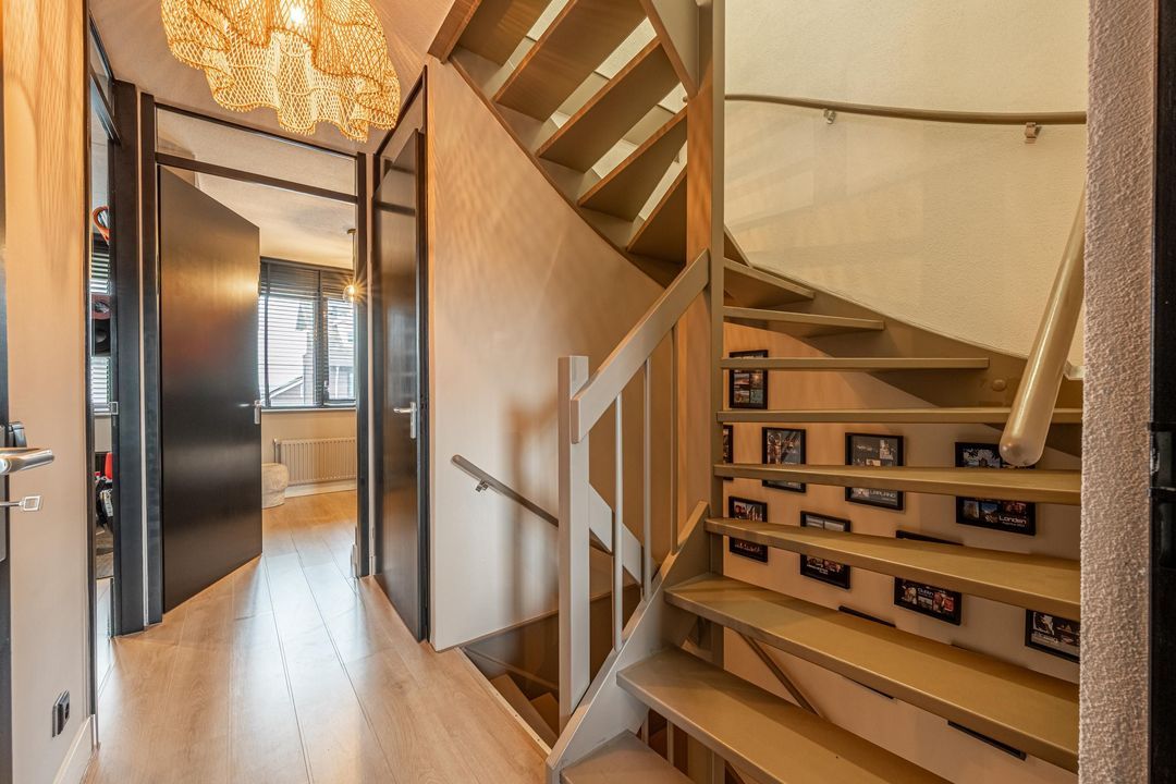 Vanuit de woonkamer is de vaste trap naar de eerste verdieping bereikbaar. Op de eerste verdieping ligt een doorlopende laminaatvloer, met uitzondering van het toilet en de badkamer. Aan de achterzijde bevinden zich twee slaapkamers, beide strak afgewerkt en voorzien van elektrische rolluiken. Deze kamers lenen zich uitstekend voor gebruik als kinder-, werk- of hobbykamer.
