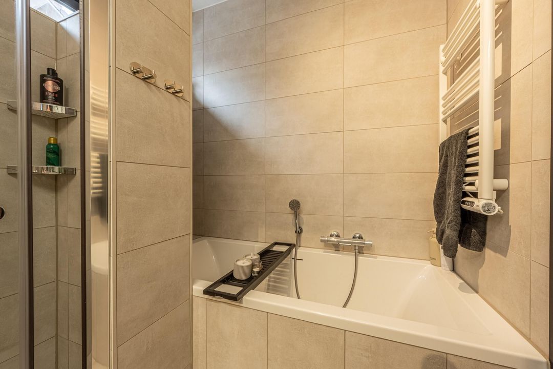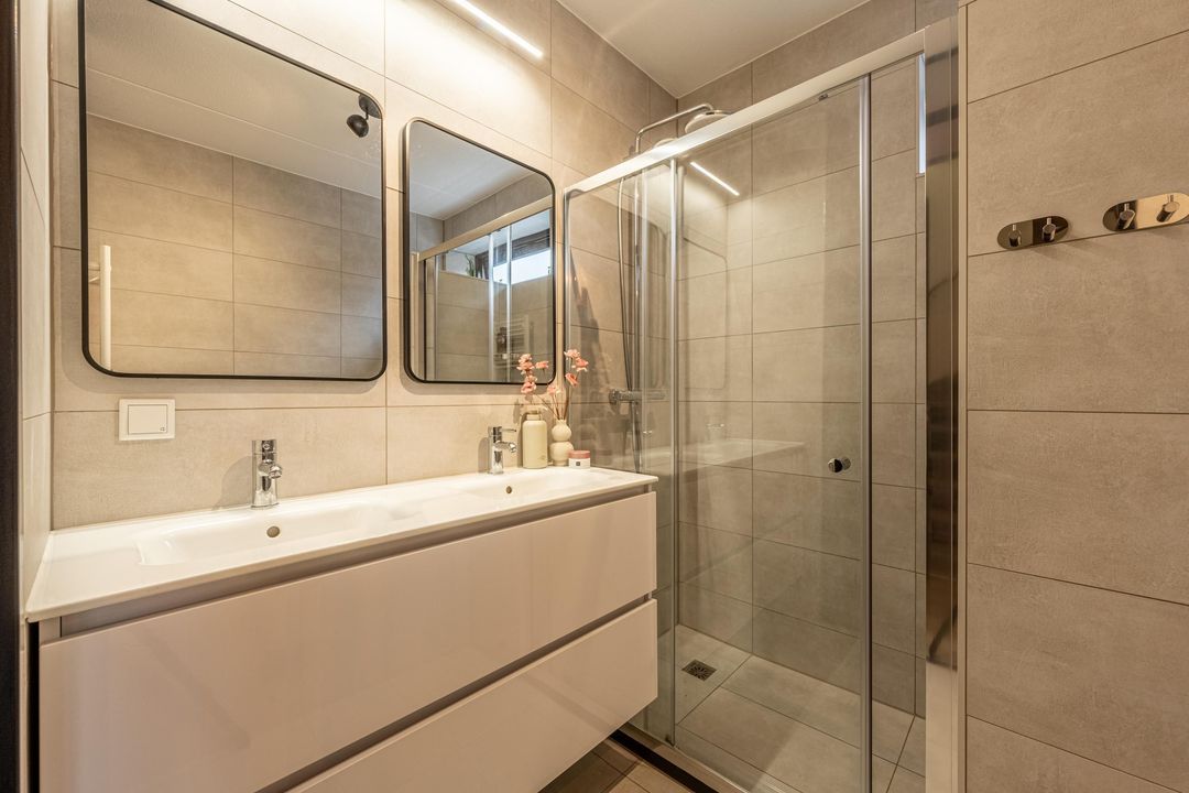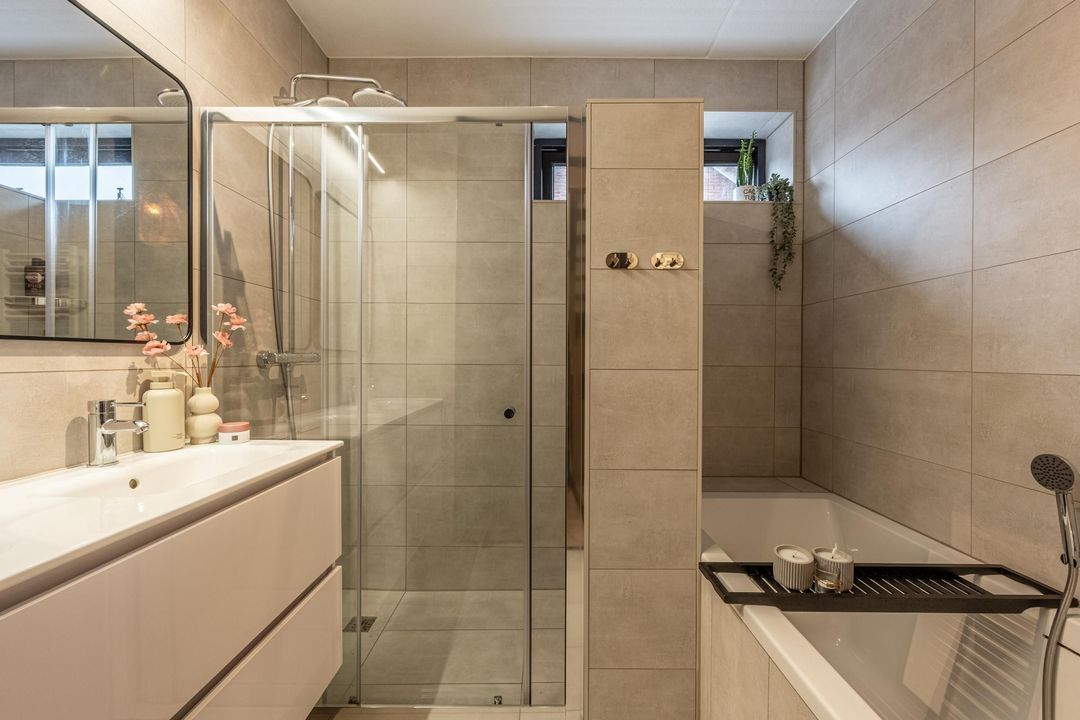 De badkamer is ruim opgezet en zorgvuldig afgewerkt. Lichtgrijze vloer- en wandtegels zorgen voor een rustige en moderne uitstraling. De ruimte is voorzien van een dubbele wastafel met wit meubel, een ligbad en een ruime inloopdouche met regendouche. Een designradiator, mechanische ventilatie en een raam voor natuurlijke ventilatie maken de badkamer compleet en comfortabel in gebruik.
