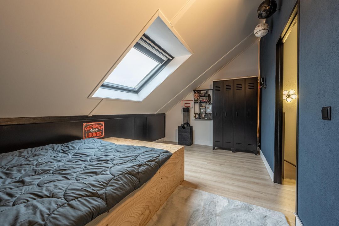 Via de vaste trap is de zolderverdieping bereikbaar. Hier zijn twee volwaardige slaapkamers gerealiseerd, evenals een aparte wasruimte met aansluitingen voor wasmachine en droger, de mechanische ventilatiebox, de omvormer van de zonnepanelen en de cv-installatie. De cv-ketel is een Remeha uit 2025.
