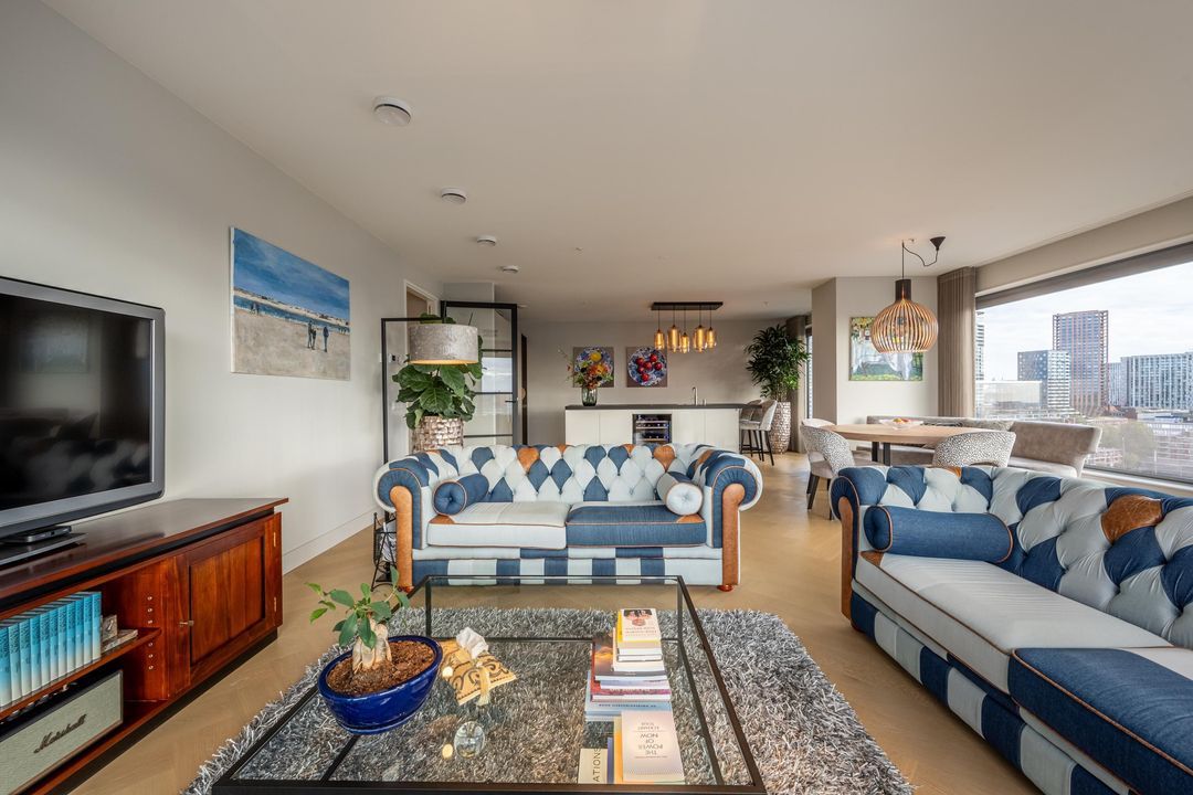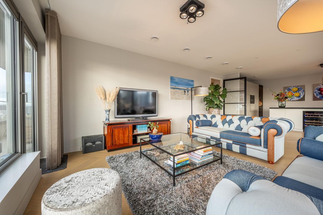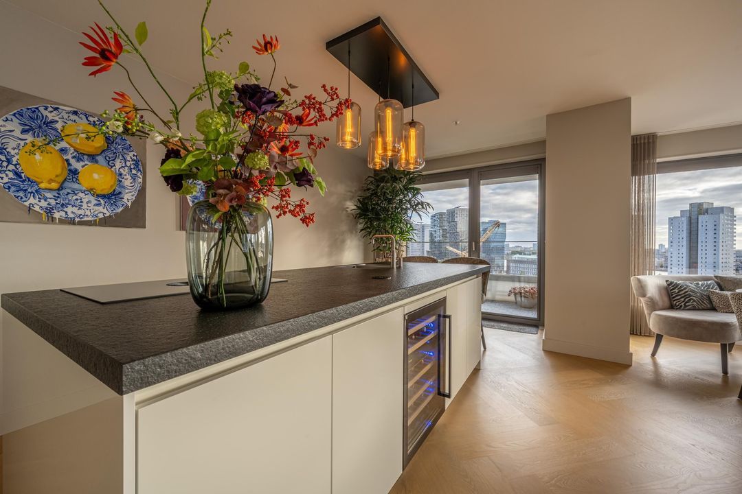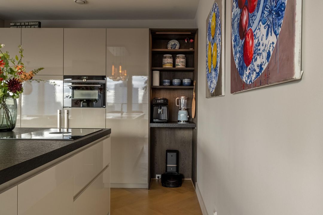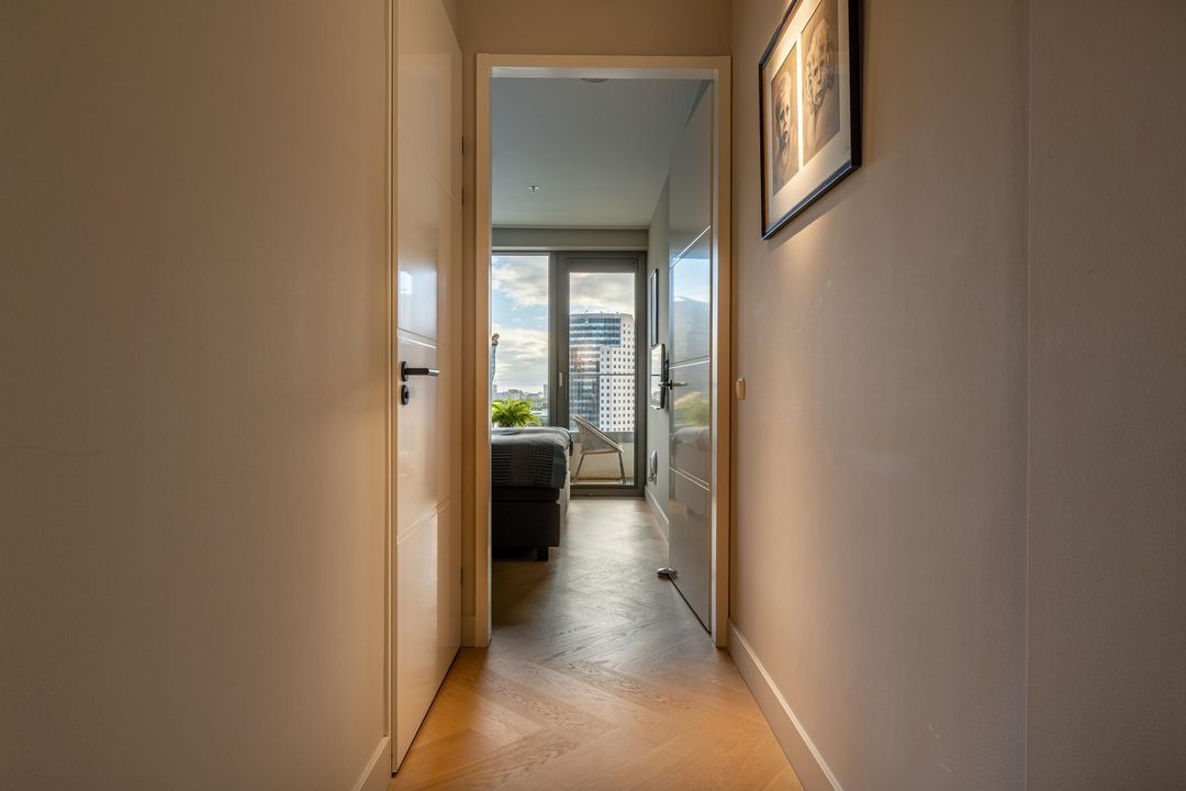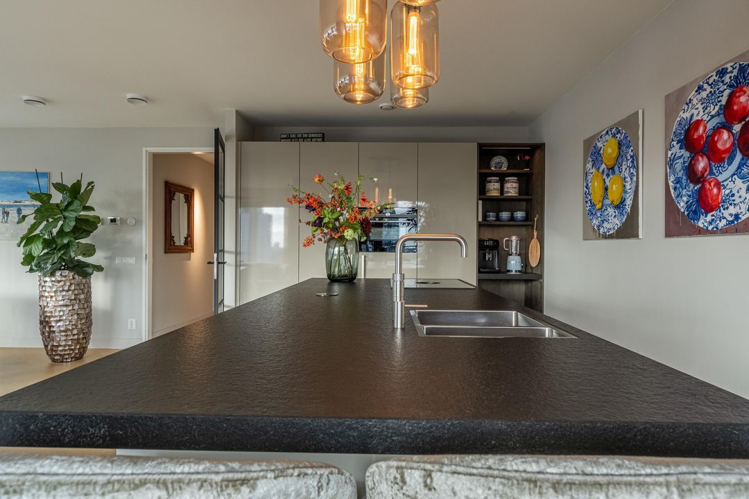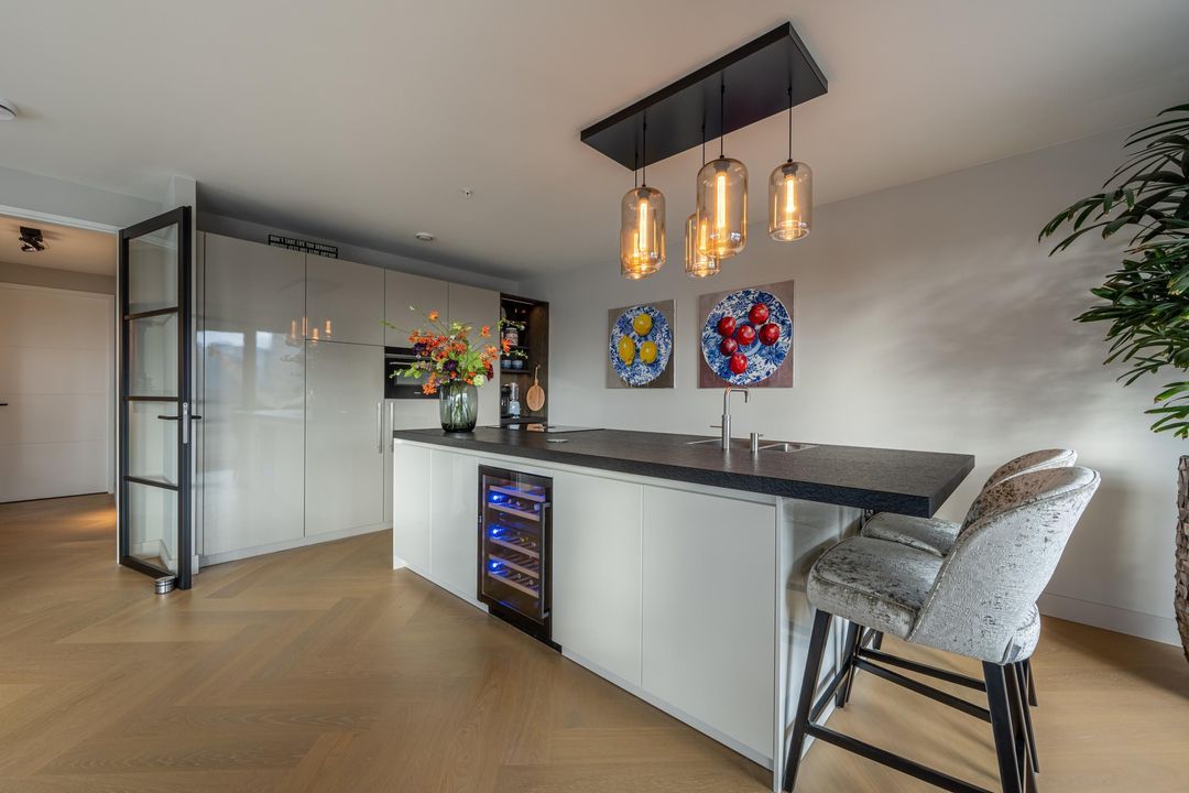 Entree van de woning met garderobe, videofoonsysteem, toilet en gang met toegang tot alle vertrekken. De royale living is door de grote raampartijen heerlijk licht en biedt van ’s ochtends vroeg tot ’s avonds laat spectaculaire uitzichten. Hier bevindt zich ook de open keuken, uitgevoerd met een kastenwand en kookeiland en ingericht met alle benodigde inbouwapparatuur, waaronder een 4-pits keramische kookplaat met Bora-afzuiging, koelkast, vriezer, combi-oven, vaatwasser, Quooker en wijnklimaatkast. Vanuit de woonkamer en keuken is toegang tot de twee ruime balkons.