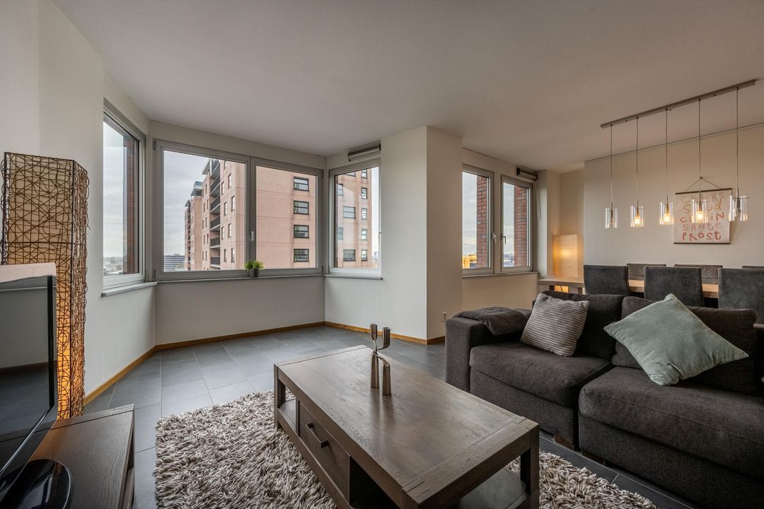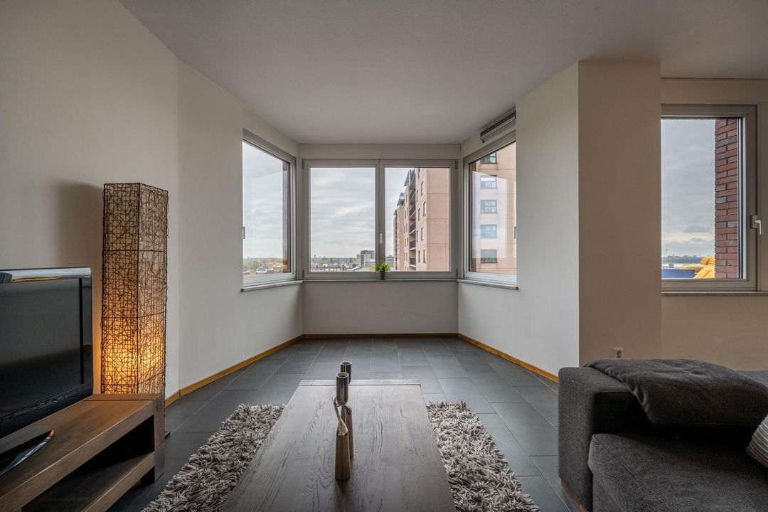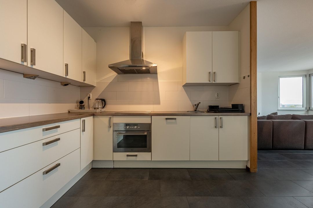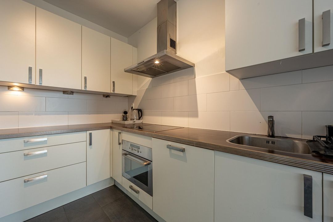De open keuken sluit naadloos aan op de woonkamer en is uitgevoerd in een praktische L-opstelling. De strakke witte fronten en roestvrijstalen accenten, passen perfect bij het karakter van het appartement.