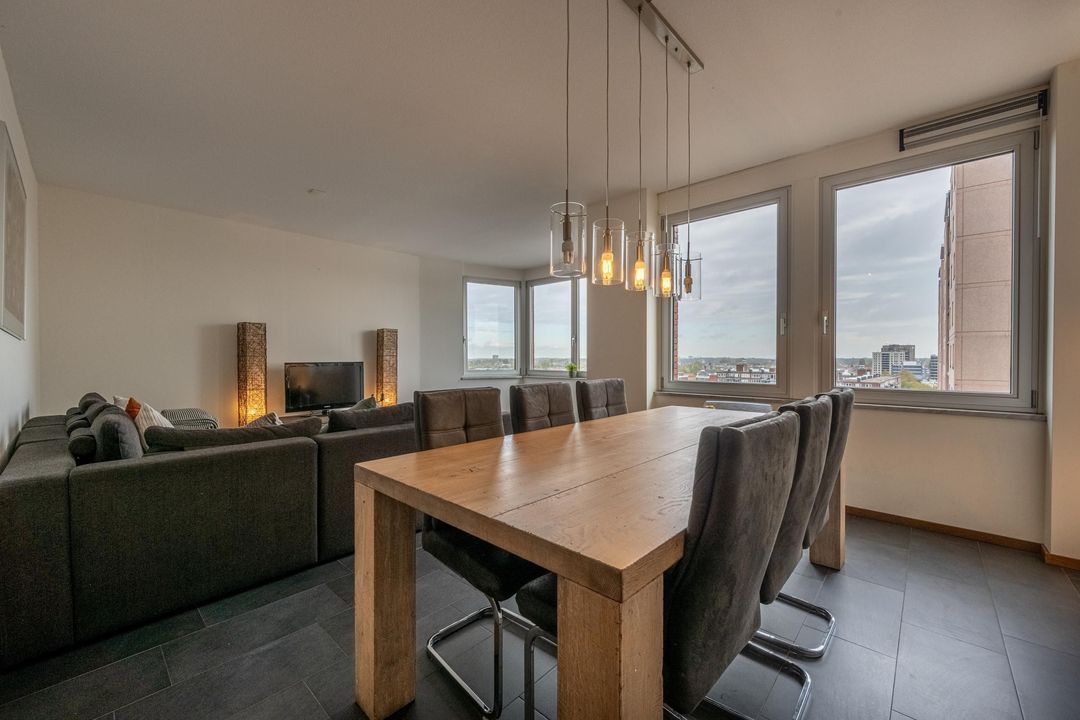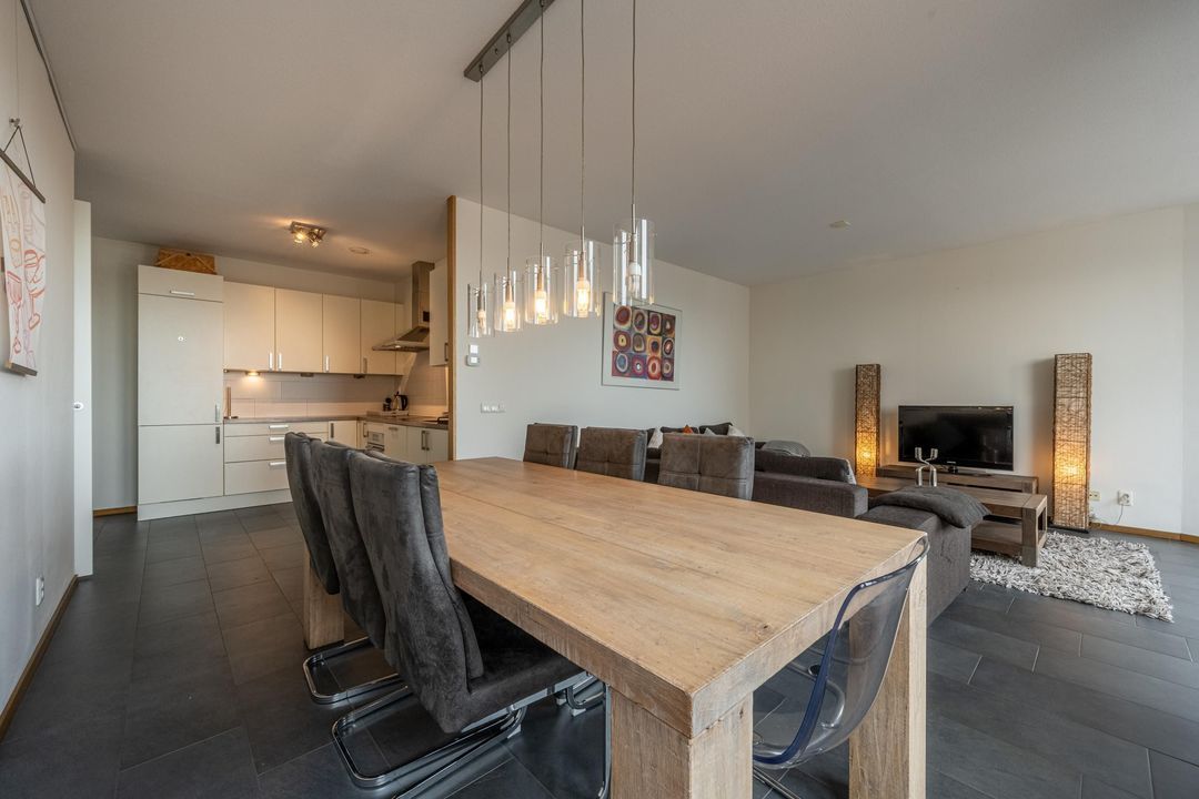 De plavuizen vloer met vloerverwarming en -koeling wat in de warme zomermaanden echt een uitkomst is. De vloer vormt een stijlvolle basis die warmte en comfort uitstraalt. De inrichting voelt ruim en uitnodigend; een plek waar je moeiteloos een gezellige zithoek en royale eethoek kunt creëren. De grote houten tafel met de sfeervolle verlichting erboven benadrukt de huiselijke sfeer – perfect voor lange avonden tafelen terwijl de stad beneden langzaam tot rust komt.