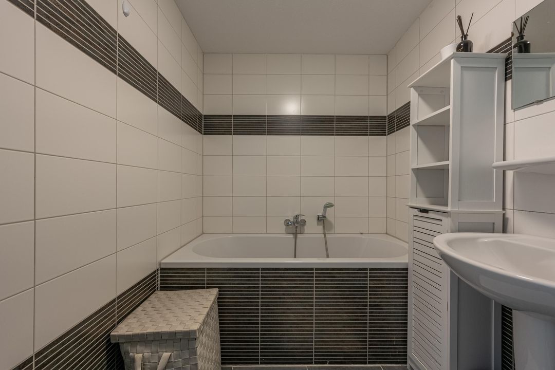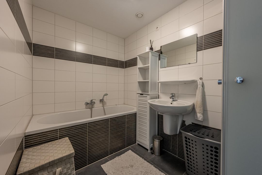 De badkamer heeft een moderne, verzorgde uitstraling met strakke wit- en grijstinten. De ruimte is royaal opgezet en compleet ingericht met een ligbad, douchecabine, wasbak met kraan en een designradiator. De tegels en afwerking geven de ruimte een frisse, eigentijdse look waarin het prettig ontspannen is.